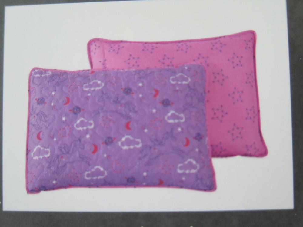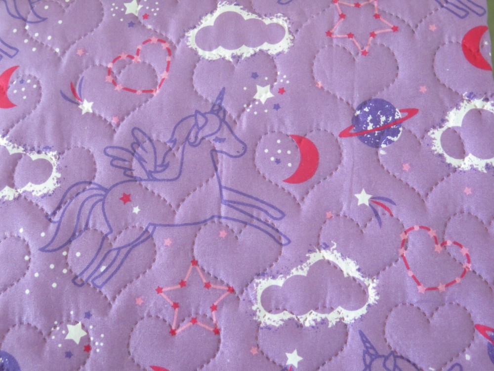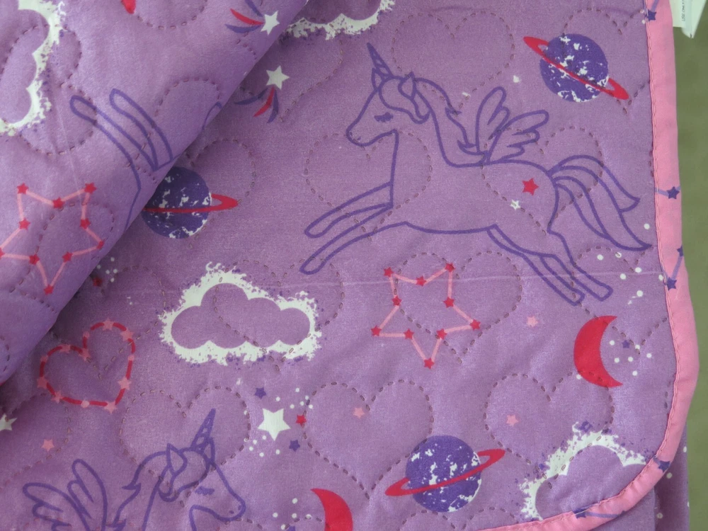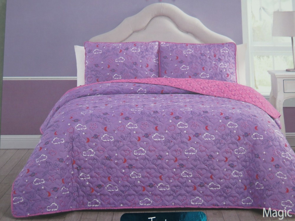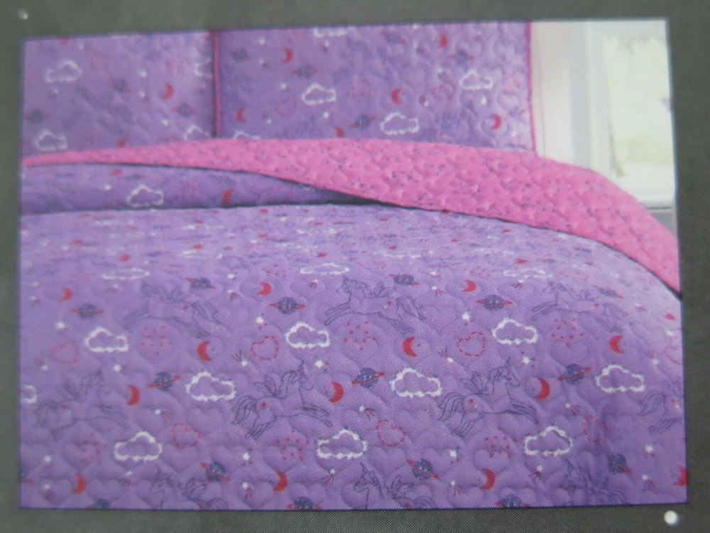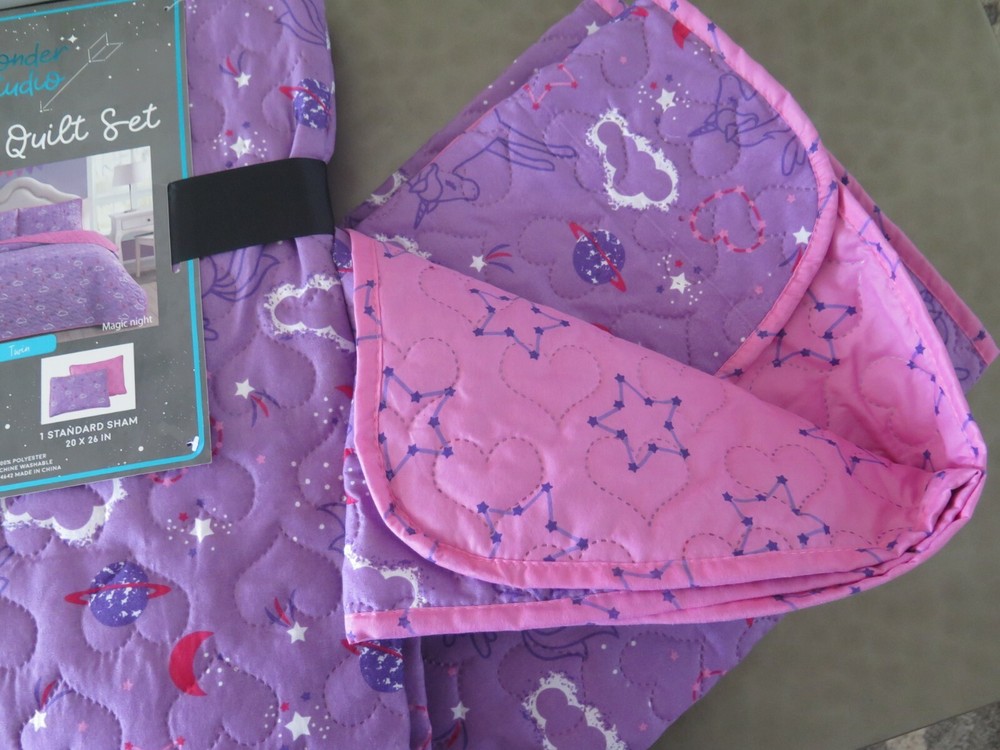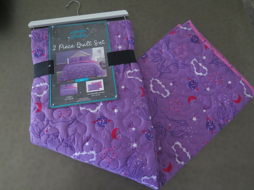 Wonder Studio "Magic Night" Unicorn Purple and Pink 2 piece Twin Bed Quilt Set Set Includes: 1 - Twin Bed Size Quilted Bedspread 63" x 86" (Inches) 1 - Standard Pillow Sham 20" x 26" (Inches) Material: 100% Polyester Colors: Purple, Pink, Red, White Theme: "Magic Night" Quilted Heart Pattern Cute Rendition of Unicorns Flying in the Night Sky with Clouds, Stars, Moons, Planets, and Hearts in the Background On the Reverse Side is Solid Pink with Purple Outlined Stars From A Smoke and Pet Free Environment