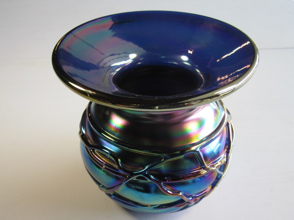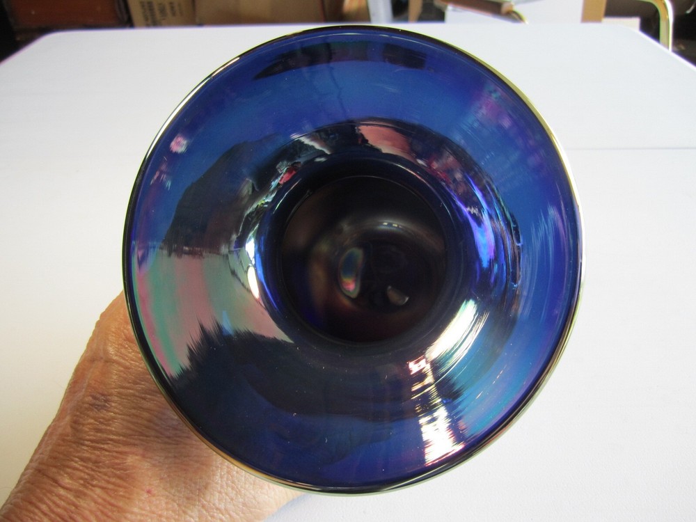 Wonderful Gibson glass studio heavy blue iridescent spittoon shaped modern carnival glass vase. No chips or cracks. It weighs 3 pounds and is 5" high and 5.5" across the top. Gorgeous specimen!!!...