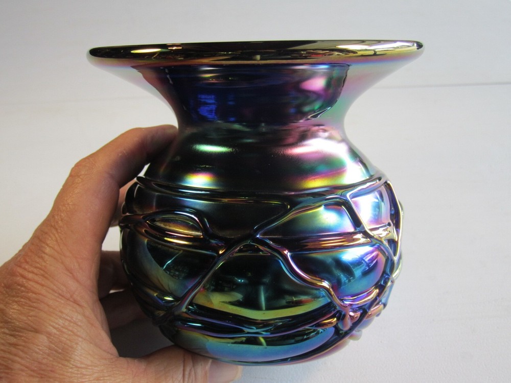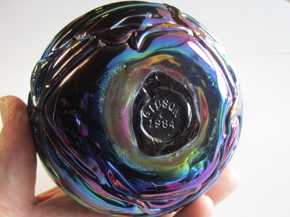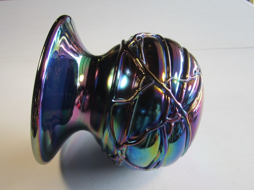 Wonderful Gibson glass studio heavy blue iridescent spittoon shaped modern carnival glass vase. No chips or cracks. It weighs 3 pounds and is 5" high and 5.5" across the top. Gorgeous specimen!!!