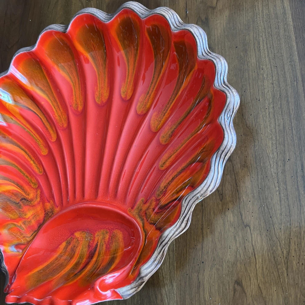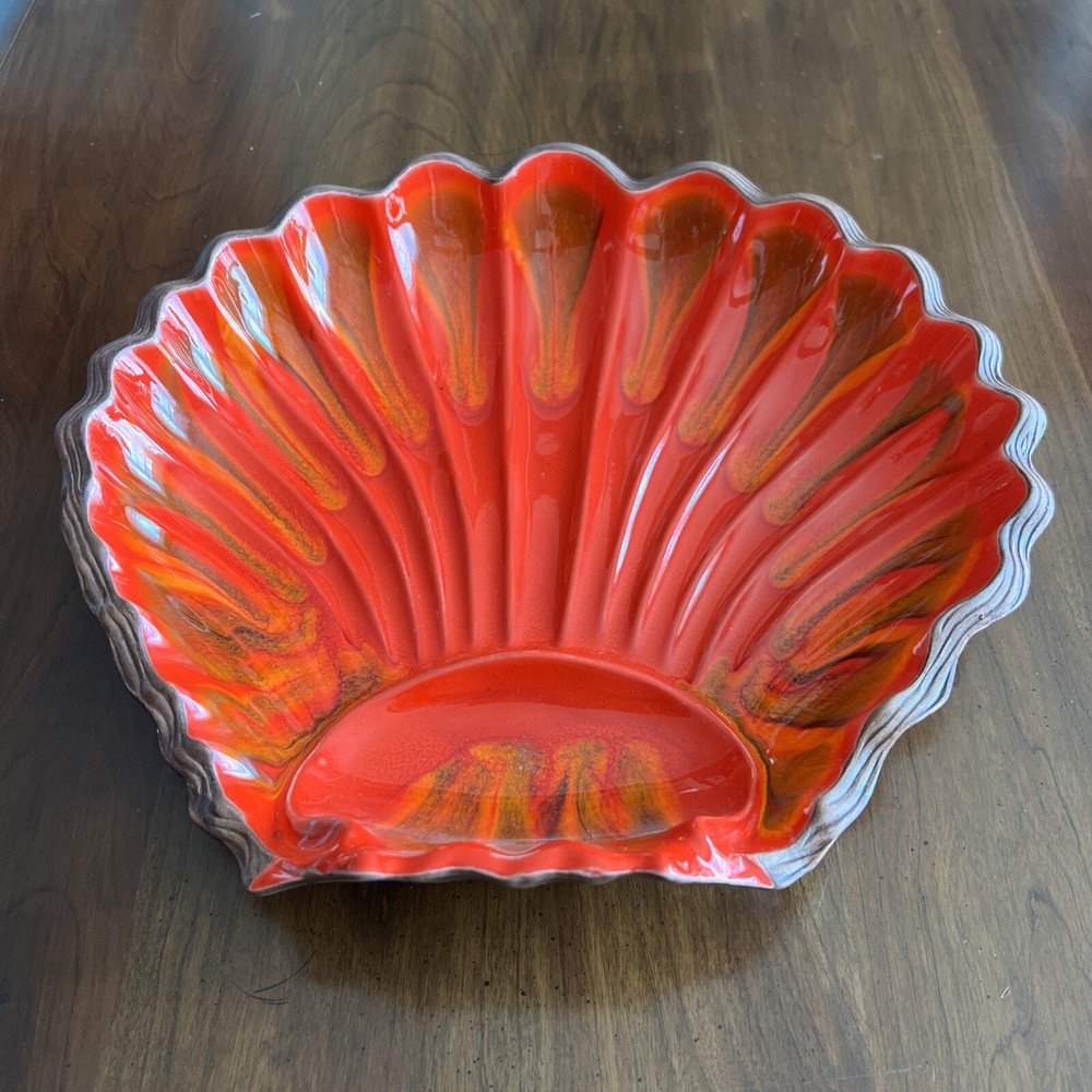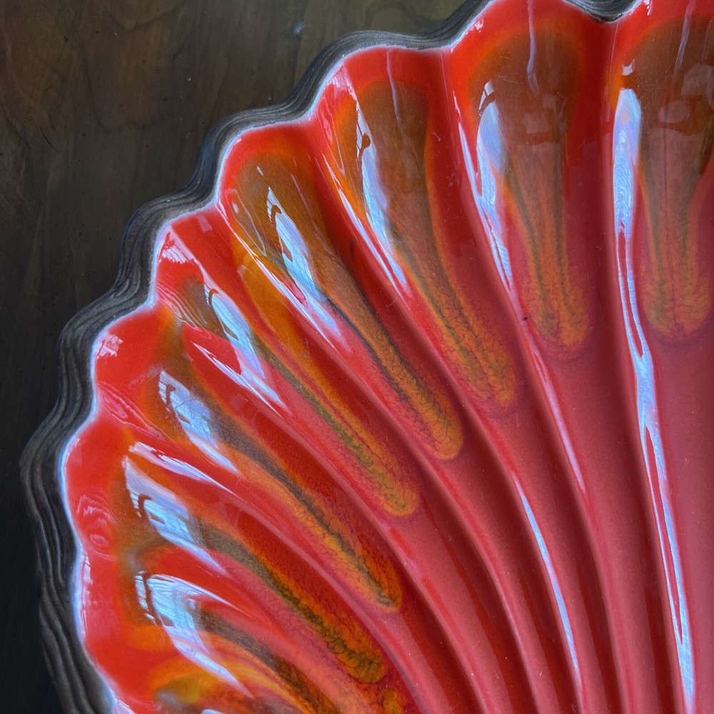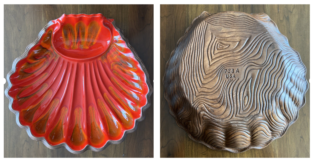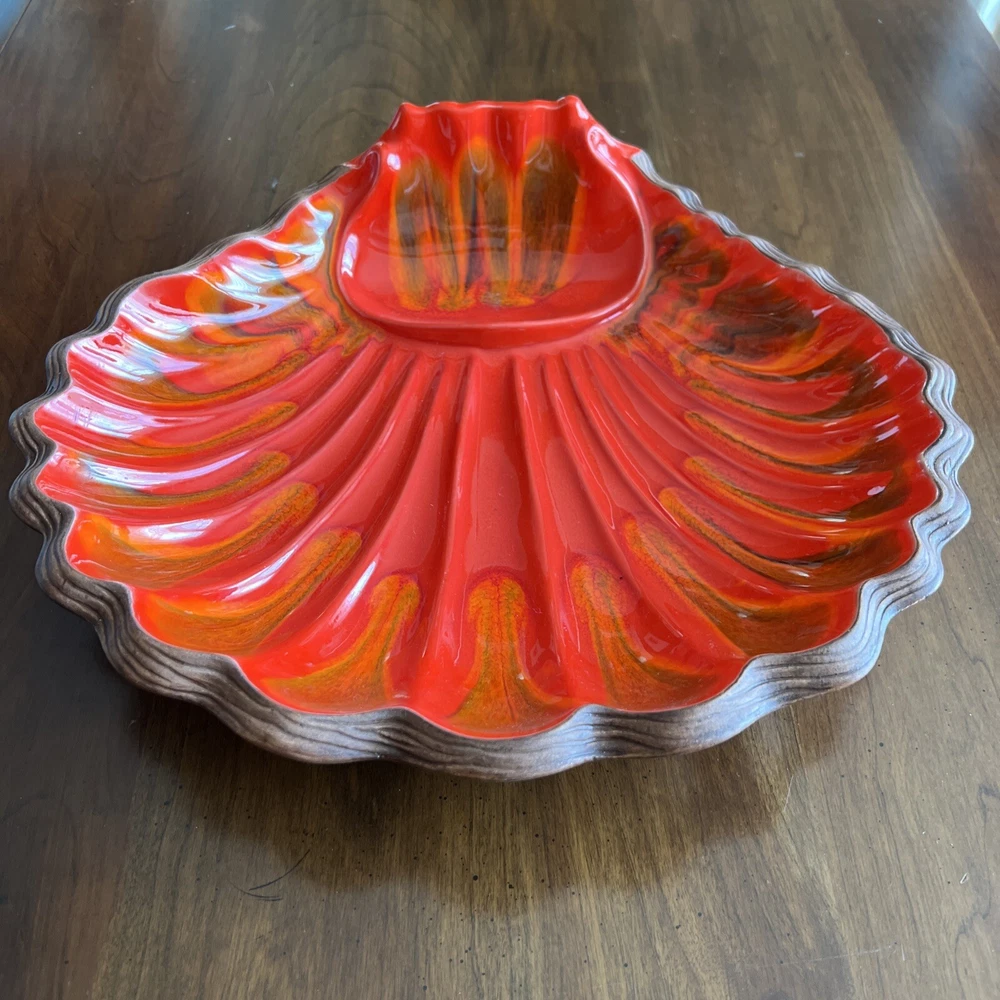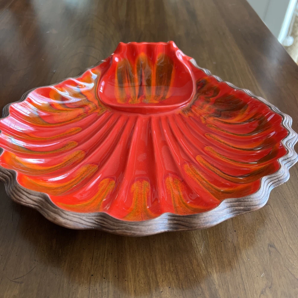 Wonderful Mid Century Large Chip & Dip Bowl, in the shape of a Clam Shell. Beautiful Red Orange glaze, with a very cool Wood Grain pattern on the back side. Made in U.S.A. This is a nice large bowl - 11.5" x 13.5" x 3" Excellent condition; just a couple of tiny white dots, and a few rubbed areas, on the back woodgrain side (see photos). Sorry, no sales outside the U.S.