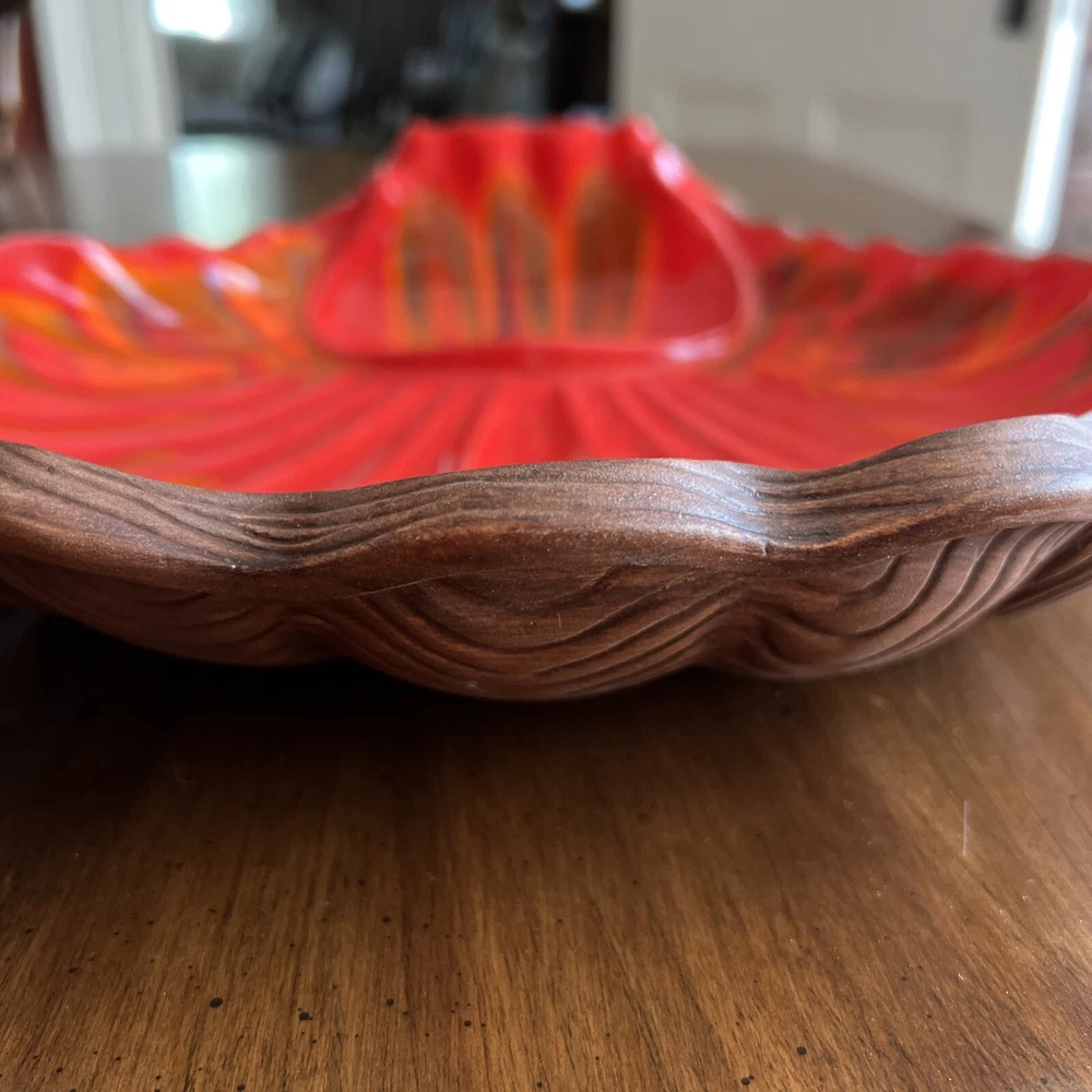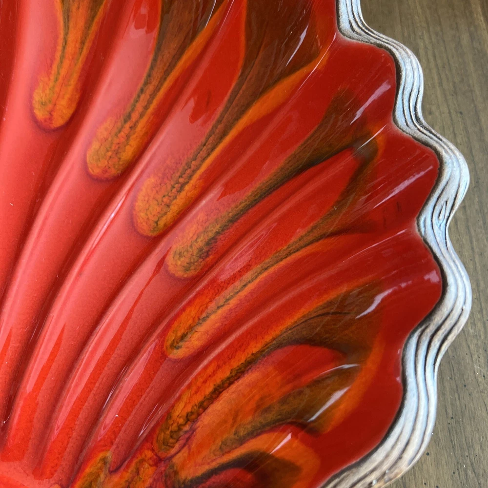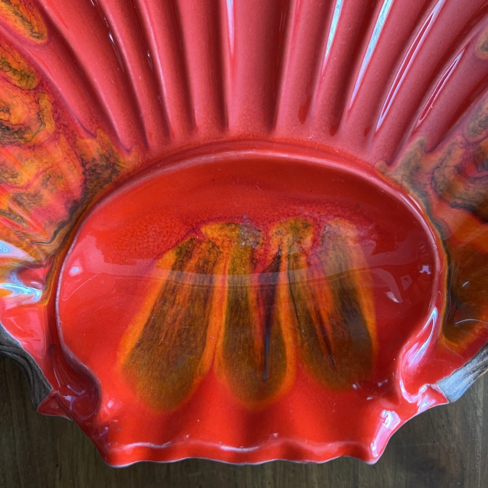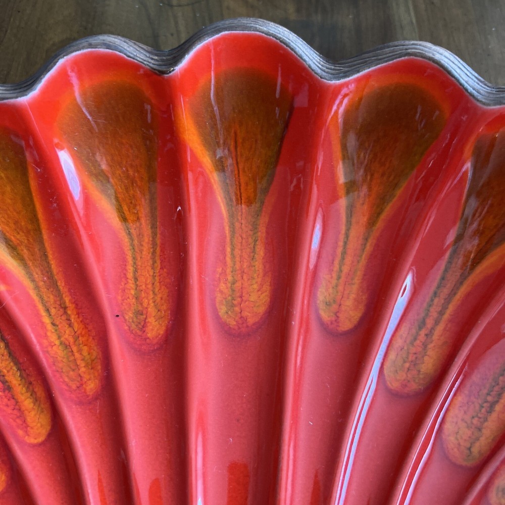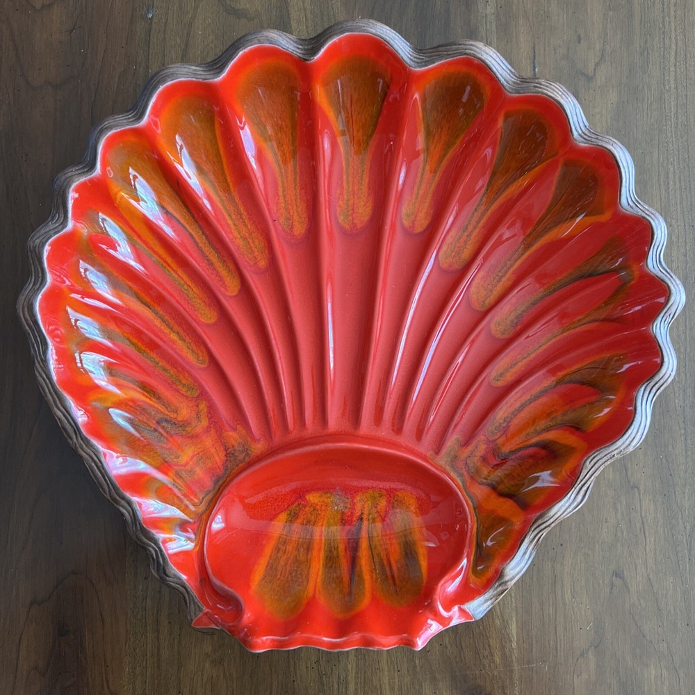 Wonderful Mid Century Large Chip & Dip Bowl, in the shape of a Clam Shell. Beautiful Red Orange glaze, with a very cool Wood Grain pattern on the back side. Made in U.S.A. This is a nice large bowl - 11.5" x 13.5" x 3" Excellent condition; just a couple of tiny white dots, and a few rubbed areas, on the back woodgrain side (see photos). Sorry, no sales outside the U.S.