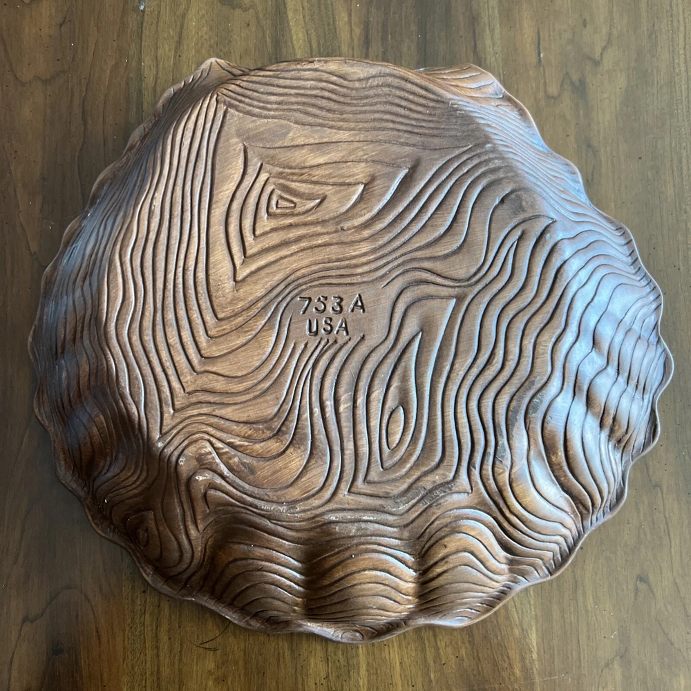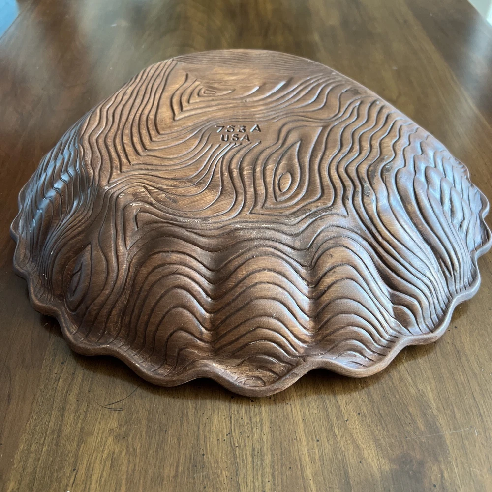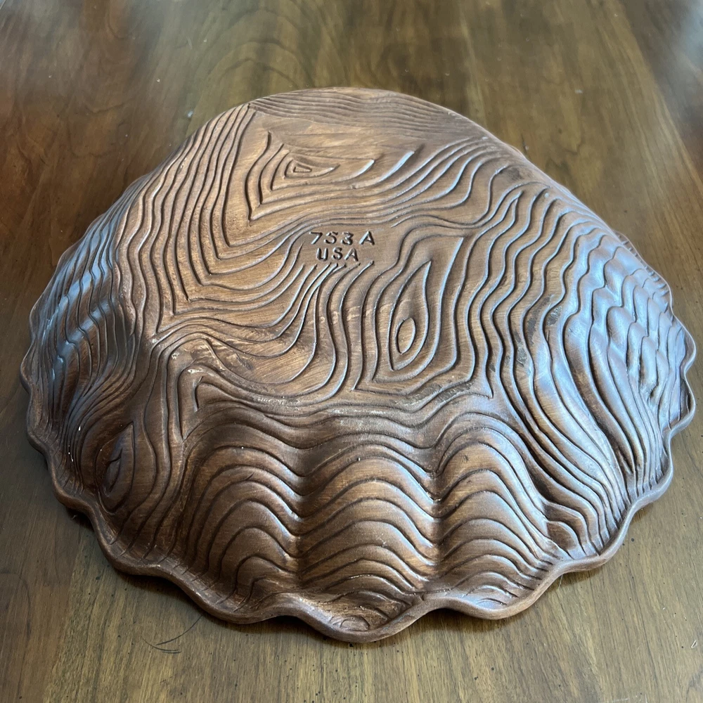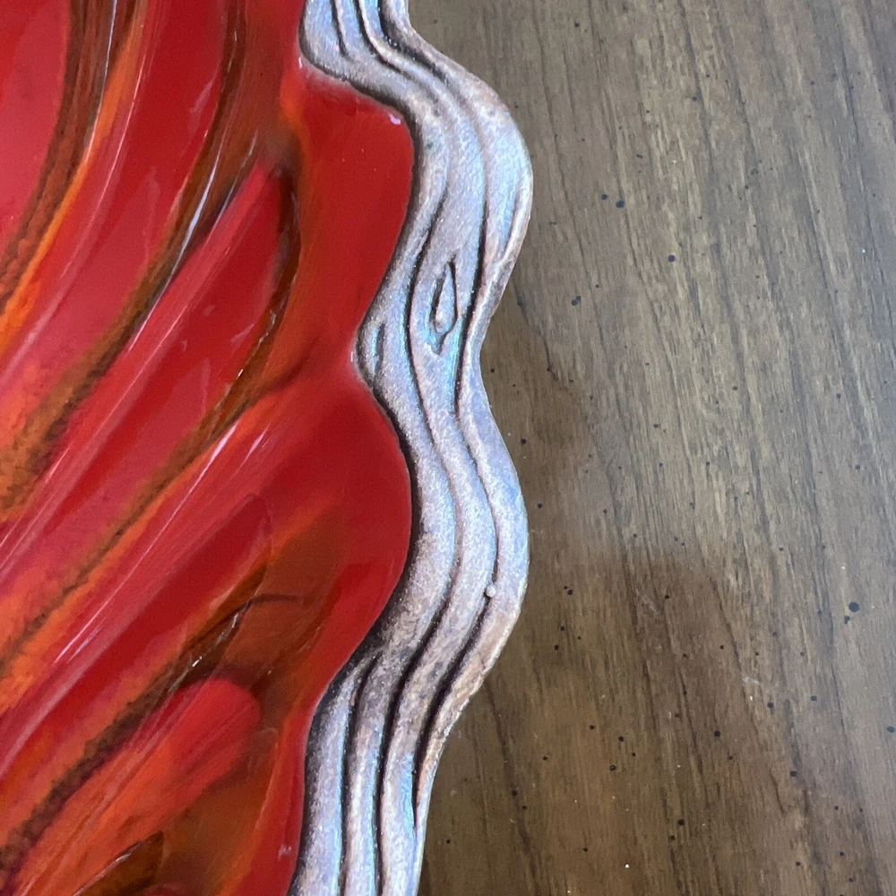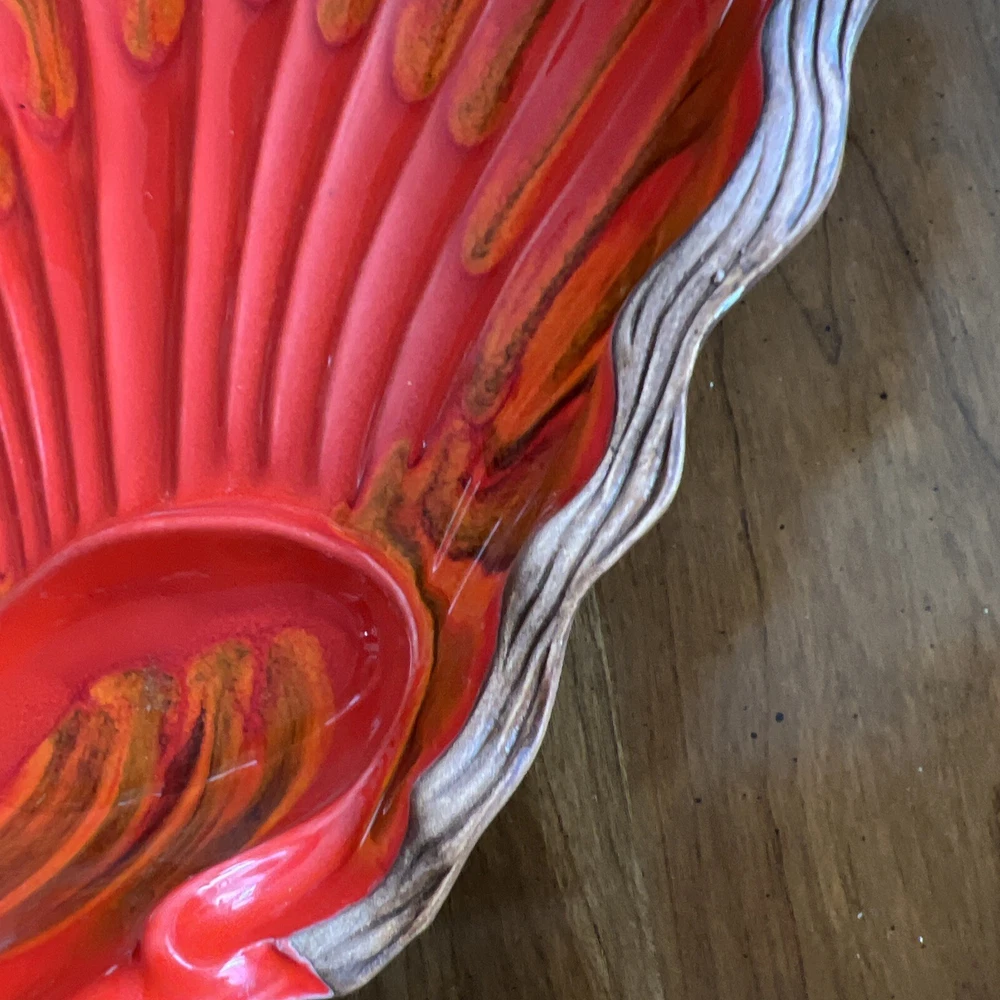 Wonderful Mid Century Large Chip & Dip Bowl, in the shape of a Clam Shell. Beautiful Red Orange glaze, with a very cool Wood Grain pattern on the back side. Made in U.S.A. This is a nice large bowl - 11.5" x 13.5" x 3" Excellent condition; just a couple of tiny white dots, and a few rubbed areas, on the back woodgrain side (see photos). Sorry, no sales outside the U.S.