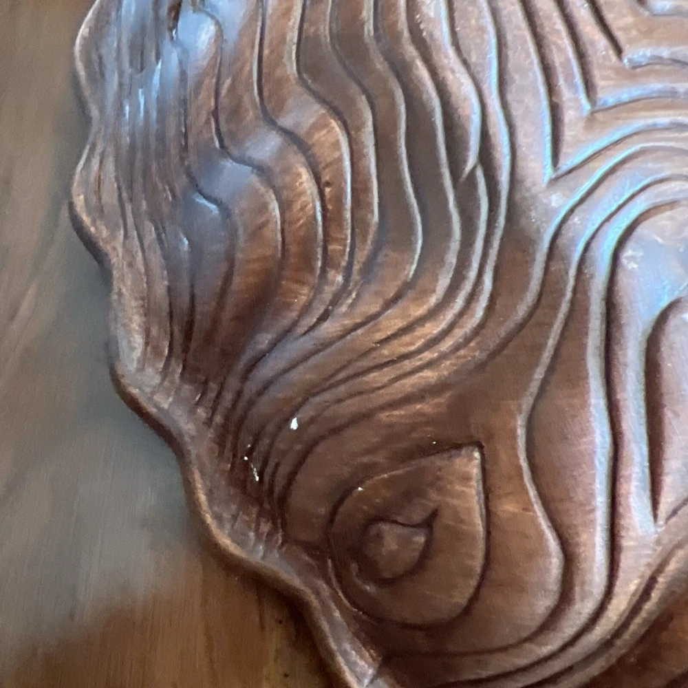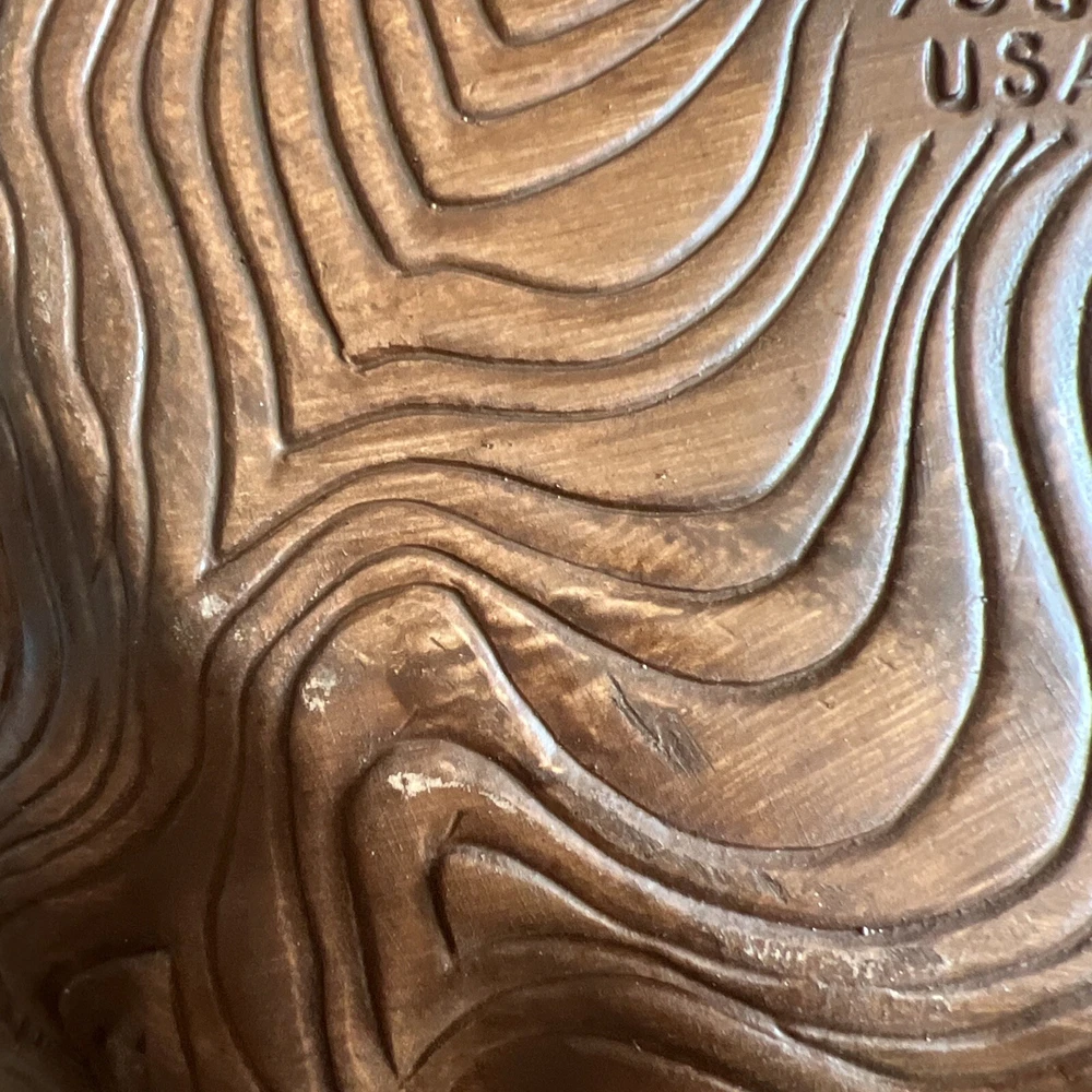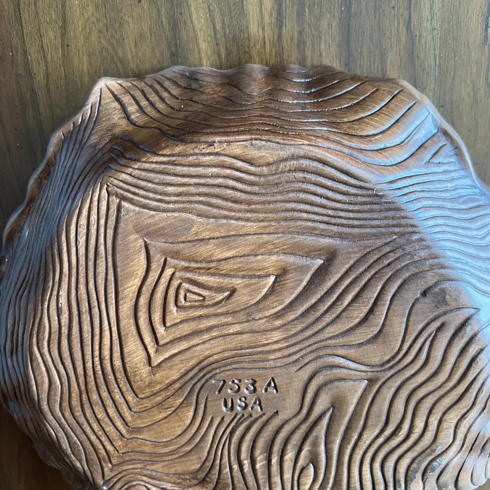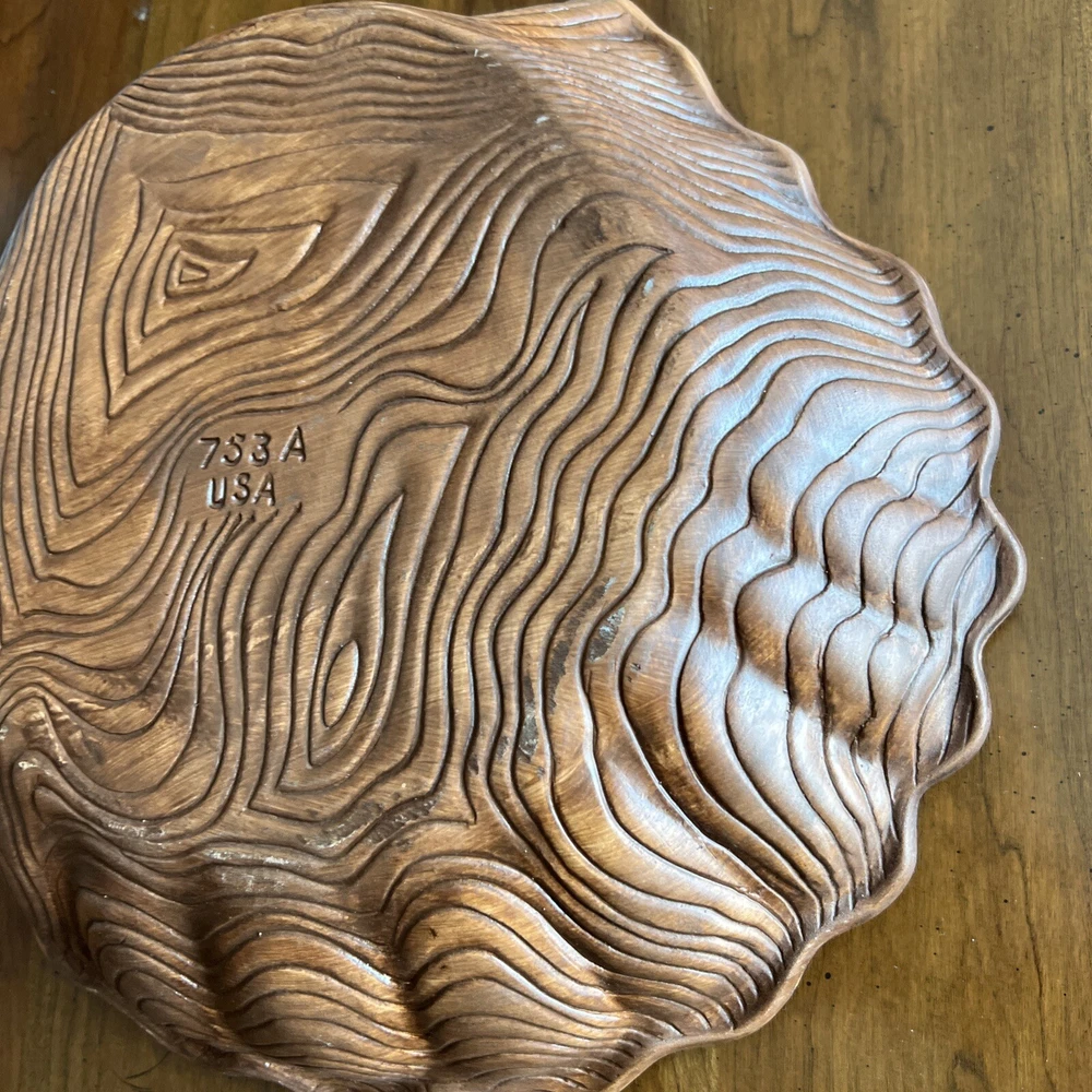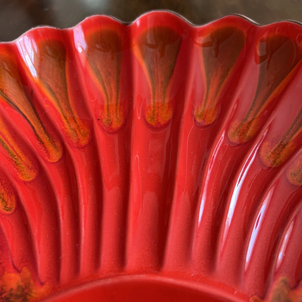 Wonderful Mid Century Large Chip & Dip Bowl, in the shape of a Clam Shell. Beautiful Red Orange glaze, with a very cool Wood Grain pattern on the back side. Made in U.S.A. This is a nice large bowl - 11.5" x 13.5" x 3" Excellent condition; just a couple of tiny white dots, and a few rubbed areas, on the back woodgrain side (see photos). Sorry, no sales outside the U.S.