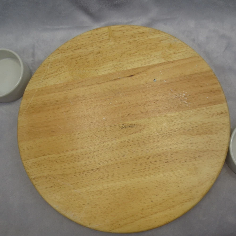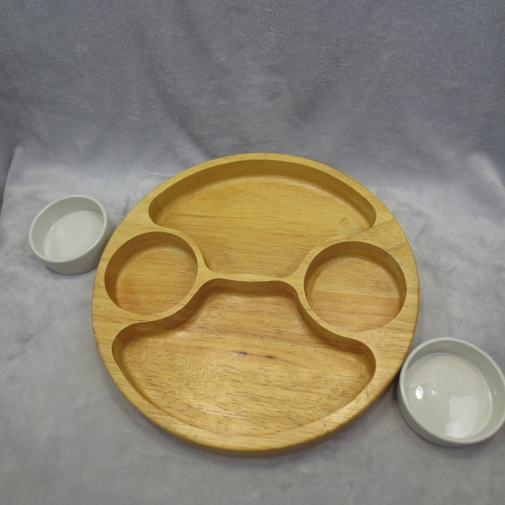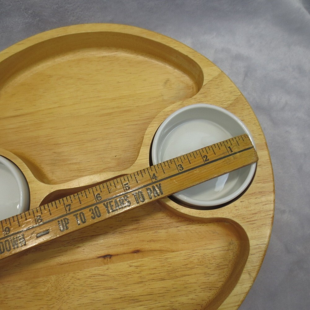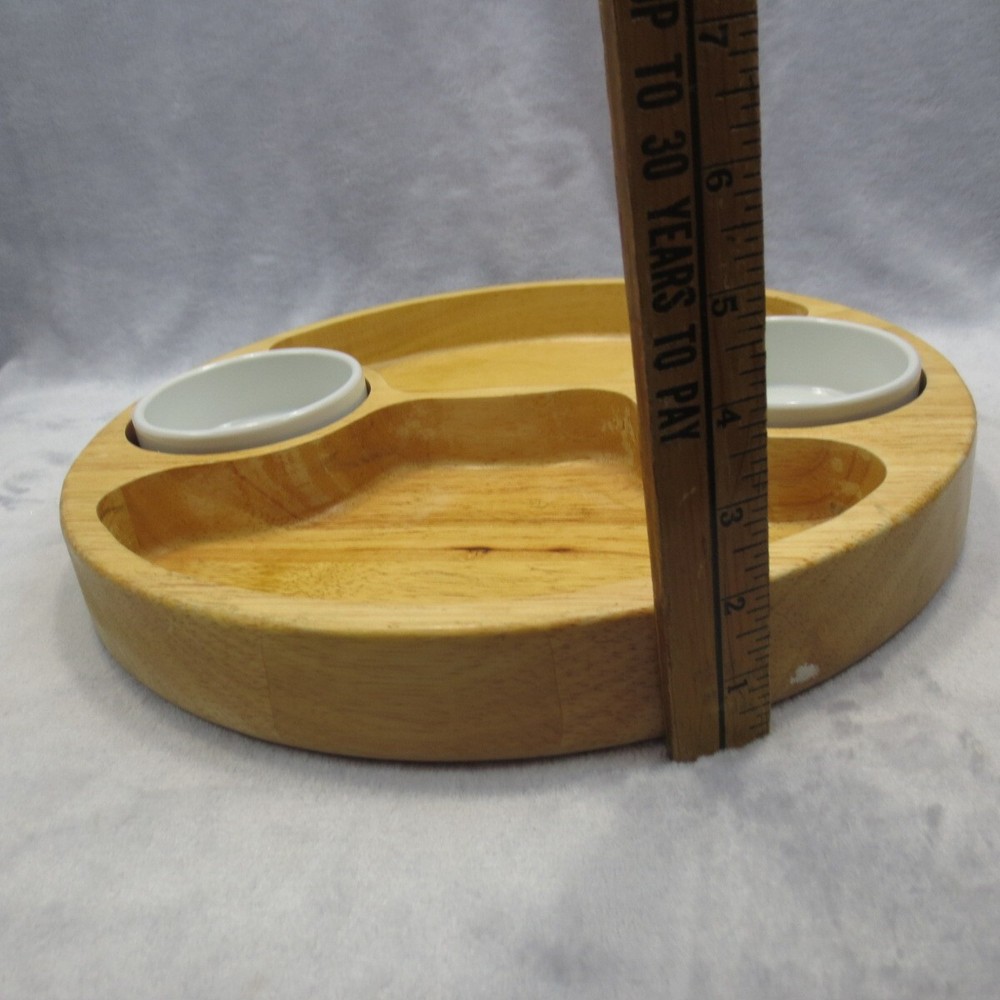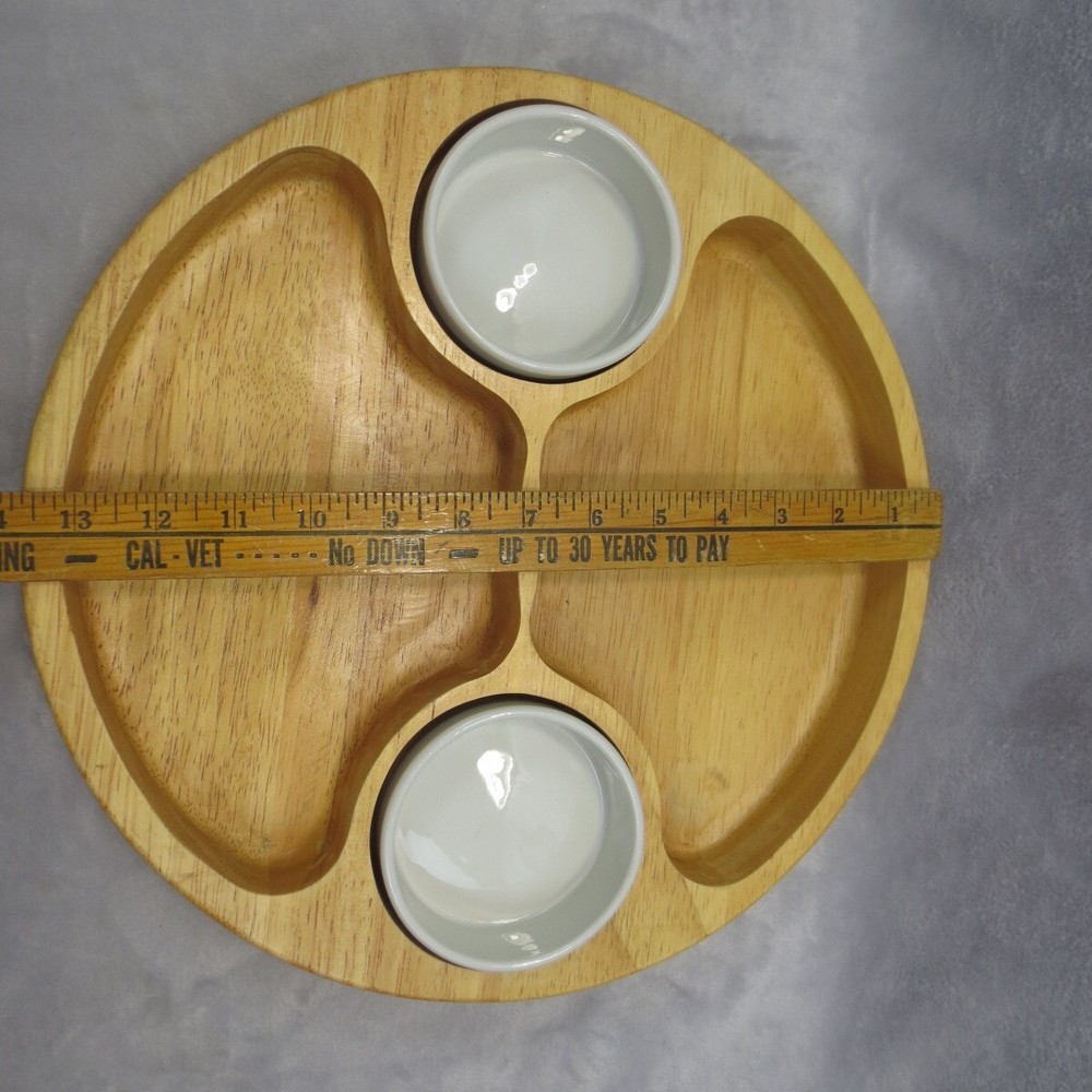 Enhance your entertaining experience with the Wood Marketplace Large 14 Inch Double Dip Charcuterie Tray, complete with elegant ceramic bowls for your dips and soft cheeses. Perfect for serving a variety of appetizers and dips, this round tray features a sleek brown color and a light brown wood tone that complements any decor. Crafted for versatility, the tray boasts four compartments to accommodate multiple flavors and ingredients, making it ideal for any occasion. The solid pattern and absence of personalization ensure a classic look that fits seamlessly into your home or event aesthetic. Proudly made in Thailand, this serving tray is a blend of functionality and style. Small white marks and scratches. Please review all photos prior to purchase. Nice pre-owned condition! Ships out quickly from a smoke-free, pet-free home. Feedback: When you receive an item and are satisfied with the product please give us 5 Stars – it is so important to us to help support our small business. If you are unsatisfied with an item for any reason, please contact us before leaving any neutral or negative feedback. Send us a message through the platform as we will be more than happy to assist you. We do not respond to e-mails or phone calls, we only communicate through platform messages. All pre-owned items are washed per listing platform's Standards.