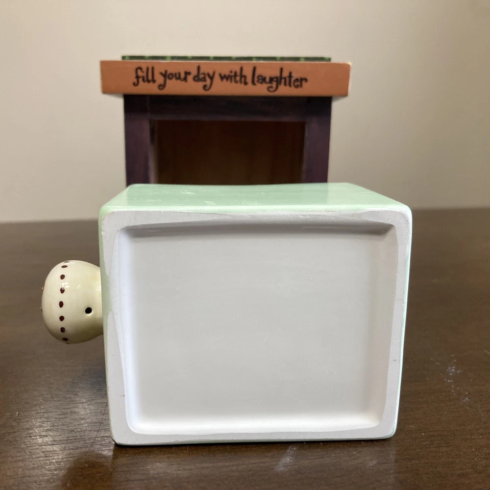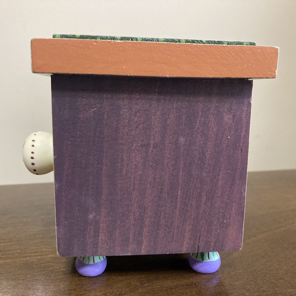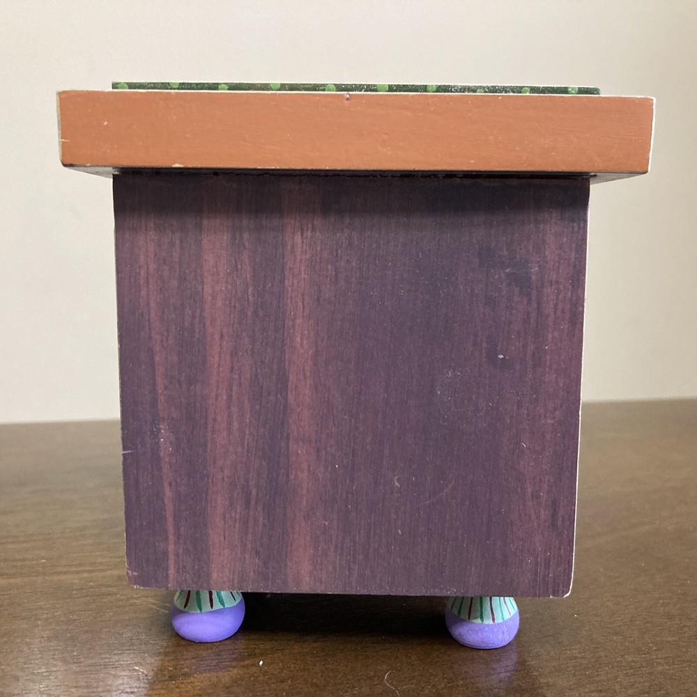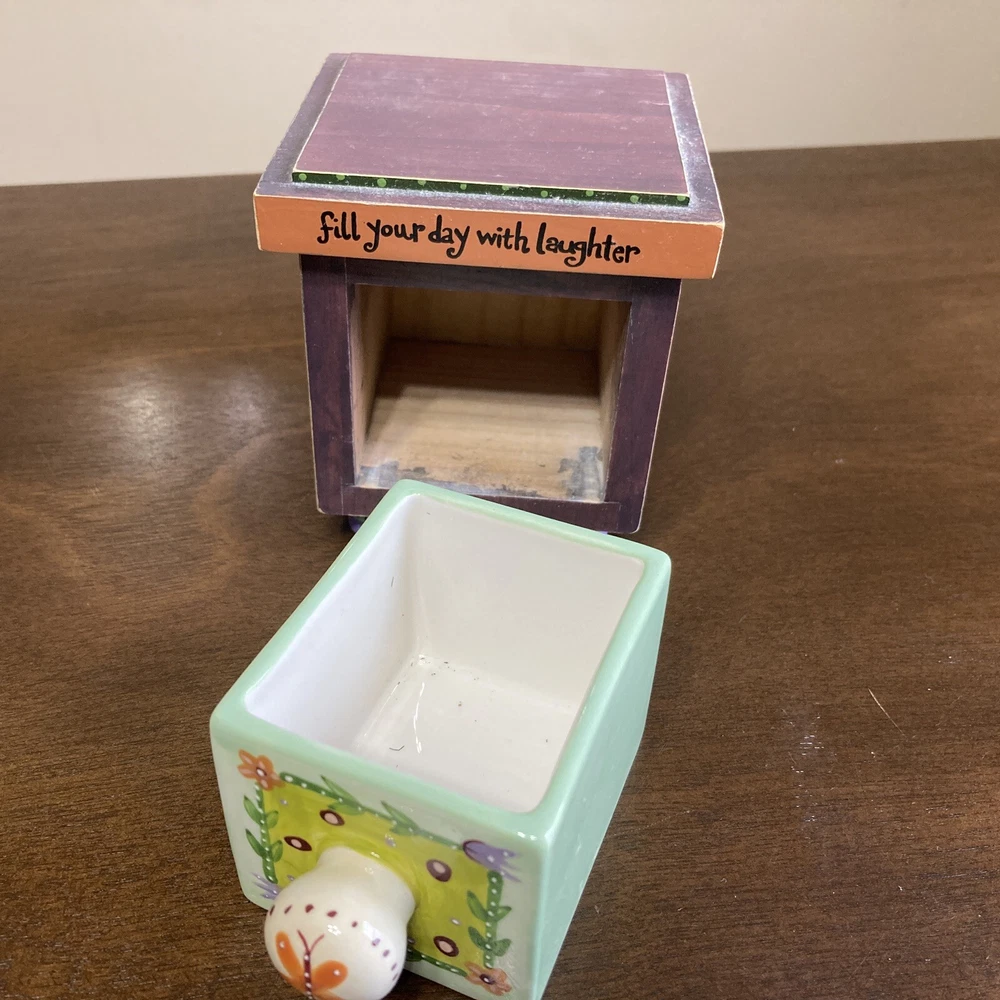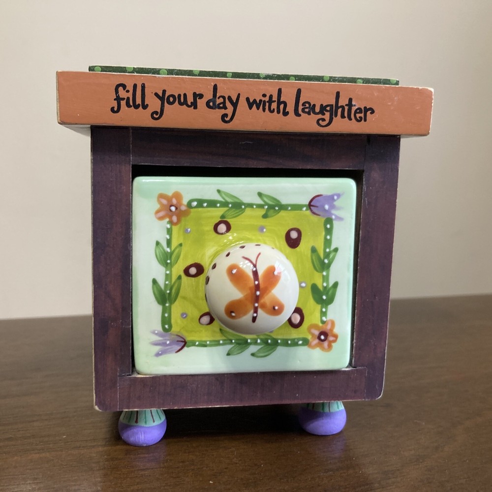 Wood Trinket Box Ceramic Drawer Lori Siebert Studio Whimsical Design. Fill your day with laughter Floral butterfly Purple green maroon 4” square 4.25” tall ⭐️⭐️⭐️⭐️⭐️ 😃 THANK YOU 😃 I ❤️ my li’l girl w a li’l something extra! 💕💙💛T21💛💙💕Down Syndrome ROCKS! Smoke free, children and pup loving home