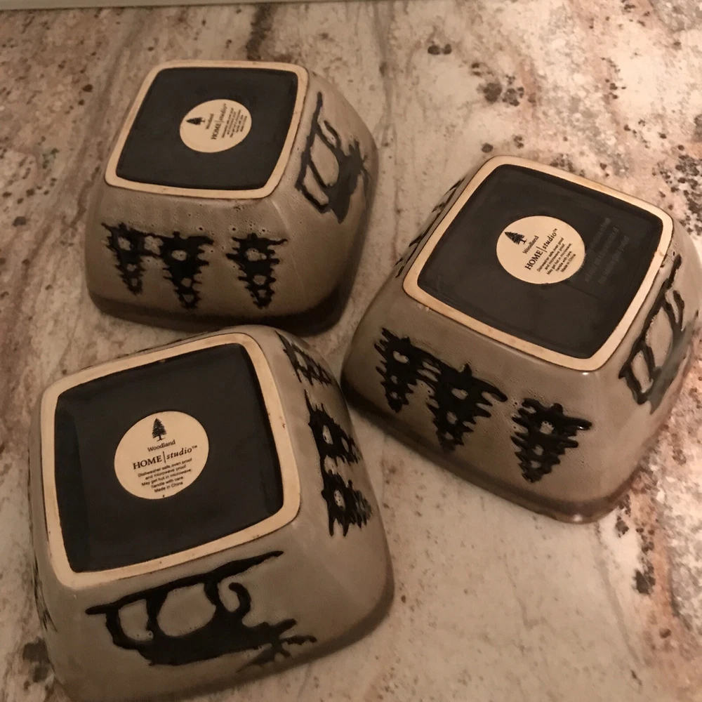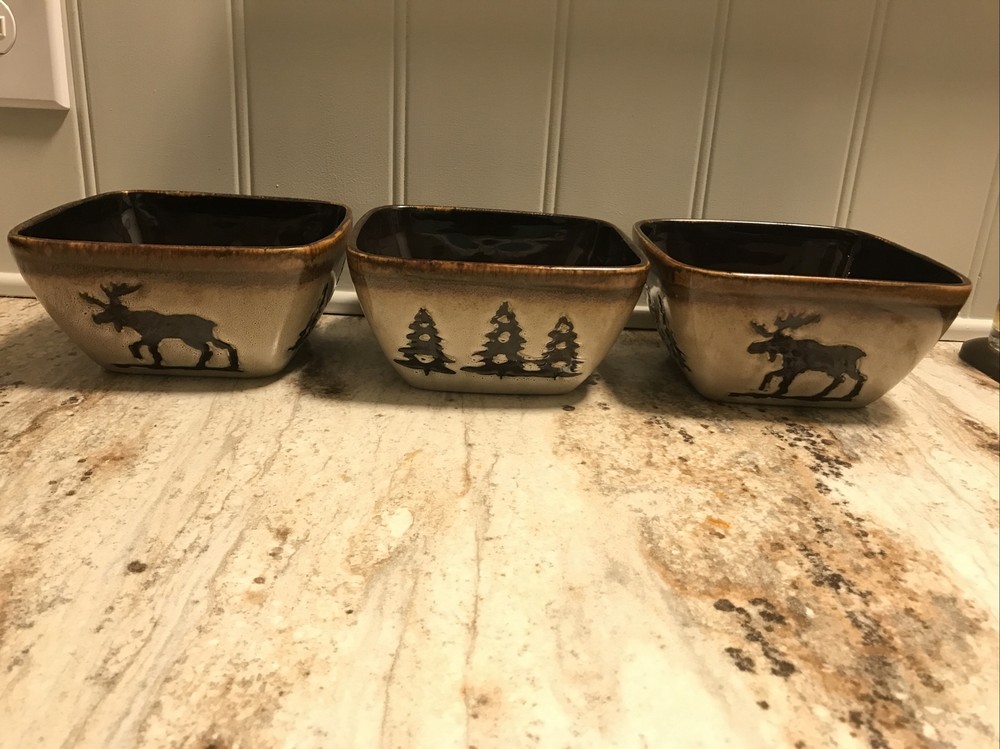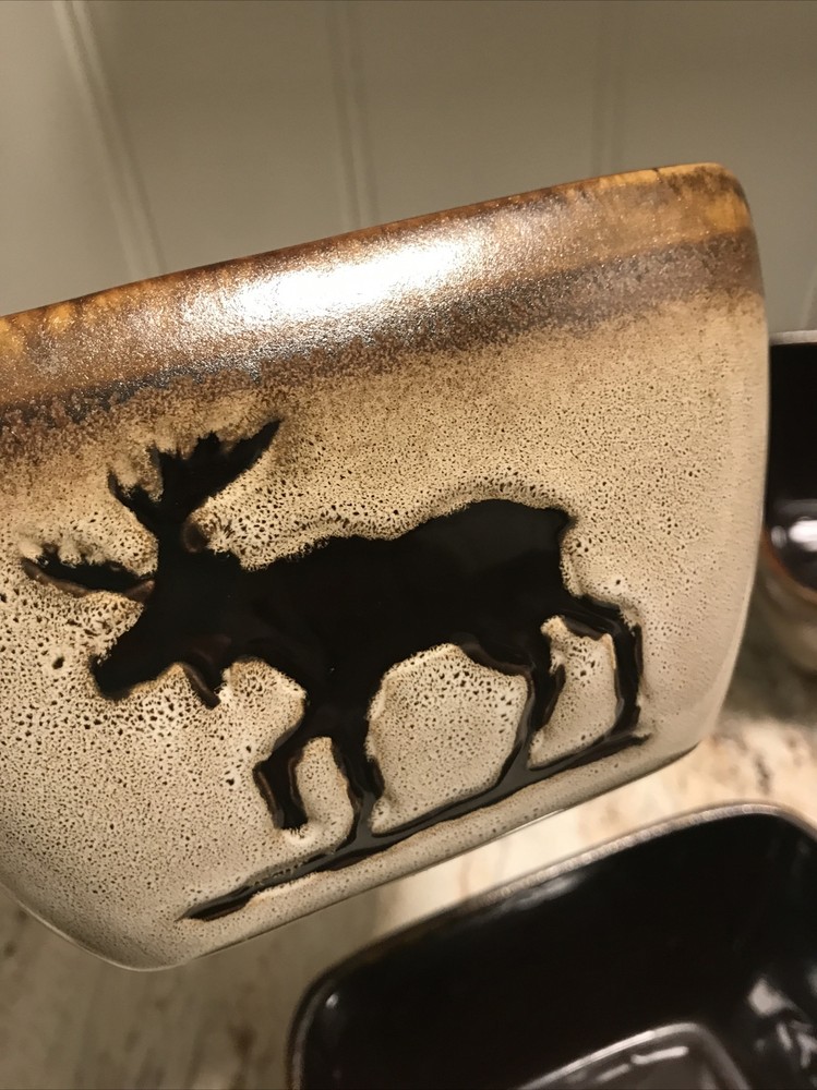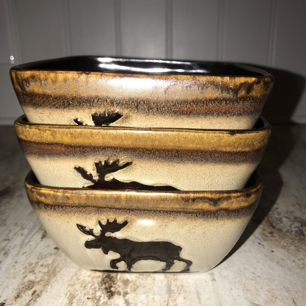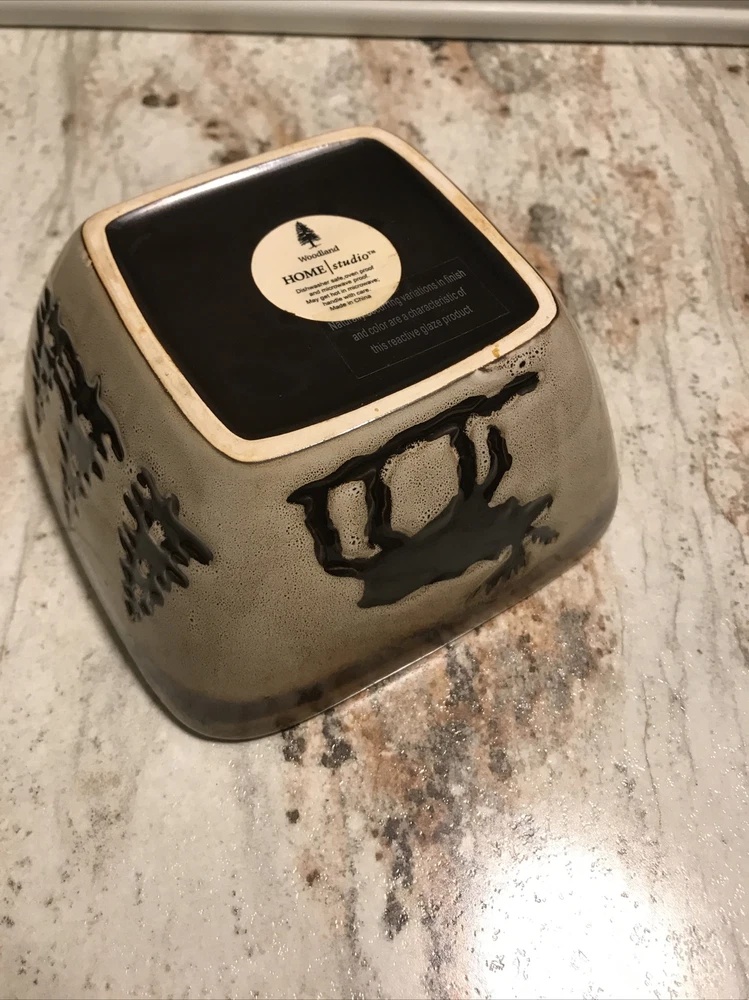 Woodland Home Studio 5.5" Stoneware Square Bowl With Moose And Trees. Condition is Used. Shipped with USPS Ground Advantage....