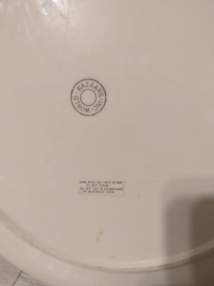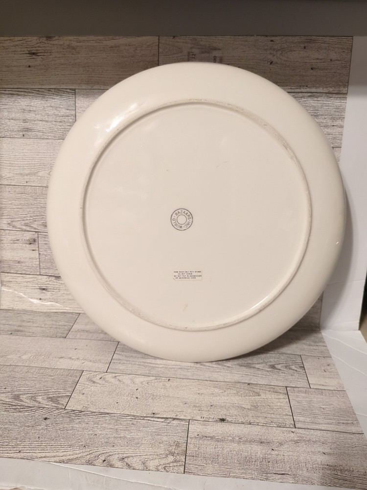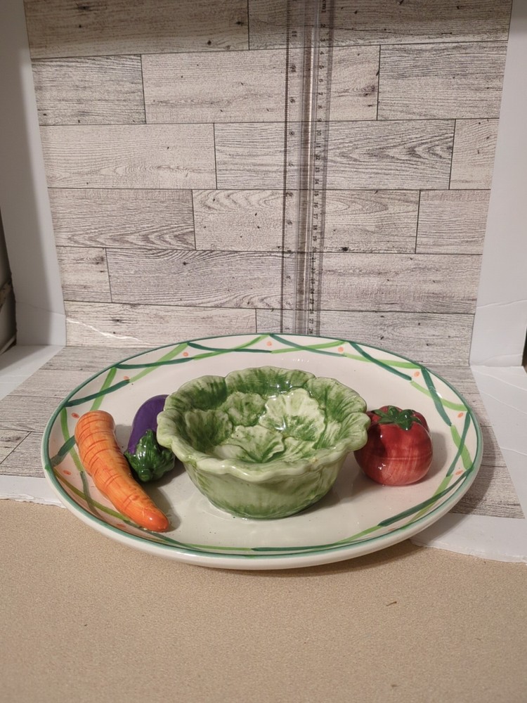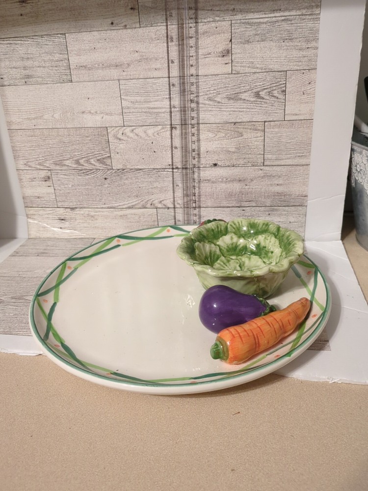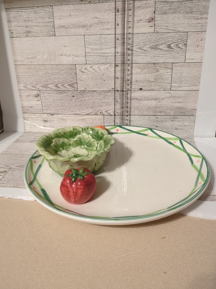 This is a large ceramic serving platter/tray with a shiny finish from World Bazaar Inc. The platter features a vegetable and dip design with tomatoes, eggplants, and carrots. It is perfect for serving crudité and other snacks at parties or gatherings. (0552)