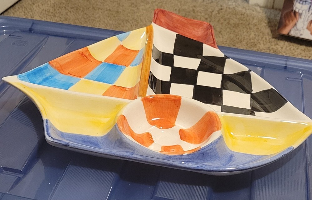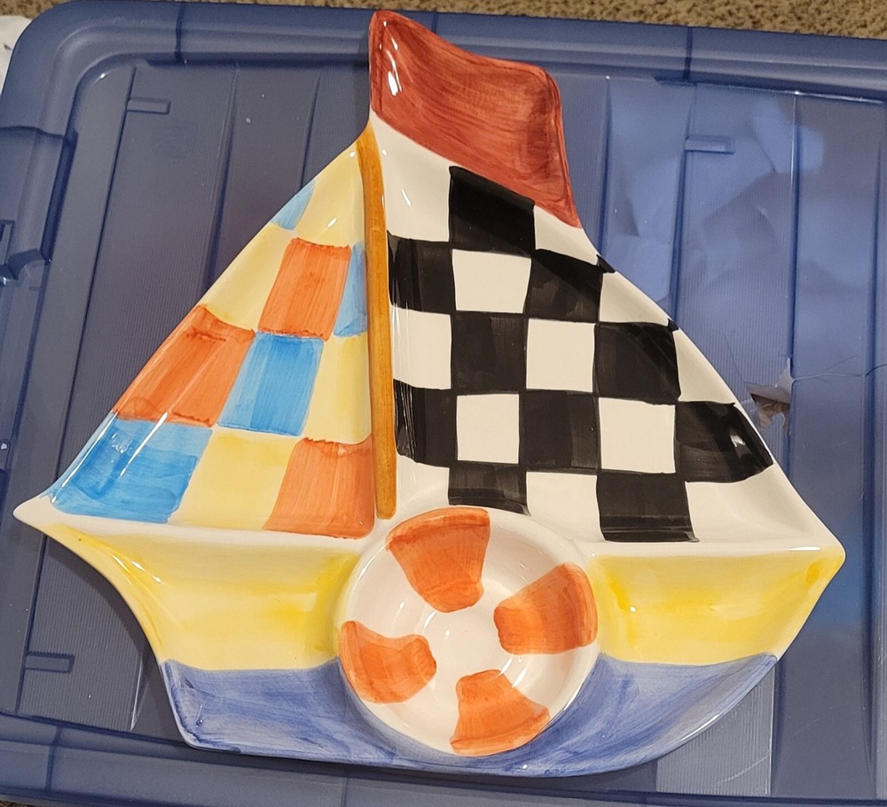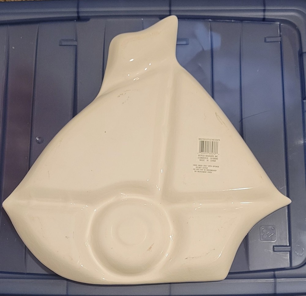 Enhance your entertaining experience with the World Bazaars Inc. Whimsical Sailboat Chip Dip Platter. This large, ceramic serving tray is beautifully crafted with a glazed finish and features a vibrant, multicolor sailboat pattern that is sure to be a conversation starter at any gathering. Designed for all occasions, the tray measures 15 inches in length and 14 inches in width, providing ample space for your favorite dips and snacks. With six compartments, it's perfect for arranging an array of appetizers for your guests. Hand wash care is recommended to maintain the tray's charming appearance. Add a touch of nautical charm to your next event with this delightful serving piece.