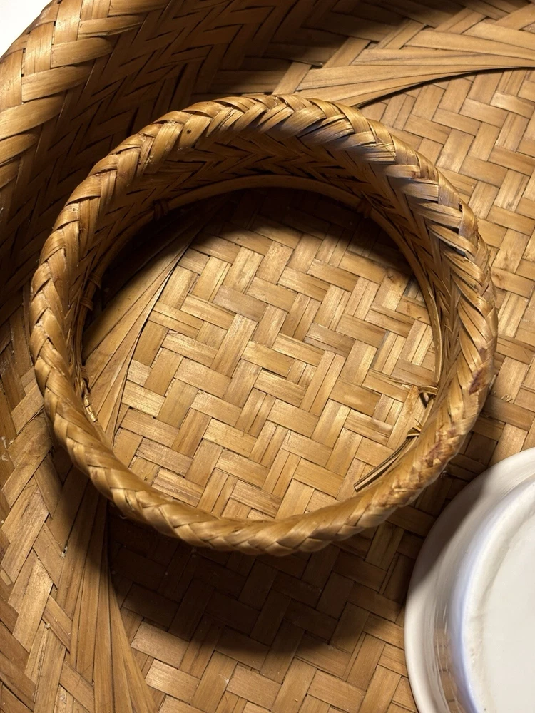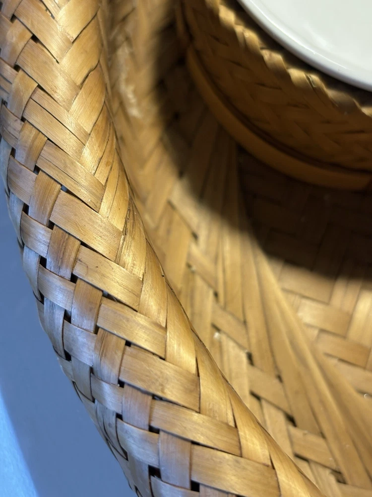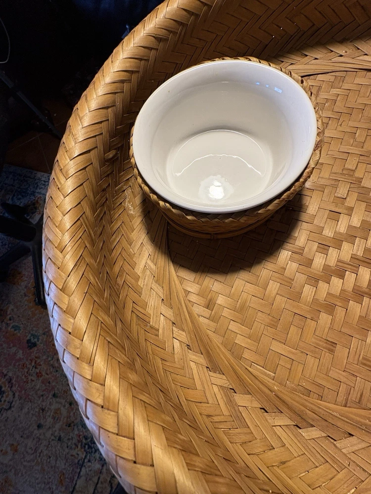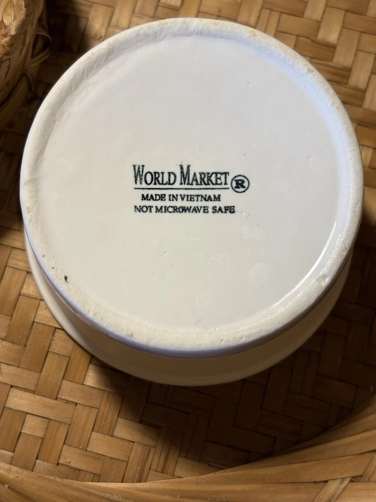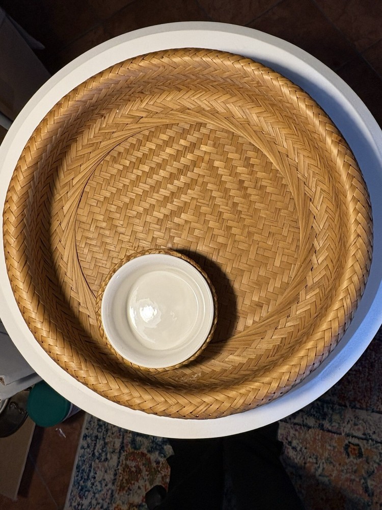 This is a World Market Woven Chip And Dip Tray that measures 14 inches across. It is a large serving tray made of rattan material in brown color. The set includes 2 items, featuring a tray specifically designed for serving chips and dip. No irregularity’s in the condition. Nice! Great for Super Bowl party.