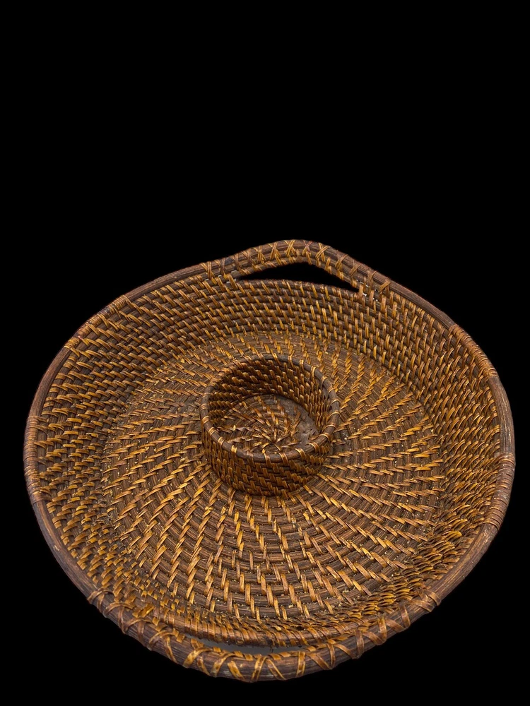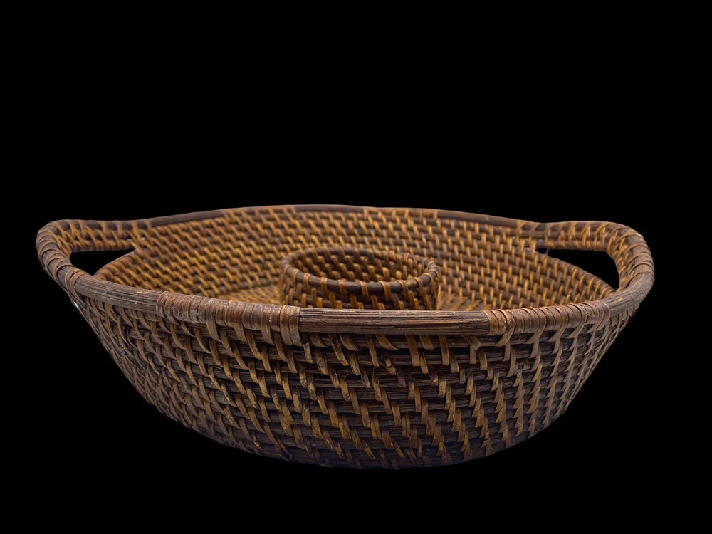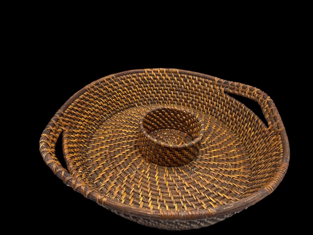 Vintage Bamboo Woven Wicker Brown Round Serving Chip & Dip Bowl Tray 13"