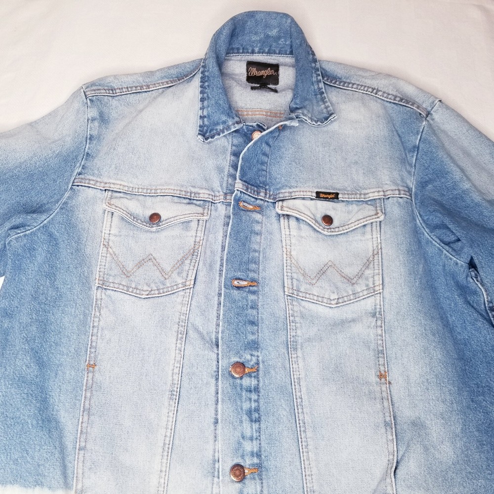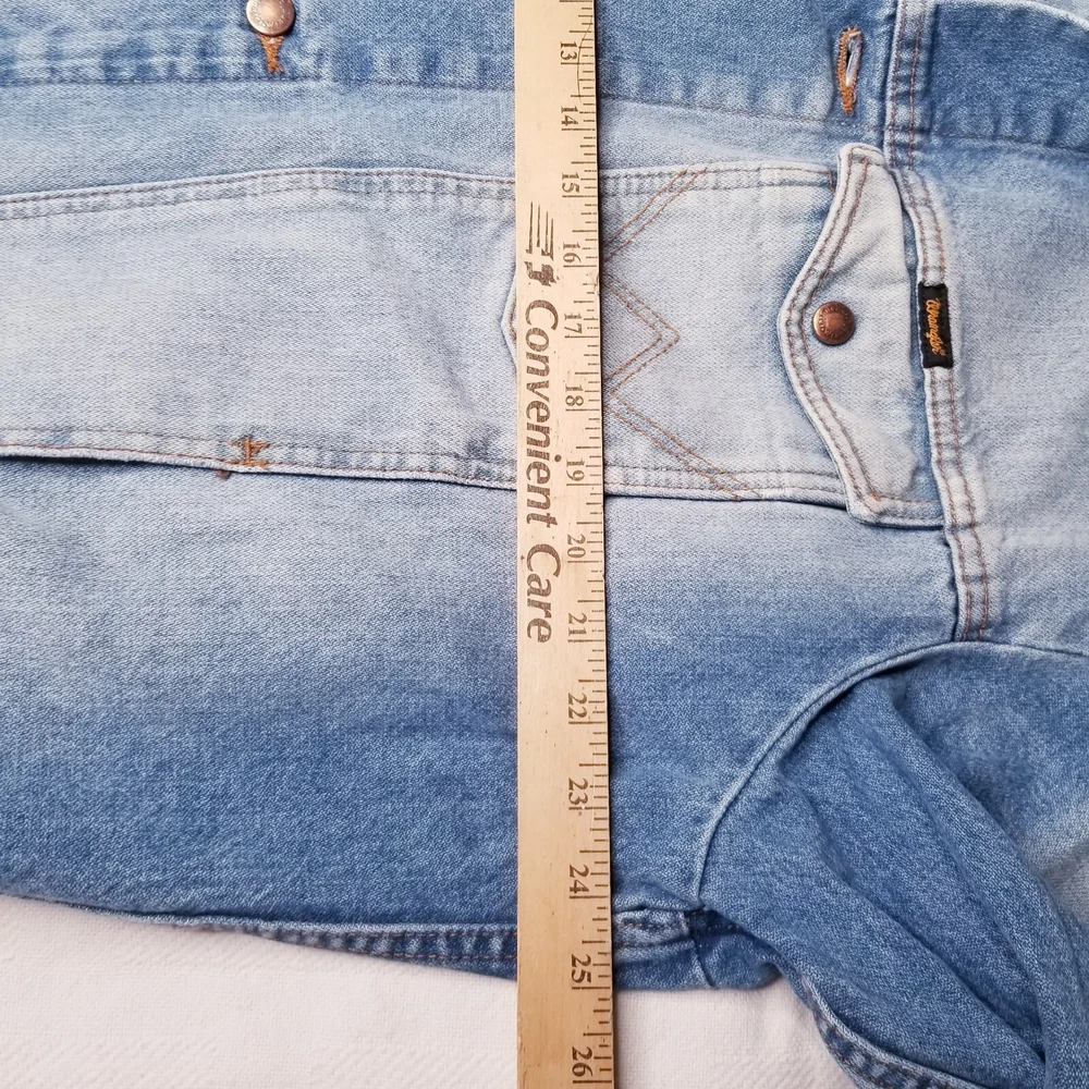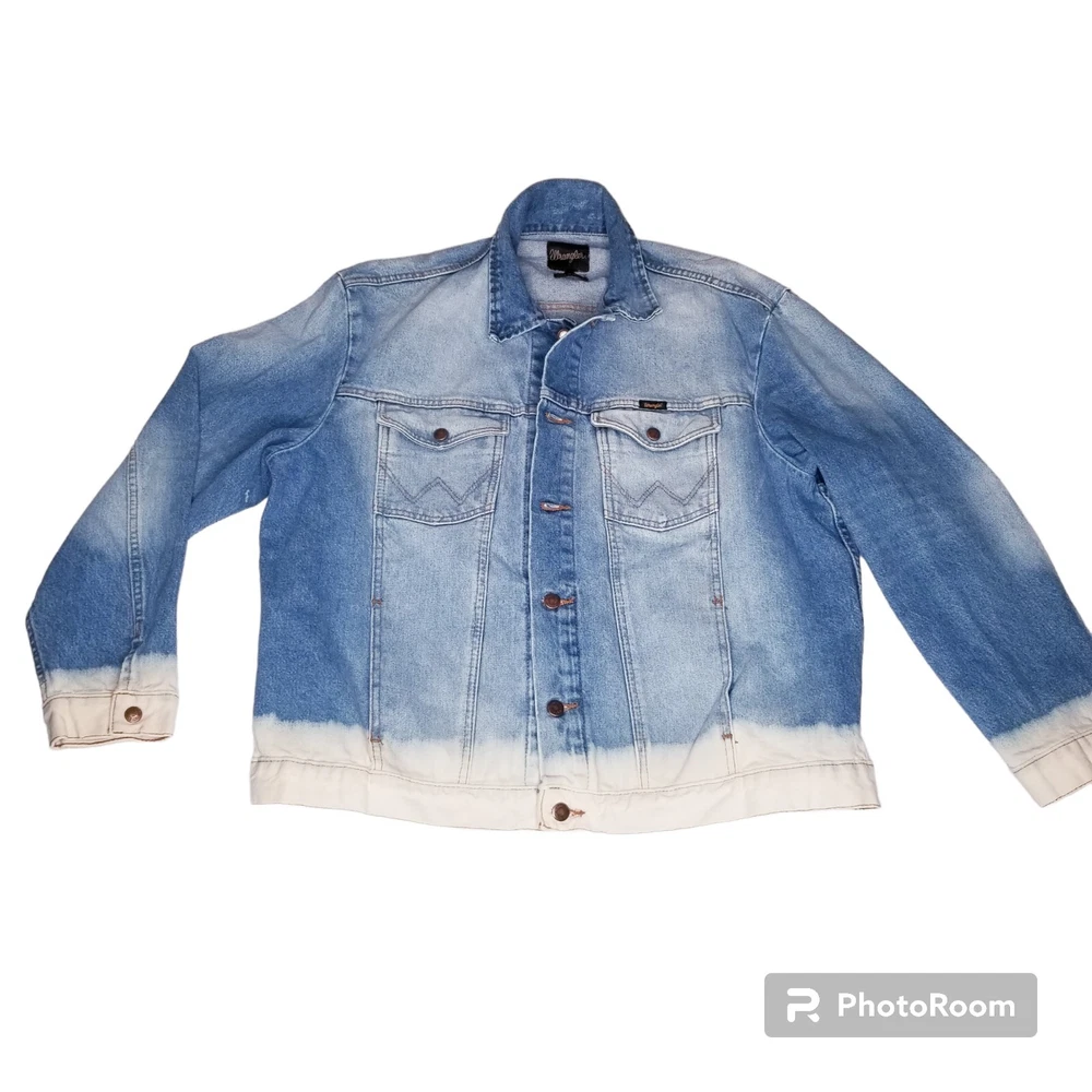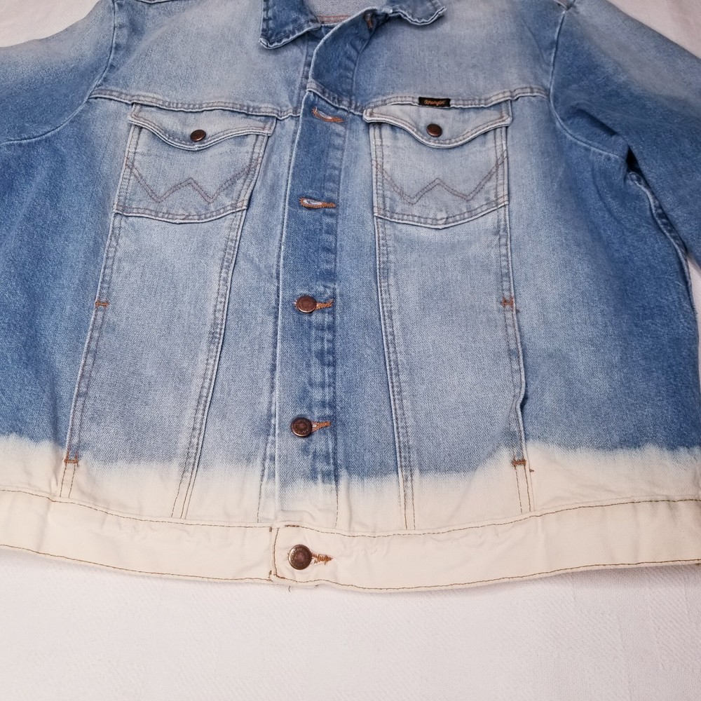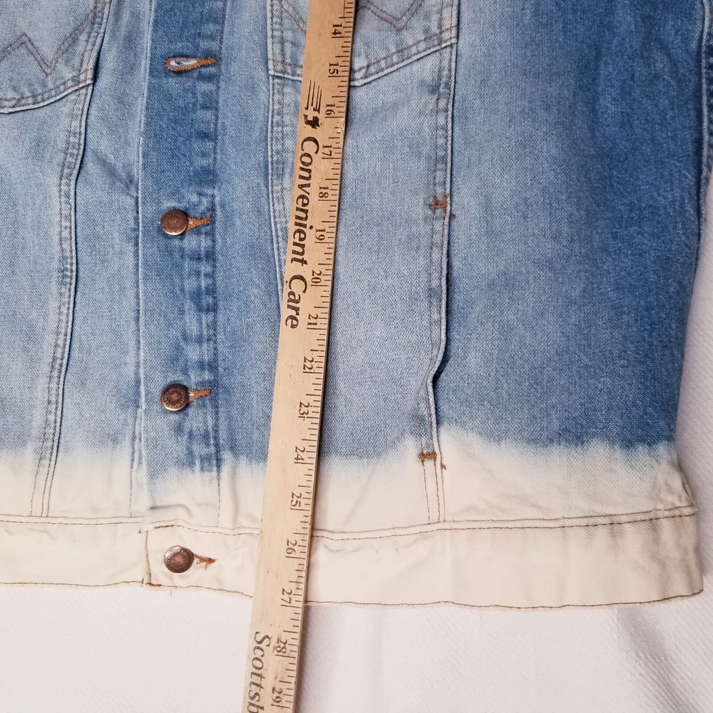 You are bidding on the following item... Wrangler Denim Button Front Trucker Jacket Bleach Dipped Unisex XL Boho Western Please,CHECK ALL PICS BEFORE BIDDING......... preowned condition see photos for measurements