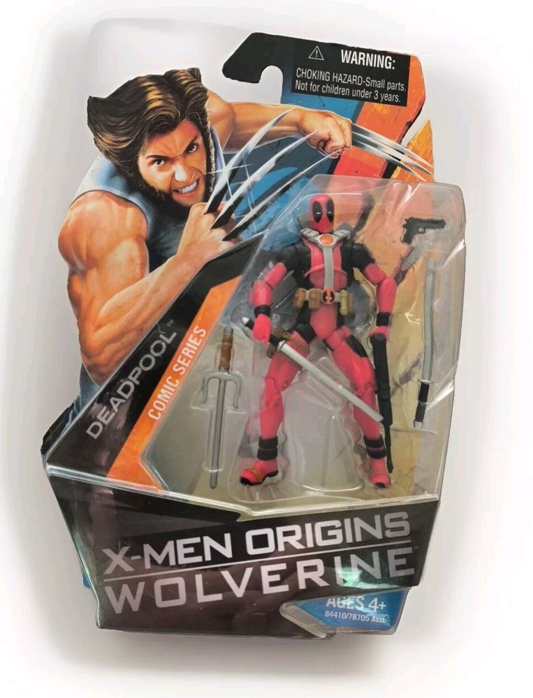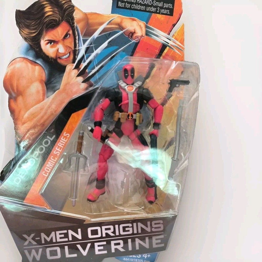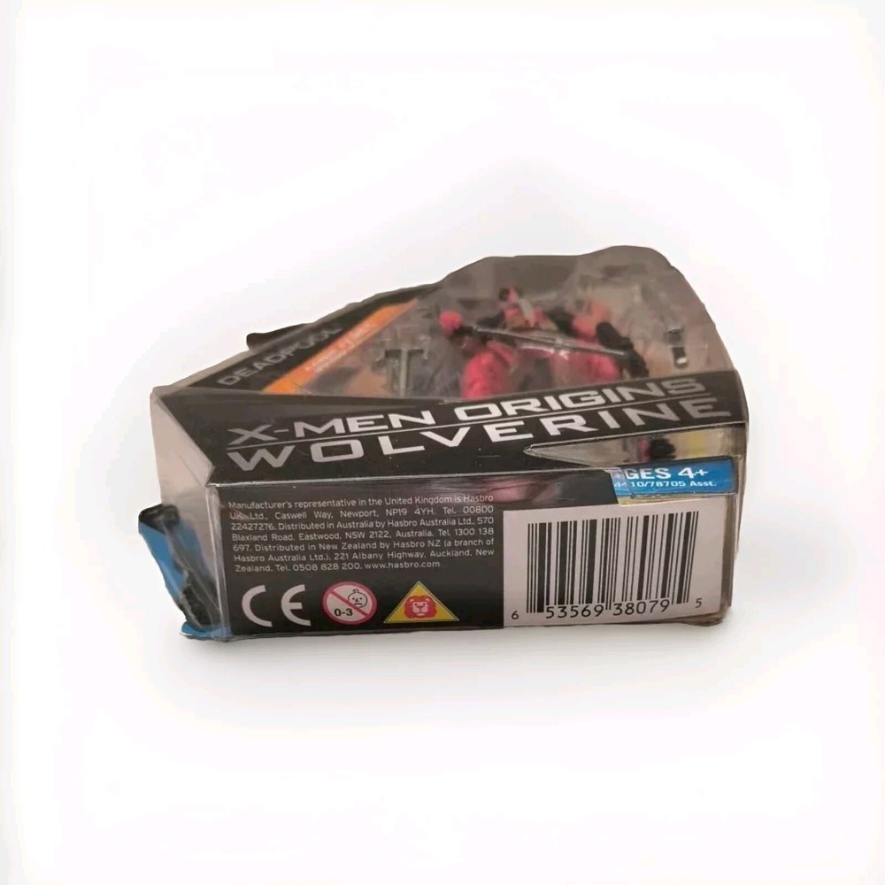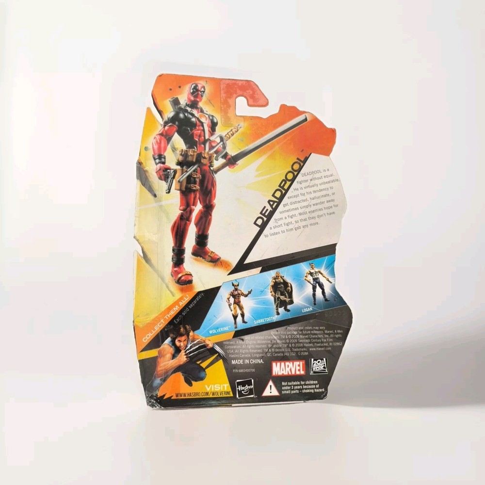 This is a 4-inch action figure of Deadpool from the X-Men Origins: Wolverine comic series. It was manufactured by Hasbro in 2009 as part of the Marvel Universe franchise. The figure is in its original packaging and is part of the 1:18 scale. It is a licensed reproduction featuring the Deadpool character from the Marvel Universe.