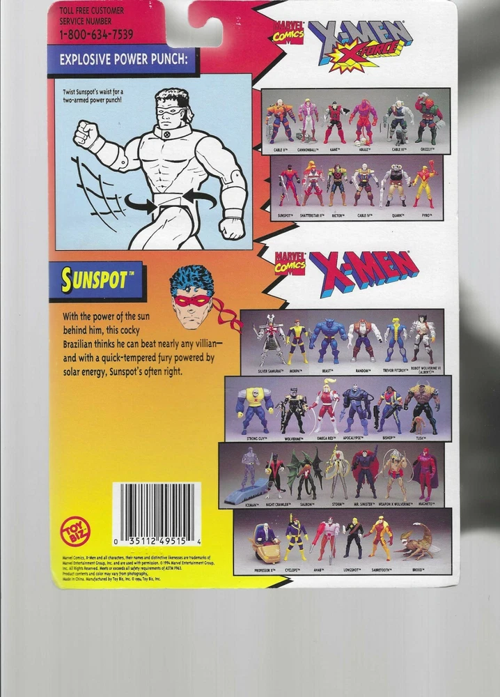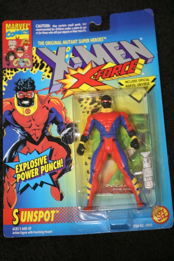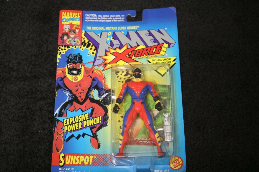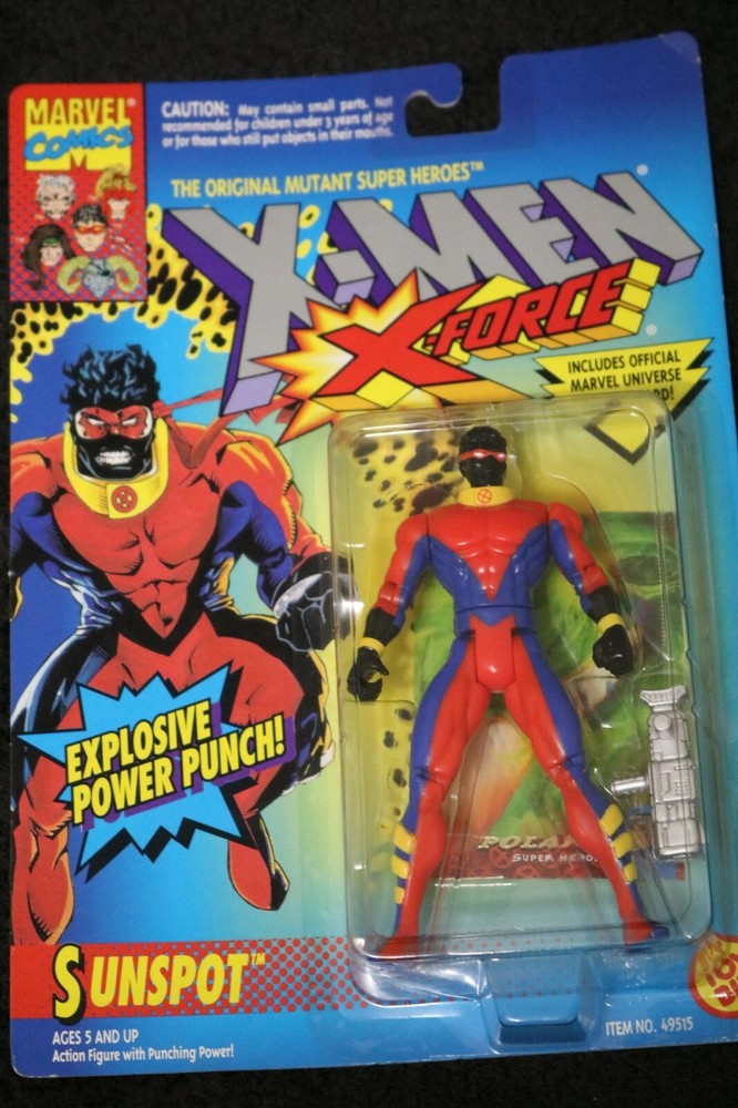 X-Men/X-Force Series 2 Sunspot with Explosive Power Punch & Gun by ToyBiz. Mint On Sealed Card. The original card is in very good condition. Bubble is in excellent condition. Minor wear on card. Toy Biz 1994 This is the 2nd card for the X-Men/X-Force Figures. Warning label on card. 2nd Series of X-Men/X-Force Item #49515 Card Color is blue