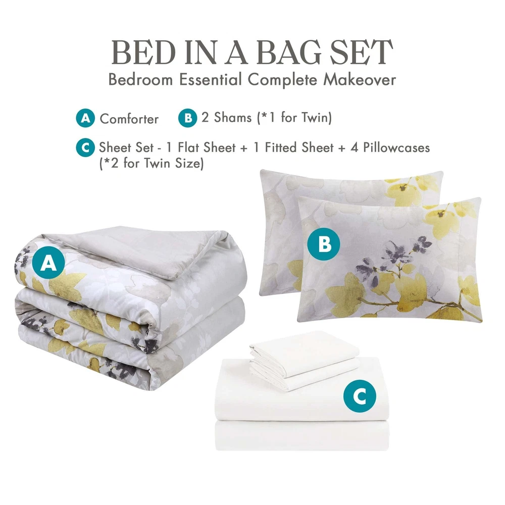 The Essentials Alexis Complete Bed in a Bag Set offers an eye-catching and modern update to match your bedroom décor. The ultra-soft floral print cover and the coordinating shams complete the modern style bedroom. For your convenience the fitted sheet comes with a side pocket on each side for extra bedside storage that's perfect for your small electronic devices. Set includes: 1 Comforter: 80"W x 90"L, 2 Standard Sham: 20"W x 26"L, 1 Flat Sheet: 81"W x 96"L, 1 Fitted Sheet: 54"W x 75"L + 15"D, 2 Standard Pillowcase: 20"W x 30"L, 2 Bonus Pillow Case: 20"W x 30"L Care instructions: Machine wash cold on gentle cycle, tumble dry on low heat, wash alone USING LARGE CAPACITY COMMERCIAL WASHER/DRYER, do not bleach.