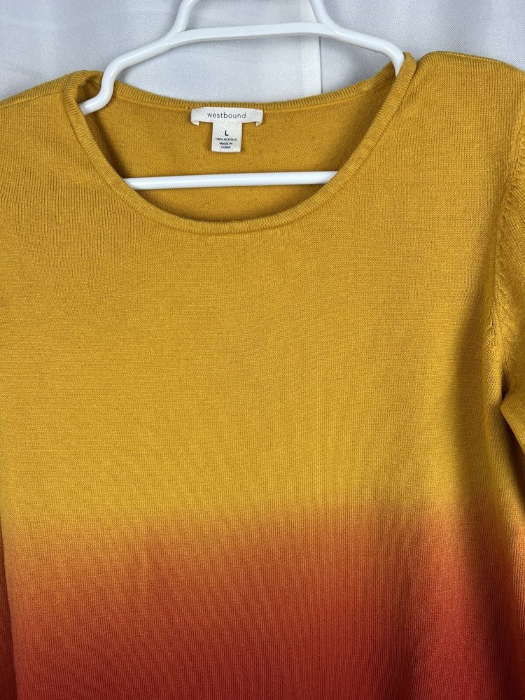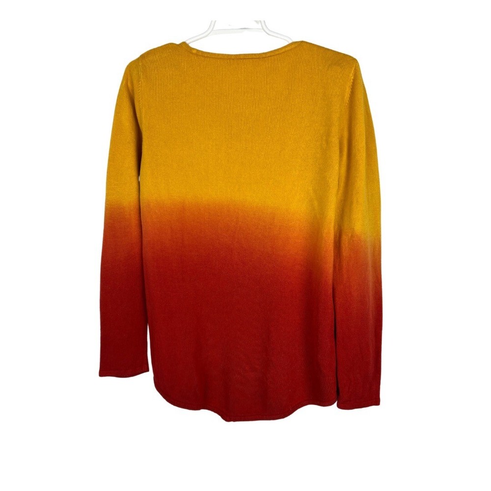 Gold to red ombré sweater orange asymmetrical soft dip dye sunset Size large Front and back come to a point Good condition. There is slight pilling Very soft