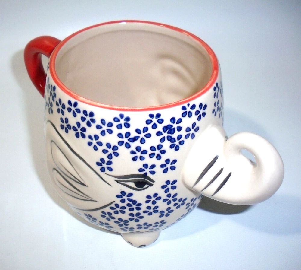 Yokohama Studio Japan Ceramic & Enamel Blue Floral Elephant Mug Cup 20oz. Pre-owned in excellent like new condition. No chips, scratches, utensil marks, color loss, stains, or wear of any kind. Great cocoa mug.