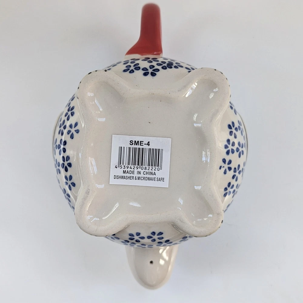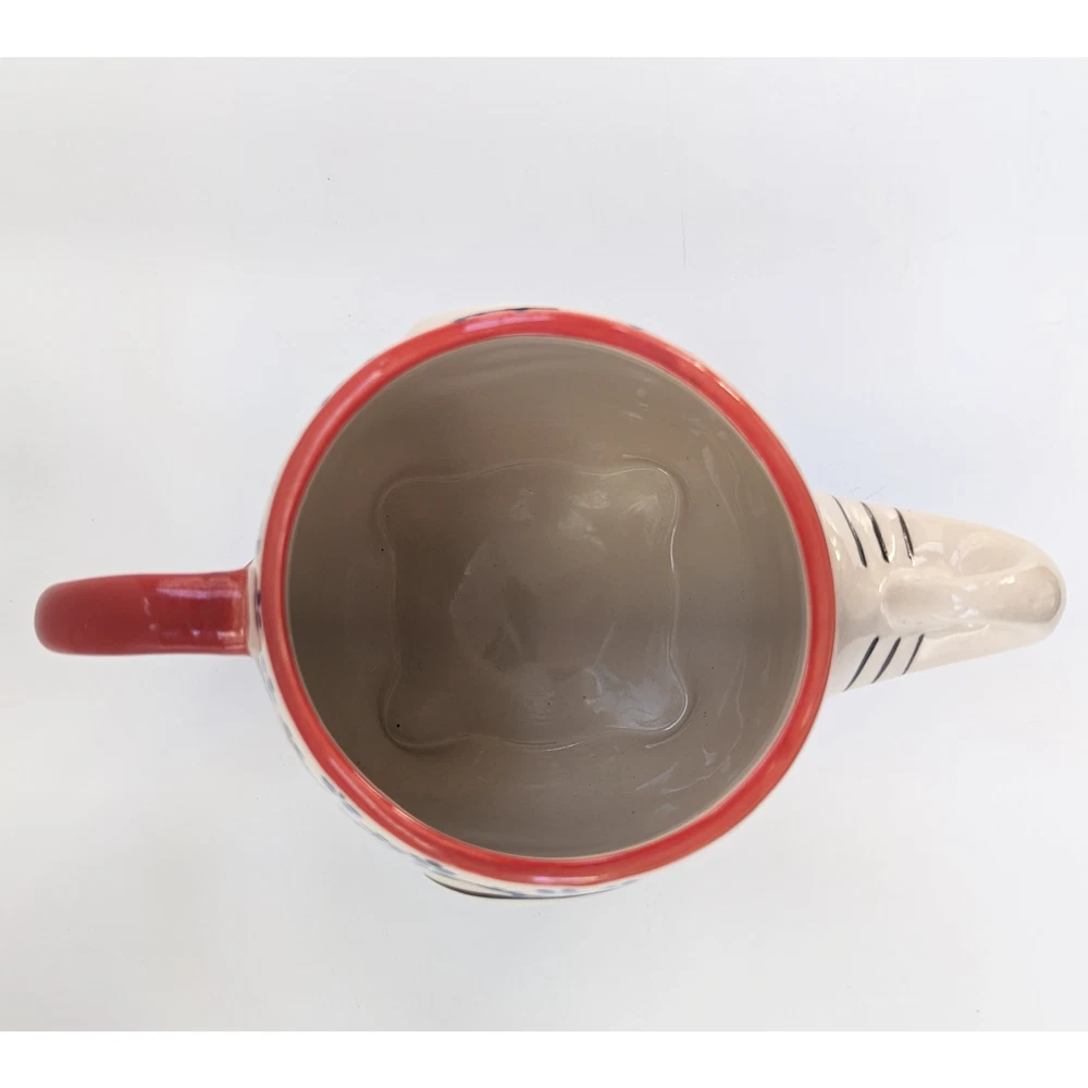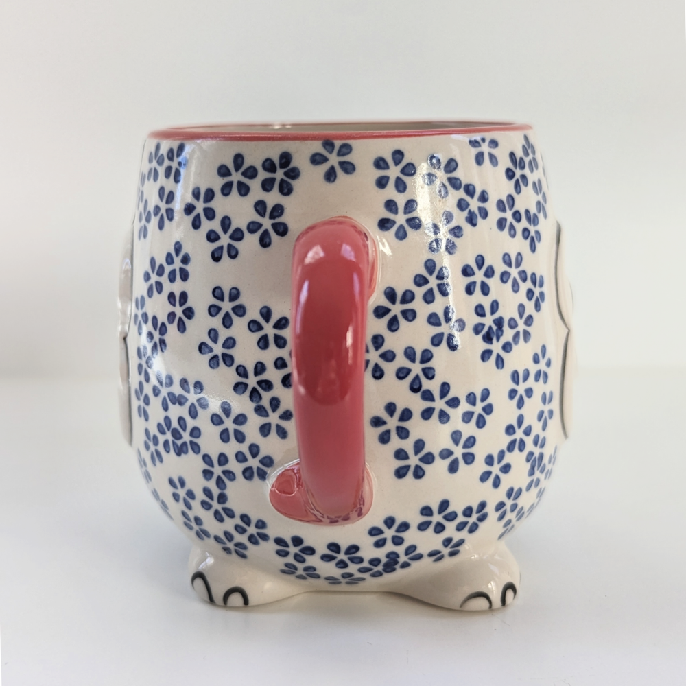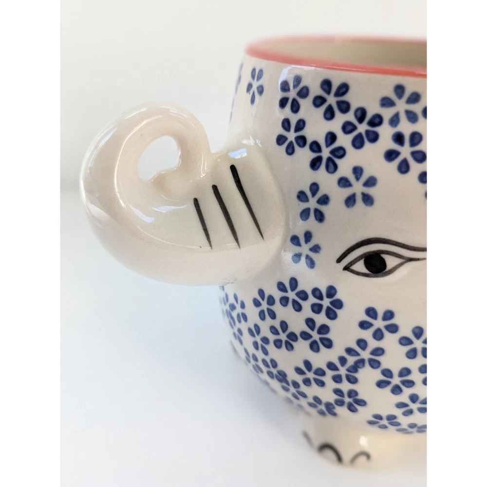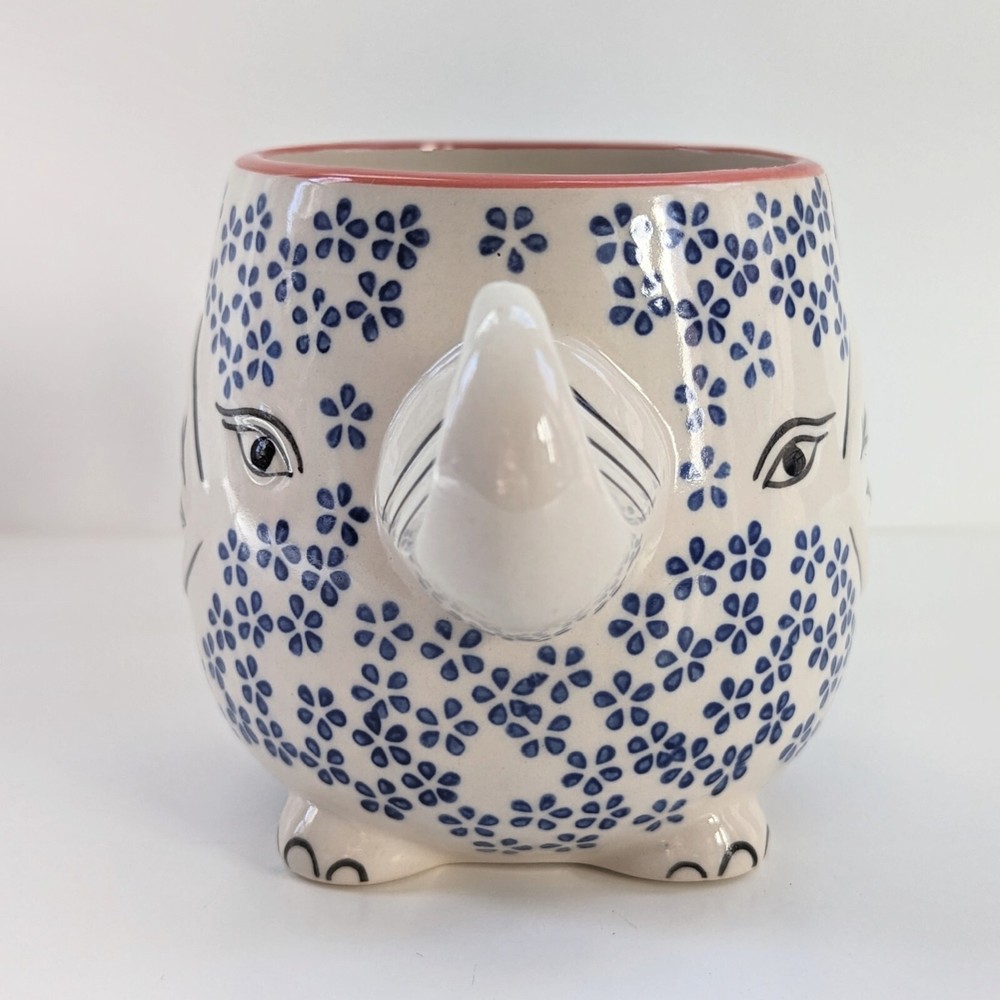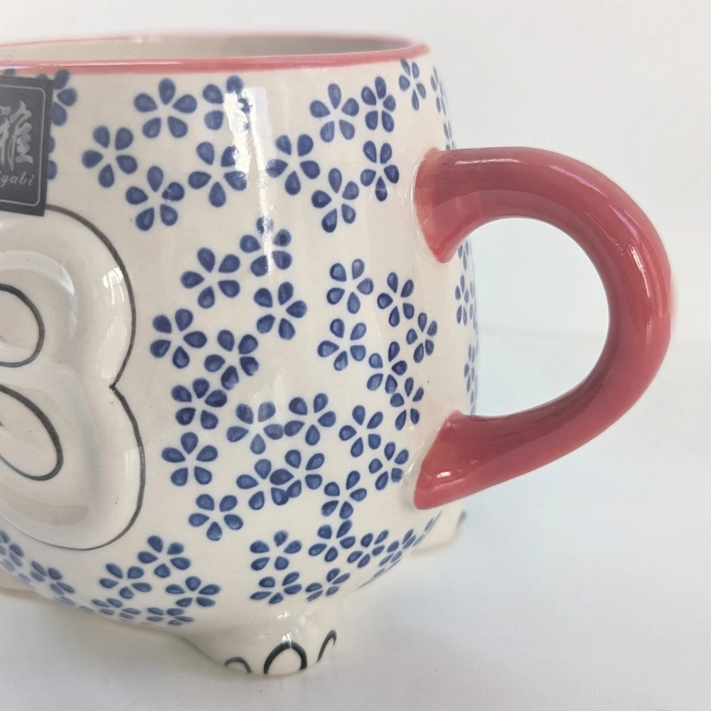 Reproduction of Yokohama Studio hand painted elephant mug. Please note, this is not an original but a reproduction made in China by the brand Miyabi. Very difficult to tell the difference. The only discernable difference is the Yokohama stamp on the bottom, which this one does not have. This unique elephant pattern mug with Brunnera flower prints all around and red rim and handle has a 3D depth to its design. Capacity: 22 oz Material: Ceramic Care: Dishwasher & Microwave Safe Four available.