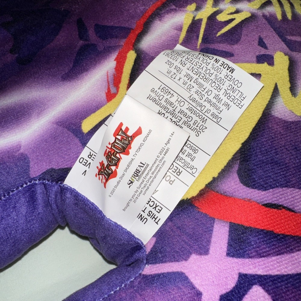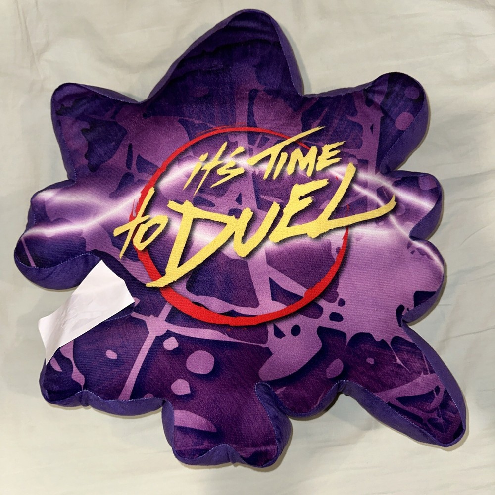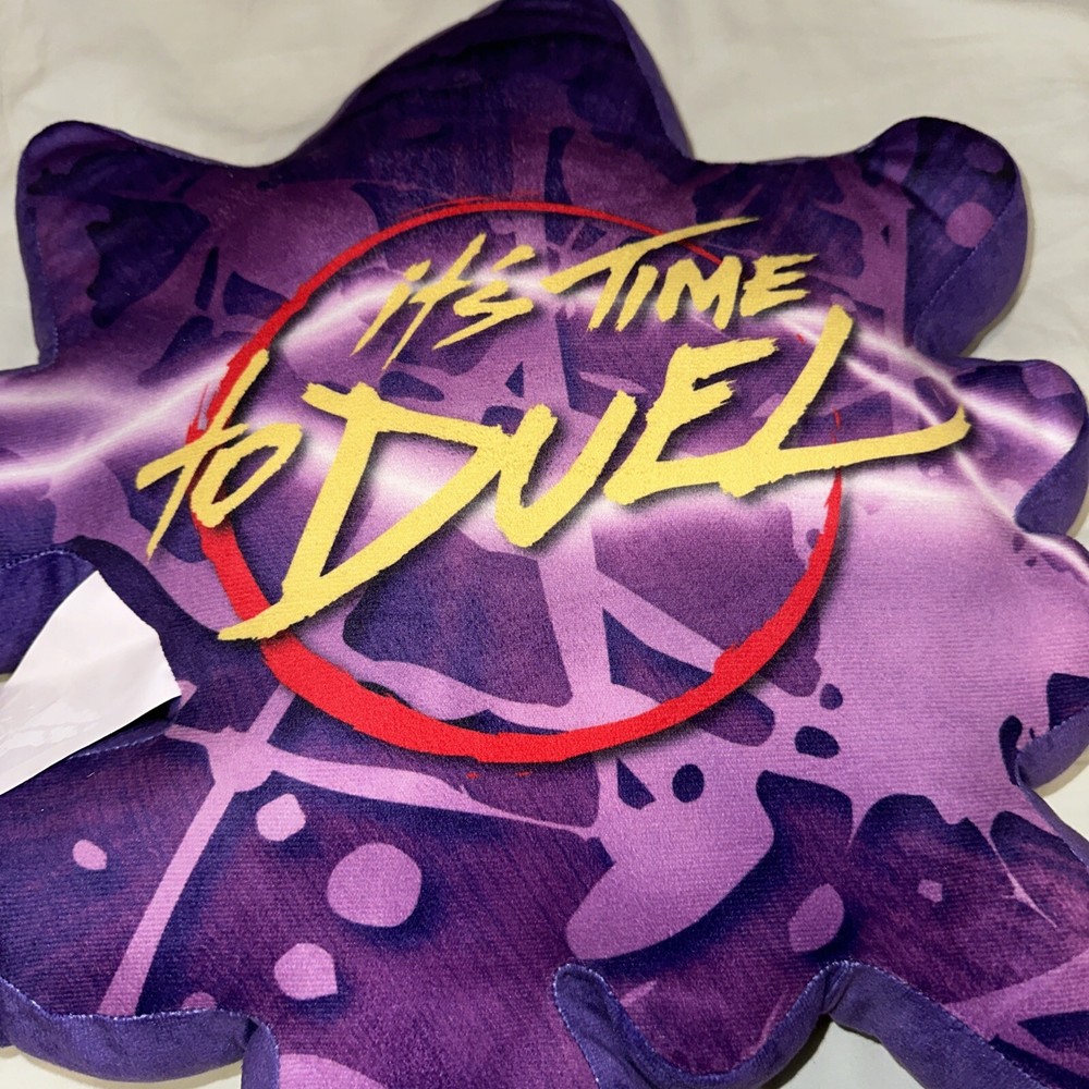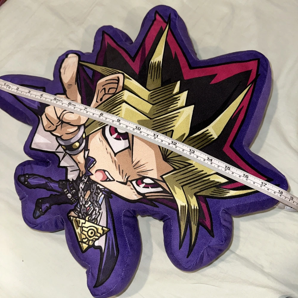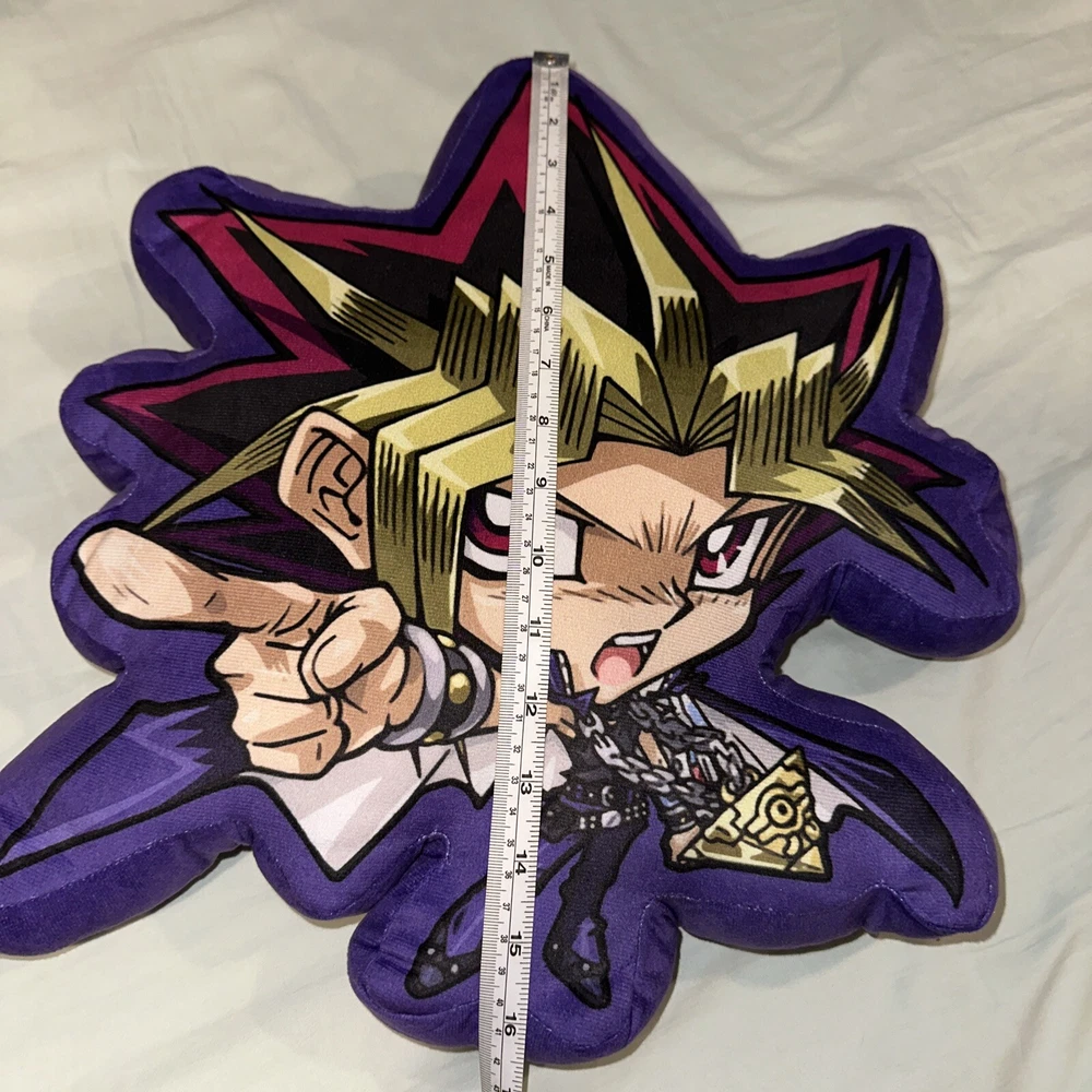Purple plush pillow with Yami Yugi anime cartoon printed on front. “It’s time to Duel” slogan on back. All measurements included in photos Gently used with no signs of wear. Vibrant colors from the Yu-Gi-Oh anime show Item sold as is and as pictured.