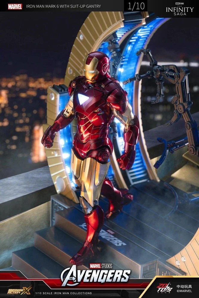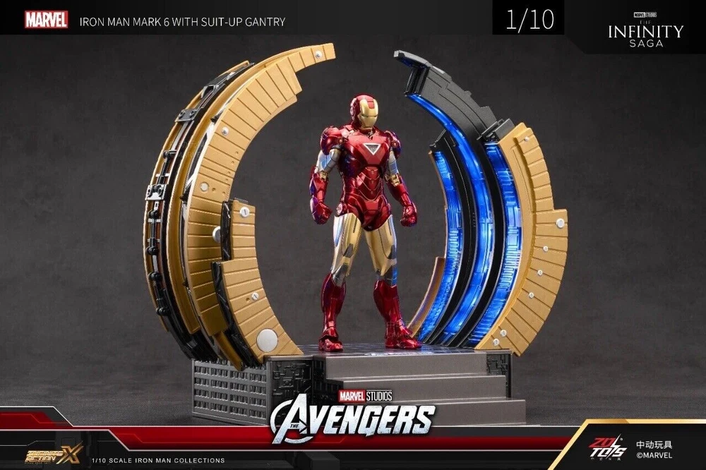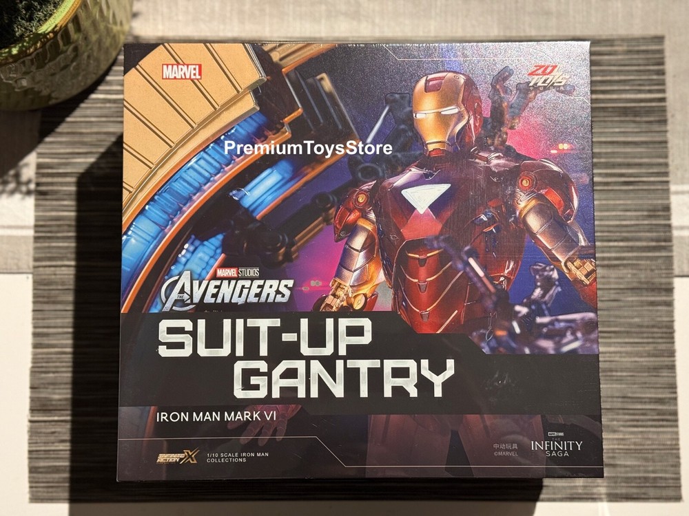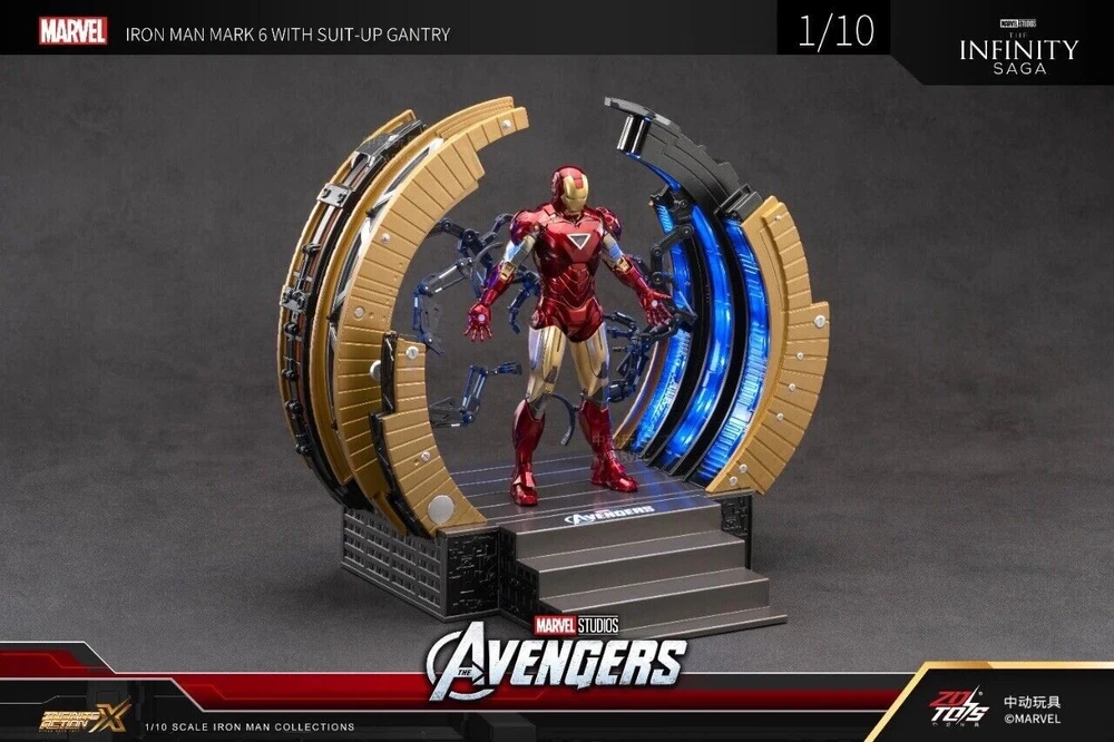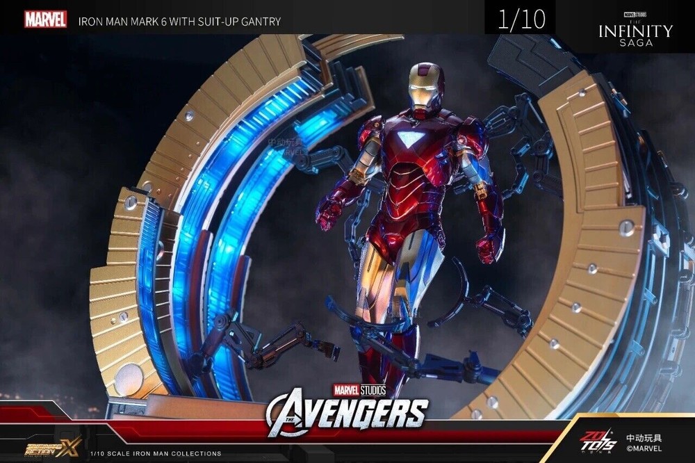ZD Toys Iron Man Suit-Up Gantry Mark VI Avengers 1/10 Scale Marvel *NEW* ZD Toys is a Chinese based toy company and manufacturer, and these particular products were licensed and authorized by Marvel studios. 100% guaranteed authentic and new/ unused product. Circular armor dismantling platform can emit light+MK6 cannot emit light Same day shipping. No cancellation nor return is acceptable once shipment is being processed.