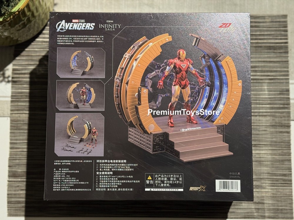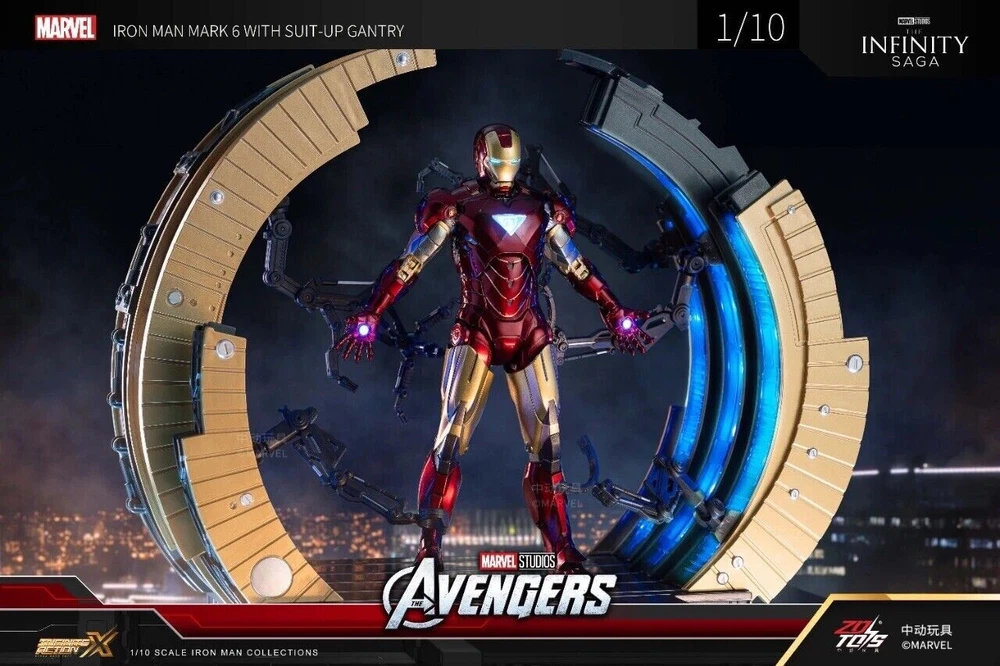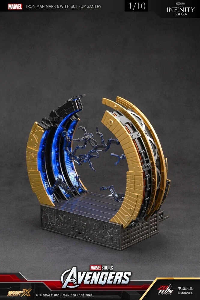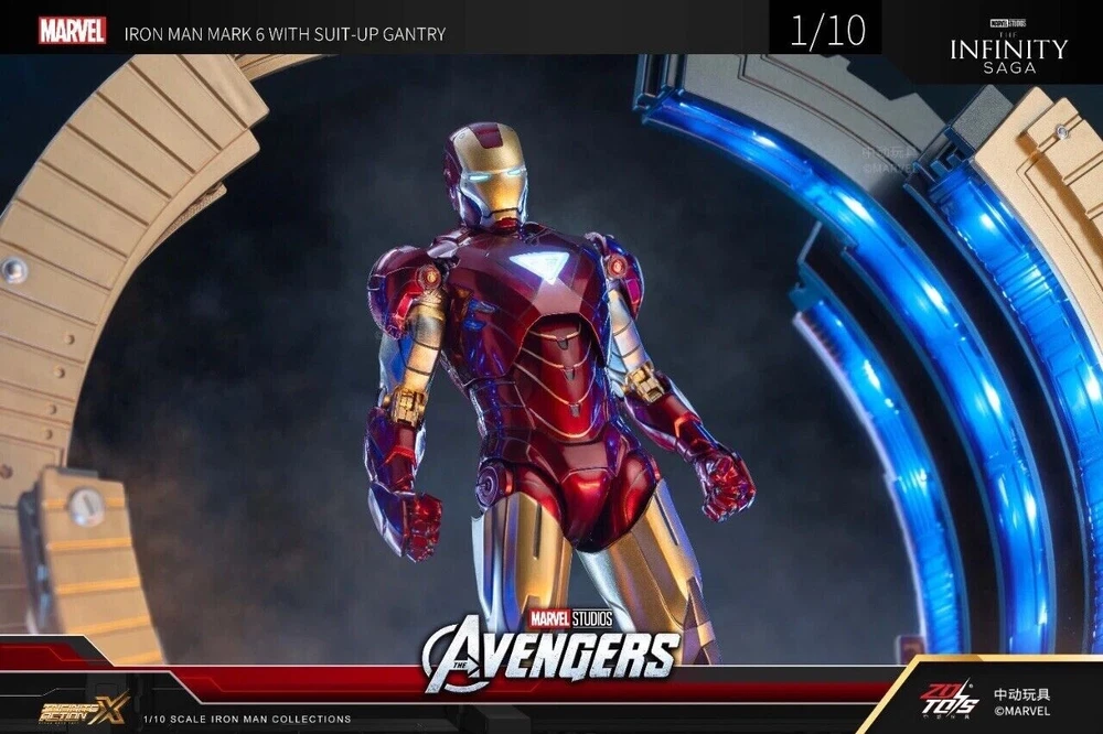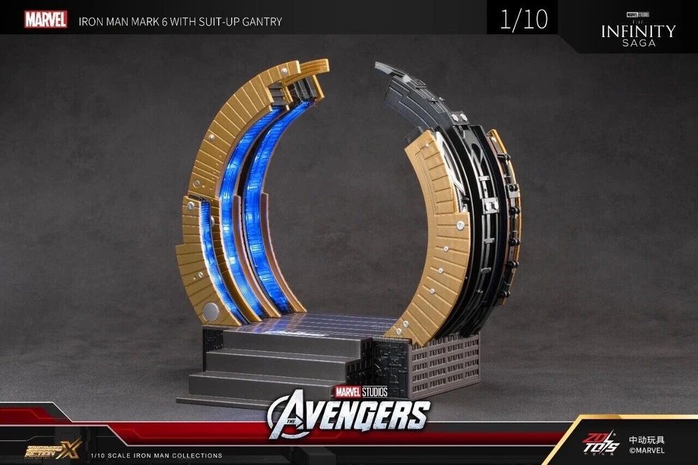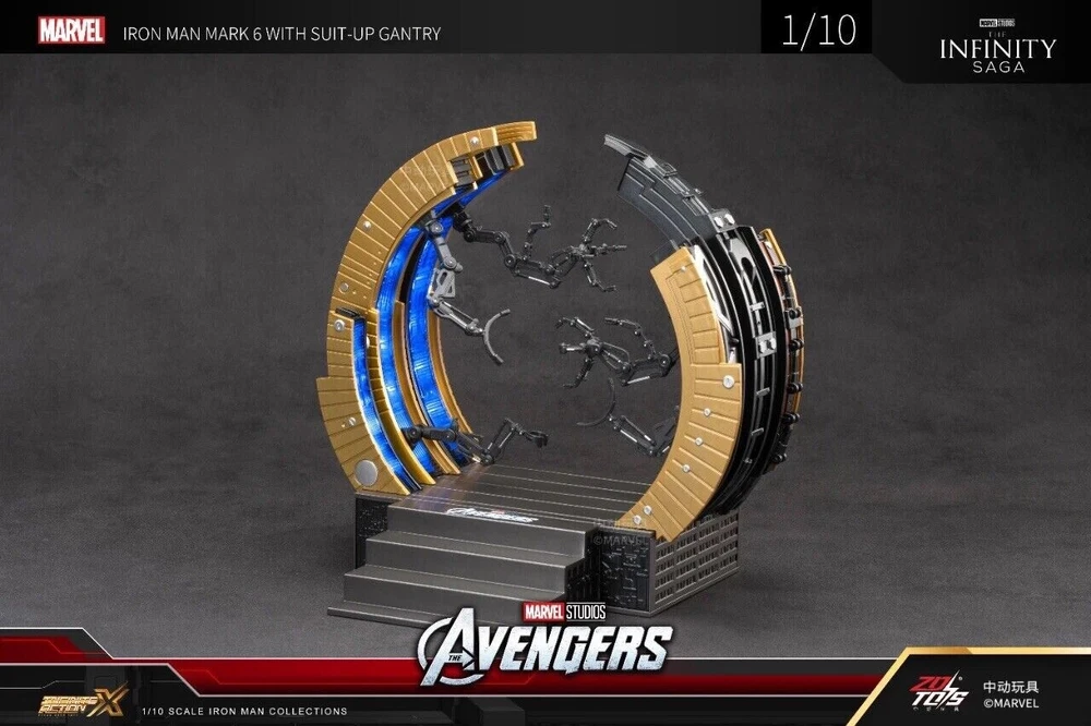 ZD Toys Iron Man Suit-Up Gantry Mark VI Avengers 1/10 Scale Marvel *NEW* ZD Toys is a Chinese based toy company and manufacturer, and these particular products were licensed and authorized by Marvel studios. 100% guaranteed authentic and new/ unused product. Circular armor dismantling platform can emit light+MK6 cannot emit light Same day shipping. No cancellation nor return is acceptable once shipment is being processed.