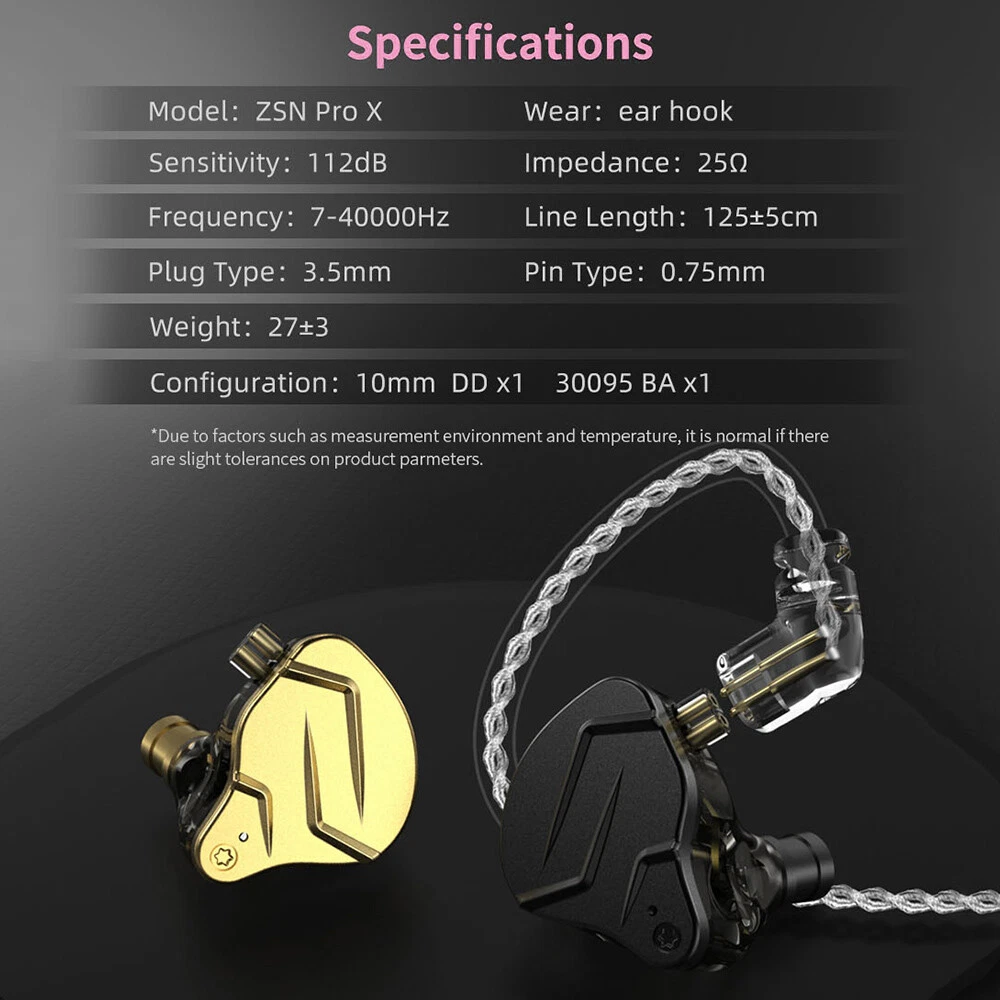 Features: 3.5mm wired earphone, and , ear hook design reduces the burden of the ear, can ensure long-term wear comfort. 1BA+1DD drive, with strong dynamic bass and high sensitivity treble. The combination of metal and resin, , exquisite appearance design, metal texture and fashionable streamline aesthetics coexist. It adopts 4 strands of 100 core high-quality plated wire, and double 0.75mm -plated pins. The detachable replacement cable is soft, smooth, and without . 3.5mm -plated , can oxidation and reduce signal loss, provide better audio transmission, suitable for almost all 3.5mm audio equipment. Specifications: Brand Name: ZSN X Type: In-ear Earphone Earphone type: In-ear Impedance: 25Ω Earphone sensitivity: 112dB/mW Frequency : 7-40000Hz Cable Length: 1.25m±5cm Color: Black/(Optional) Earphone interface: 0.75mm Whether with mic: Can choose Driver unit: 10mm 1DD+30095 1BA driver unit Package Size: 10 * 7 * 3cm / 3.9 * 2.8 * 1.2in Package Weight: 80g / 2.8oz Package List: V7782G-1 1 * ZSN X Wired Headphones 1 * User Manual 3 * Pairs of Earmuffs (S/M/L)