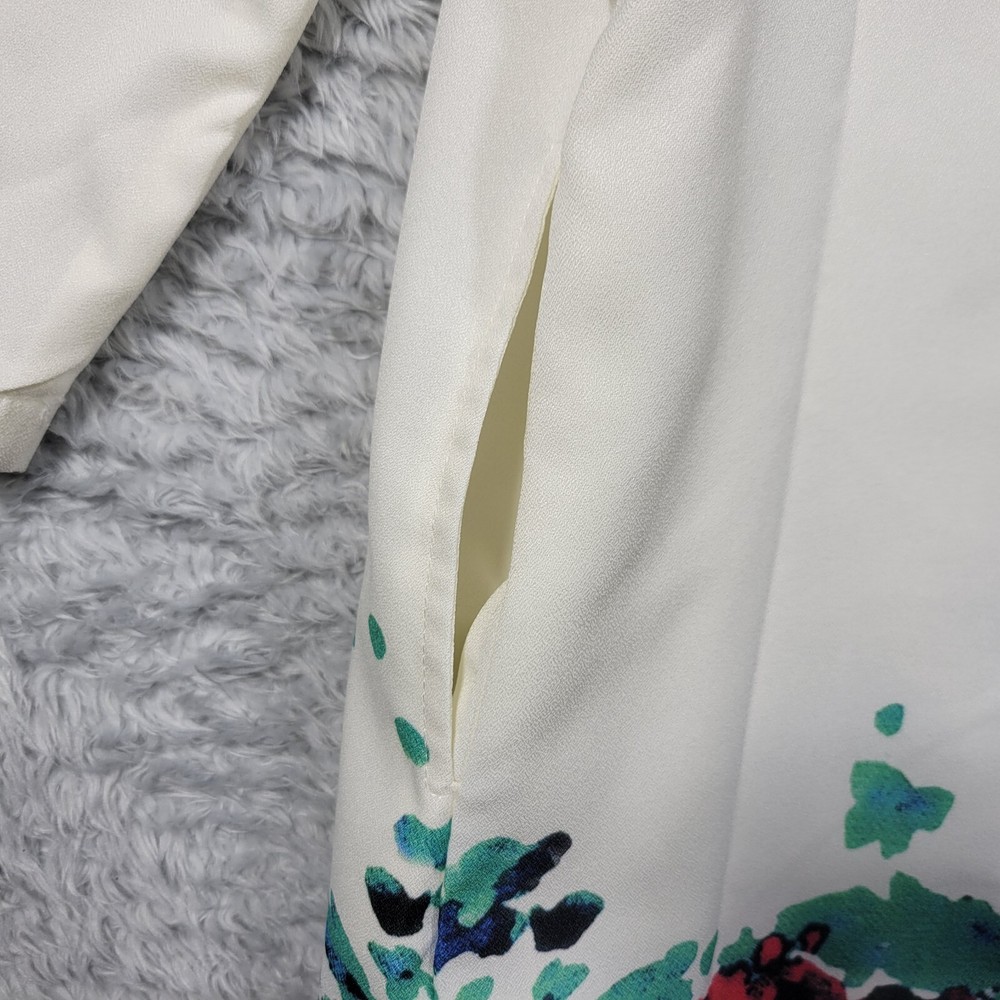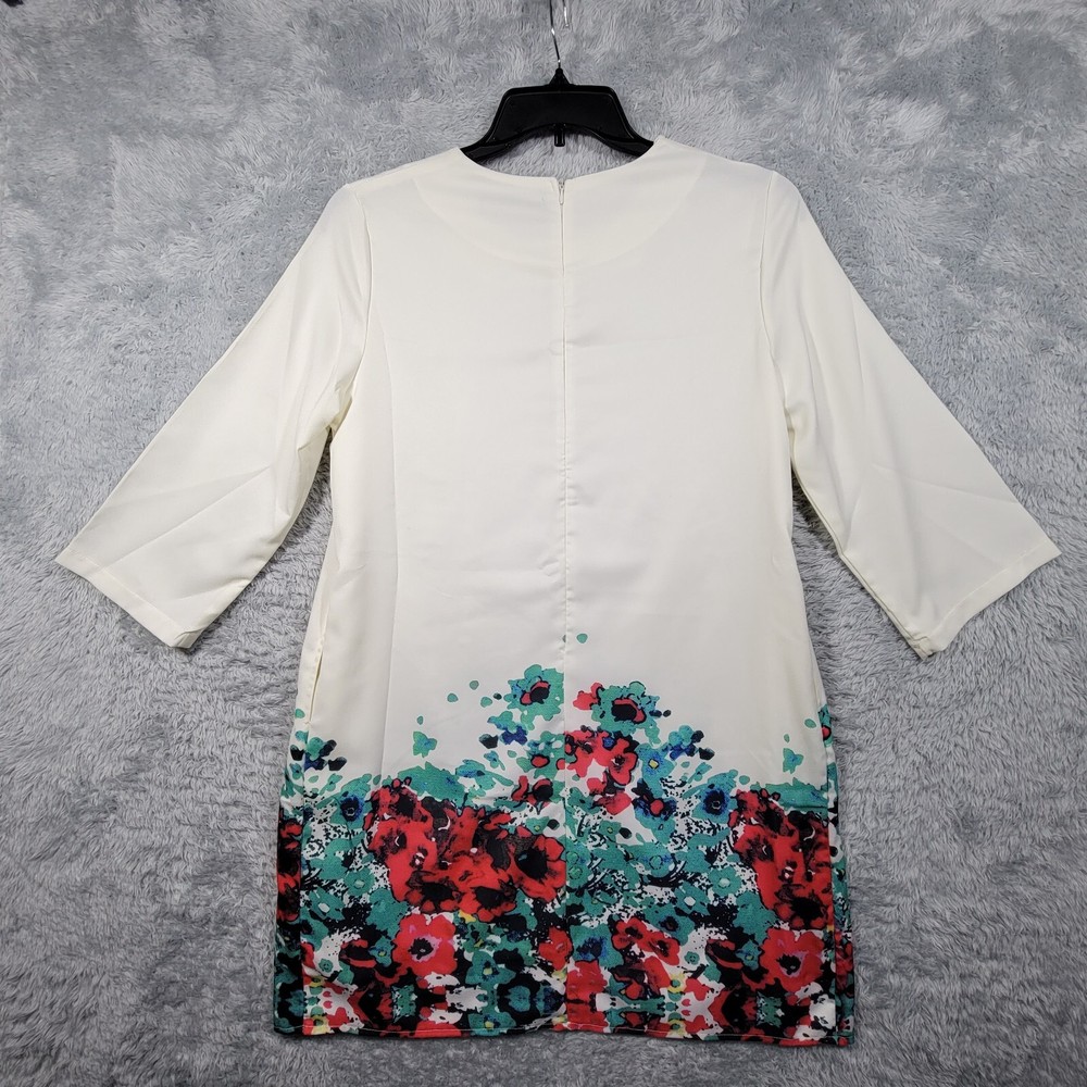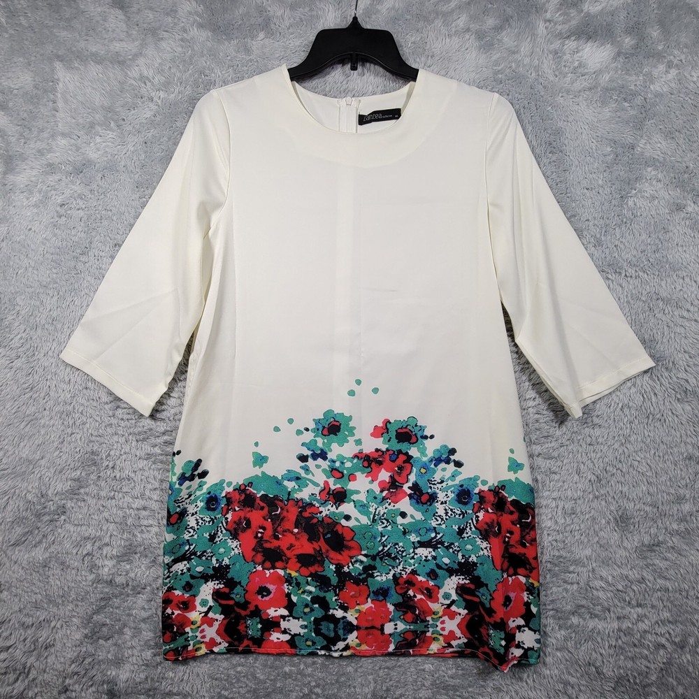 Zanaea Dress Womens XL Ivory Floral Dipped 3/4 Sleeve Lined Pockets - Please see pictures for condition and measurements for fit. - Please compare measurements to one of your own to insure fit. - Measurements taken: ♦ Shirt: pit to pit & shoulder to hem ♣ Pants/Jeans: waist, rise, & inseam ♠ Skirt: waist & Length ♥ Shorts: waist, rise, & inseam - Clothing has been properly cleaned if needed. - Super Fast Shipping, combine shipping available. - I ship out the next business day with a tracking number for confirmation! - I am happy to answer your questions!
