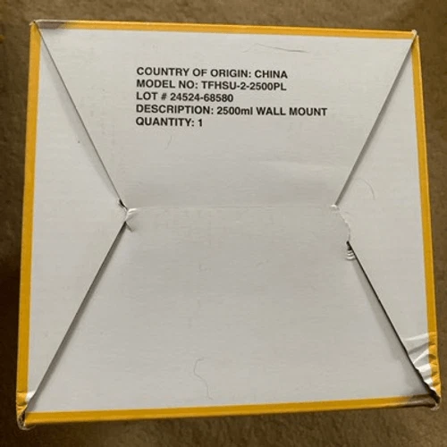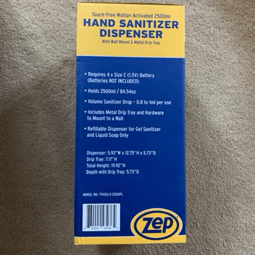Zep Hand Sanitizer Dispenser XL Capacity With Wall Mount & Dip Tray. Model TFHSU-2-2500PL. New in box. 2500 ml. Trap Door Refill Cover, Automatic Counter, LED Light Indicator, Touchless Dispenser. Batteries not included. Box has slight damage at bottom. (1)