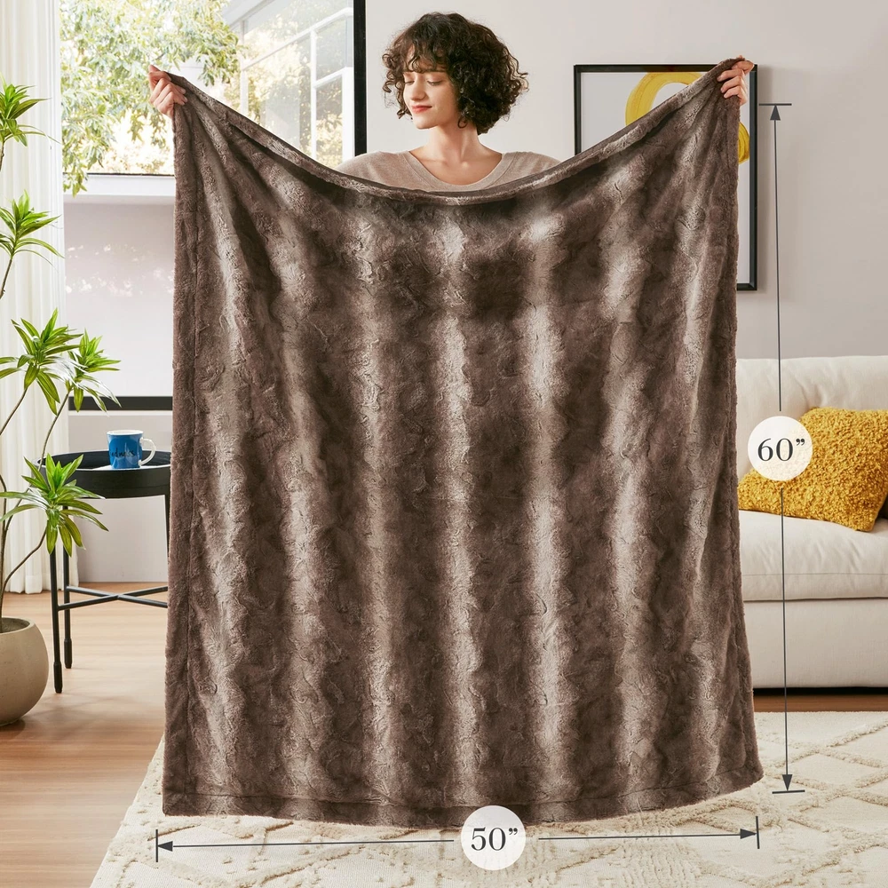 The Zuri Blanket features a luxuriously soft faux fur and reverses to a solid luxe microfur. A warm blanket and a glamorous accent to your home with ’s Zuri Oversized Faux Fur Throw. Exceptionally soft faux fur mimics the warmth and texture of real fur, while the marble print gives the throw a beautifully stunning look. 1 Throw: 60"W x 70"L Care instructions: machine washable. Minor shedding is expected with faux fur material and should subside after 3-4 washes