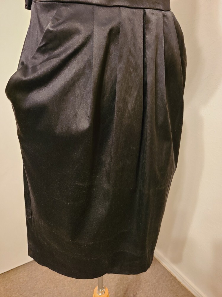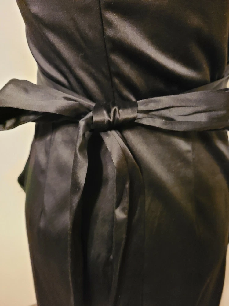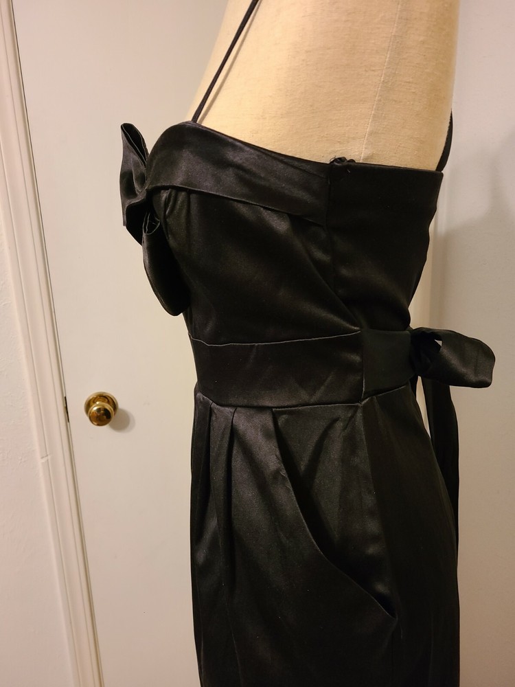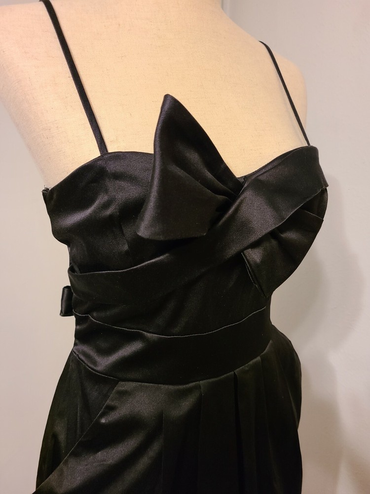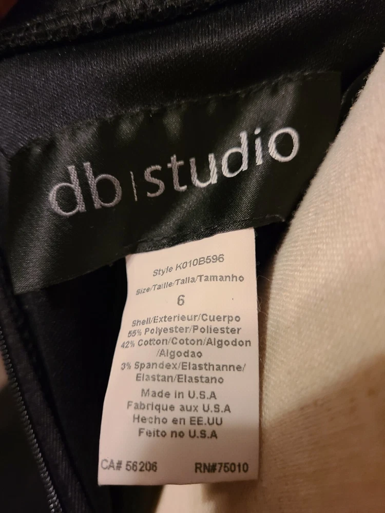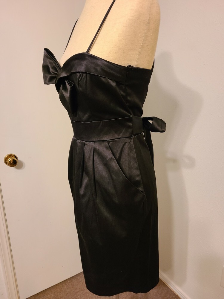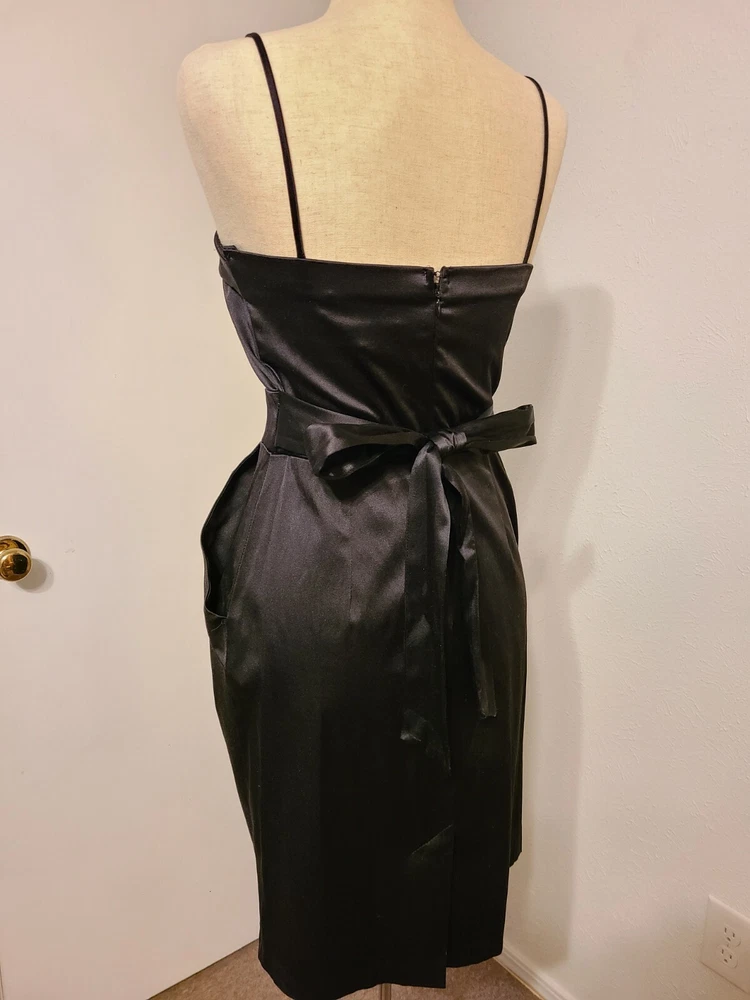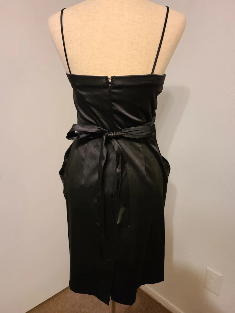 DB Studio (David's Bridal) Women's Wedding Prom Party Spaghetti Strap Stretch Black Satin DRESS Size 6 Features spaghetti strap design, center front bow accent, tied back waist, 2 large front side pockets, softy pleated front waist (very flattering), back slit, back hidden nylon zip with hook and eye closure, straight hem, stretch satin fabric, and hanger loops. Fabric: 55% poly, 42% cotton, 3% spandex. This fabric is fabulous-has the great shiny finish of satin, but with the added bonus of breathable cotton, and stretch of spandex. Dry Clean Only Measures while laying flat: waist 14" length 28" arm pit to arm pit 16" hip 18.5" back slit 6" In very nice preowned condition with no holes, tears, or stains. So much design and thought has gone into this dress. And of course David's Bridal quality. Made in the USA! Would be a great dress to wear to a wedding, cocktail party, prom, or cruise. Dress reminds me of Marilyn Monroe! Will never be out of style. Classic design. Smoke-free home Thanks for looking! God bless! FRC