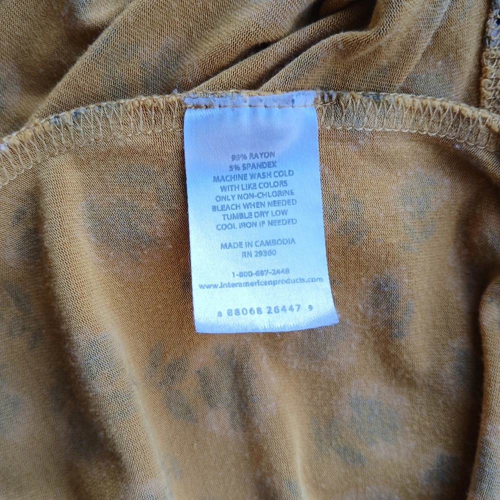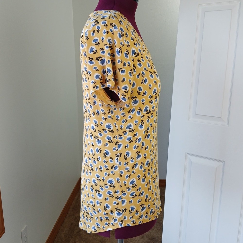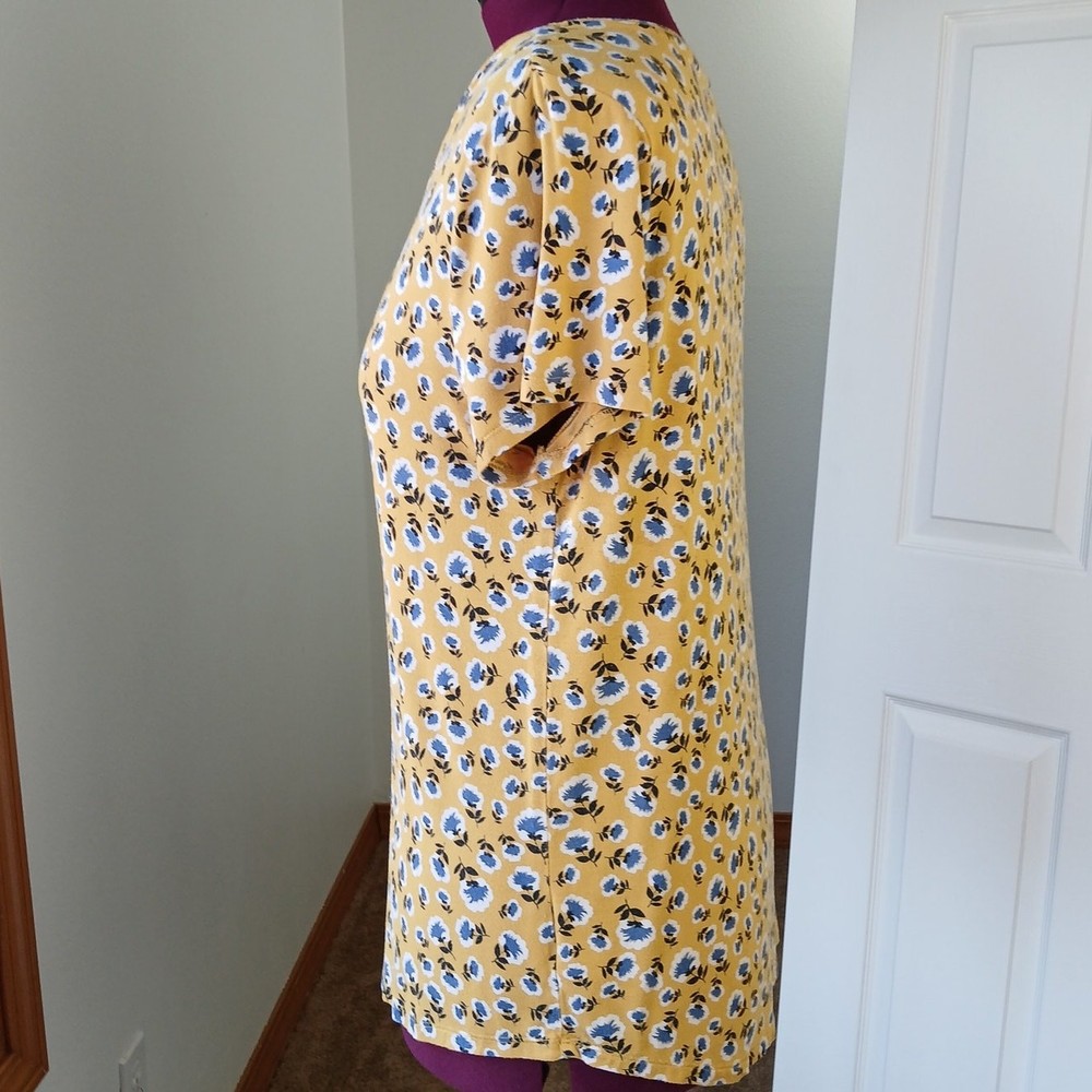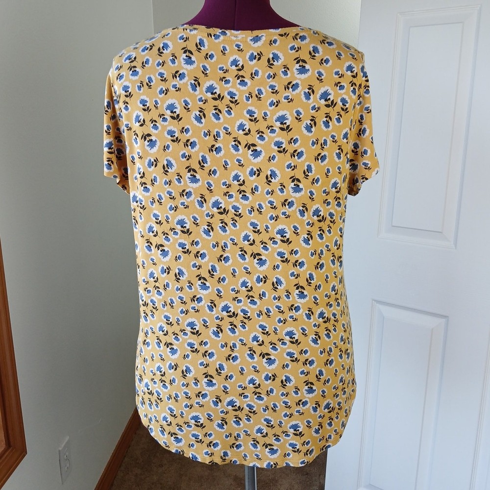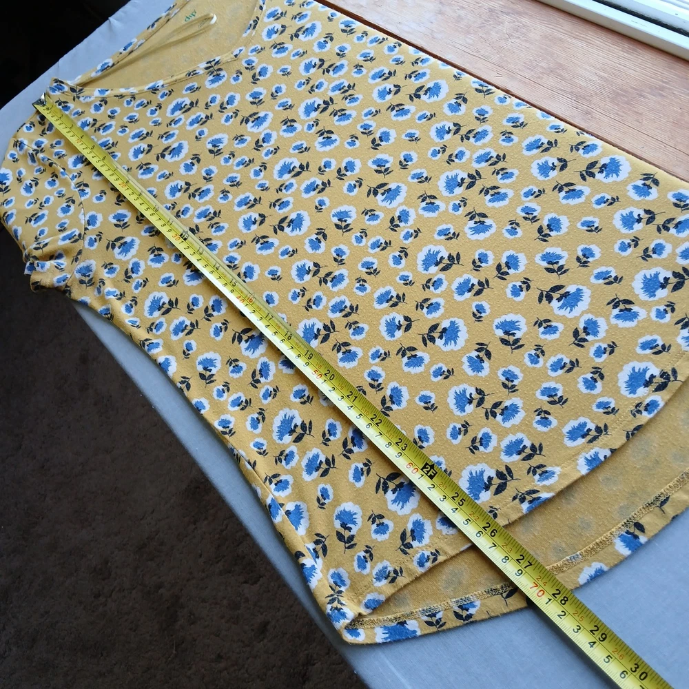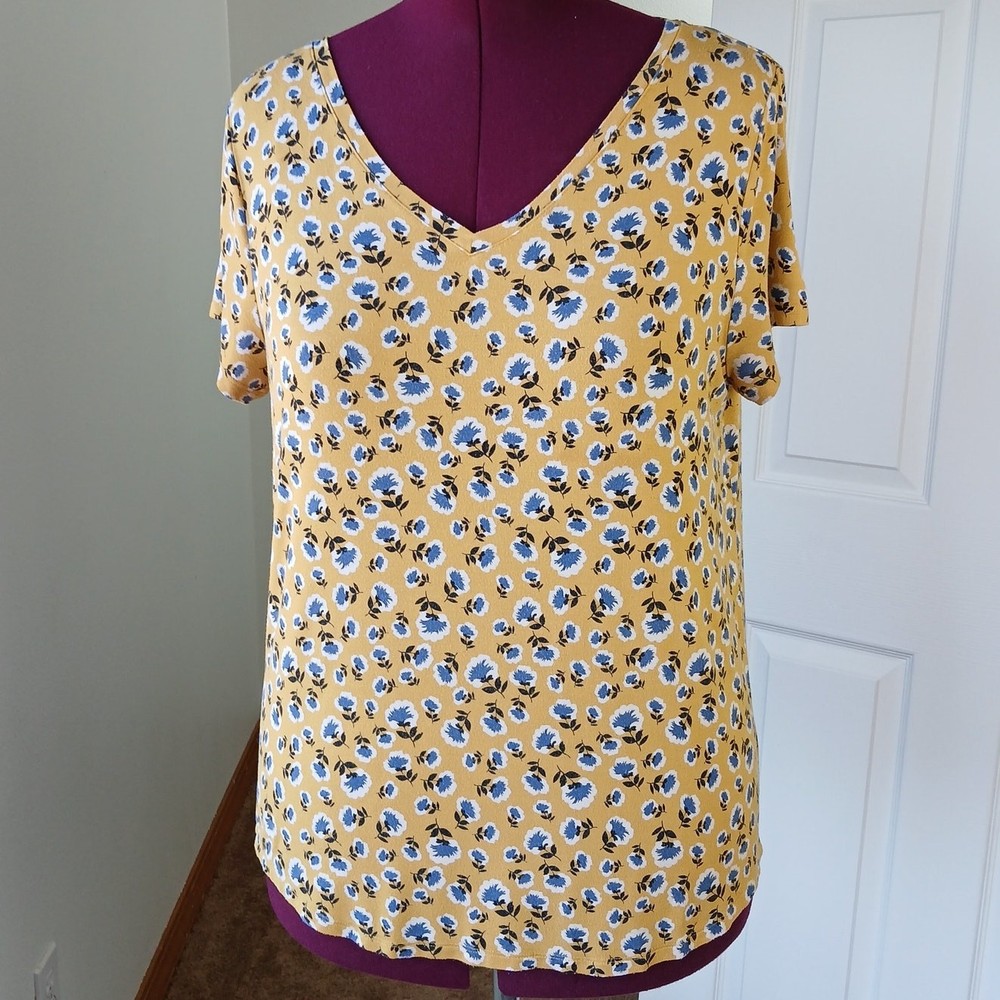 <![CDATA[<div>dip Classic Yellow Floral Print V-neck Tee size Large basic generic T-shirt mustard yellow blue and white floral print V-neck short sleeves relaxed fit comfy high-low hemline, slightly longer in back Pre-loved; EUC, excellent used condition 95% rayon 5% spandex machine wash approximate measurements taken while laying flat: chest 21" length 27" (see pics) questions? please ask!