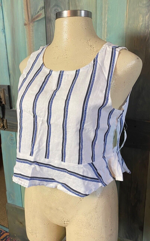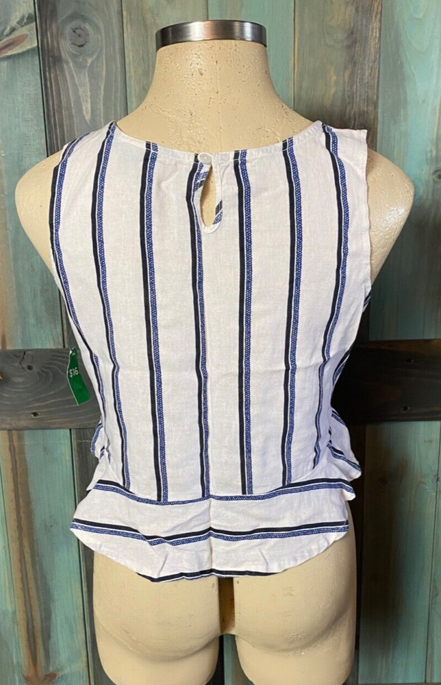 dip White Blue Vertical Stripes Ruffle Bottom Hem Cropped Back Keyhole Button Tank Top 53% Linen 47% Rayon T op is in great New With Tags condition , see pictures and measurements. Size XL ** **Please note: All companies make clothes differently. I list in all auctions what size they say it is, I will also sometimes add other sizes that it is closer to in the title, as well as provide measurements to make sure it will fit you! Easiest way to do this is take an item that fits you well and measure it laying flat and compare it to what you see here. That insures you have a guaranteed fit!! Measures, Laying Flat, Not Stretched, One Way Across NO STRETCH Armpit to Armpit = 20 1/2" Across Bottom Hem = 24" Shoulder to Bottom Hem = 20" SHIPPING I will ship your item within one business day after auctions end under most circumstances. I am happy to combine shipping and will do so whenever I can, just let me know what items and I will let you know how much!! I always try to find the cheapest shipping !! I do my best to ship quickly, once it leaves me I can not control how long it is taking but I will check on item if you feel it may be lost. Please contact me if you have any questions regarding shipping! ITEM RECEIVED & FEEDBACK I ALWAYS want my customers to be happy. If you are not satisfied with an item in any way PLEASE email me within 3 days of receiving item. I am always willing to work something out!! Please contact me prior to leaving feedback should you have any issues with your purchase and I will always do what I can to make you happy!! Thank you so much for looking!!