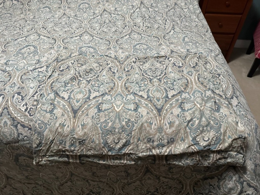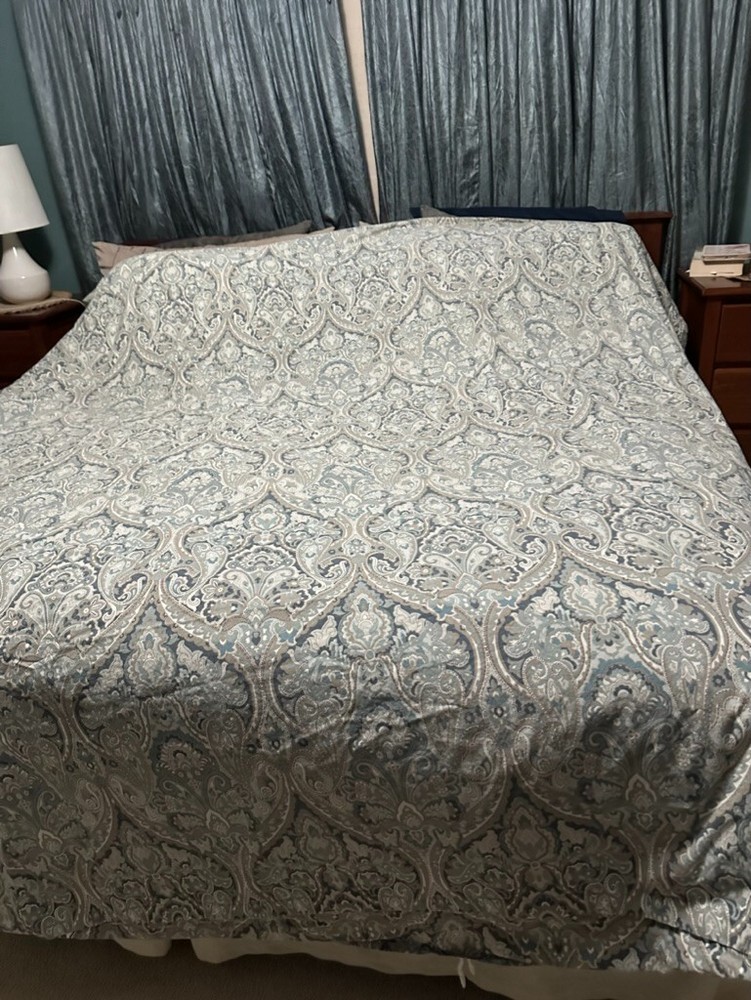 This is a King size duvet cover from Pottery Barn featuring a Paisley pattern in Multicolor. (Beige, Tan, Teal...) The set includes the duvet cover and two matching standard shams. it is a stylish addition to any bedroom decor. Perfect for adding a touch of elegance and personality to your bedding ensemble, this duvet cover is sure to enhance the visual appeal of your bedroom. Button closure and inside ties.