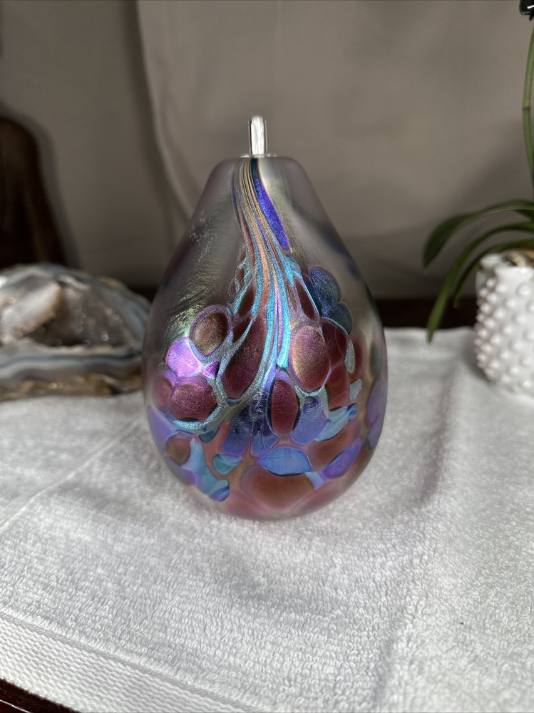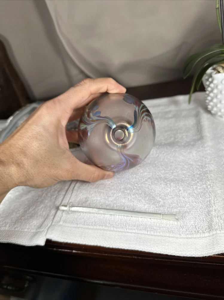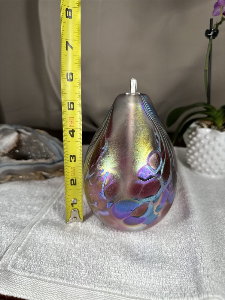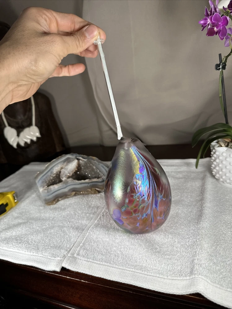 hand blown Maytum studio Art Glass iridescent aurene egg shaped bud vase 1988. Excellent shape/Like New condition/NO flaws