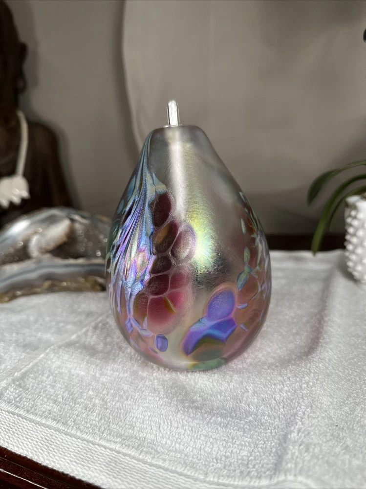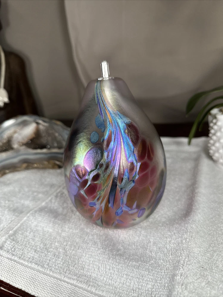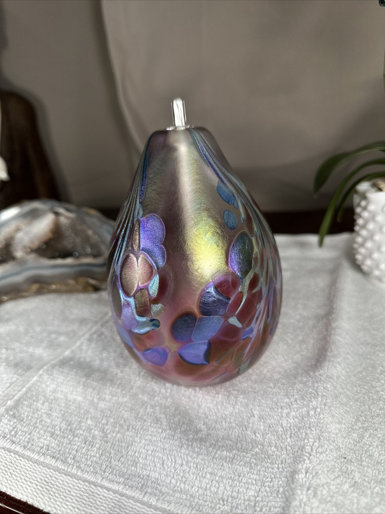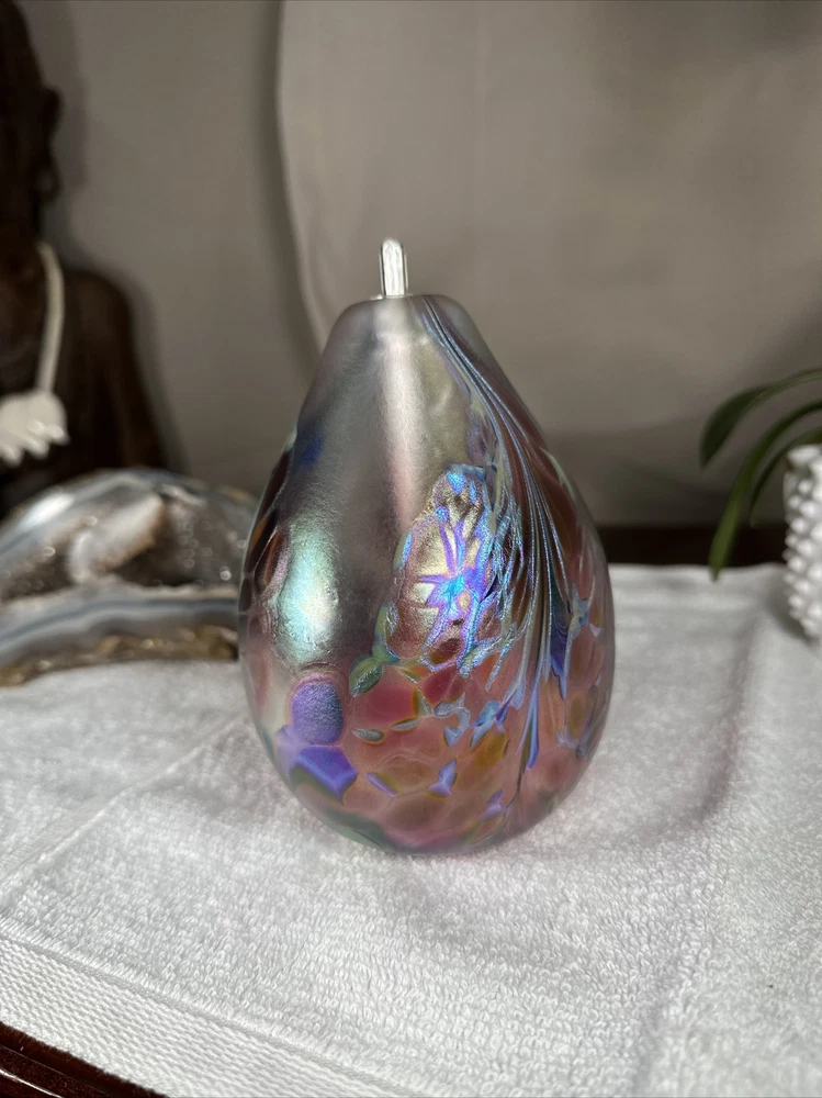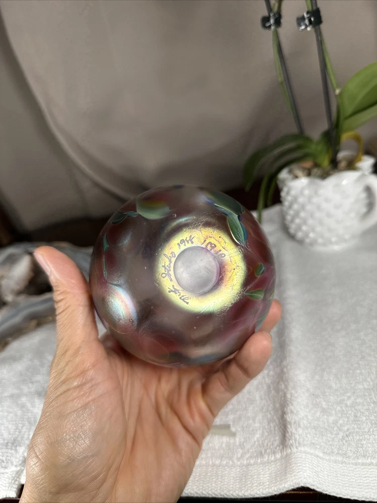 hand blown Maytum studio Art Glass iridescent aurene egg shaped bud vase 1988. Excellent shape/Like New condition/NO flaws