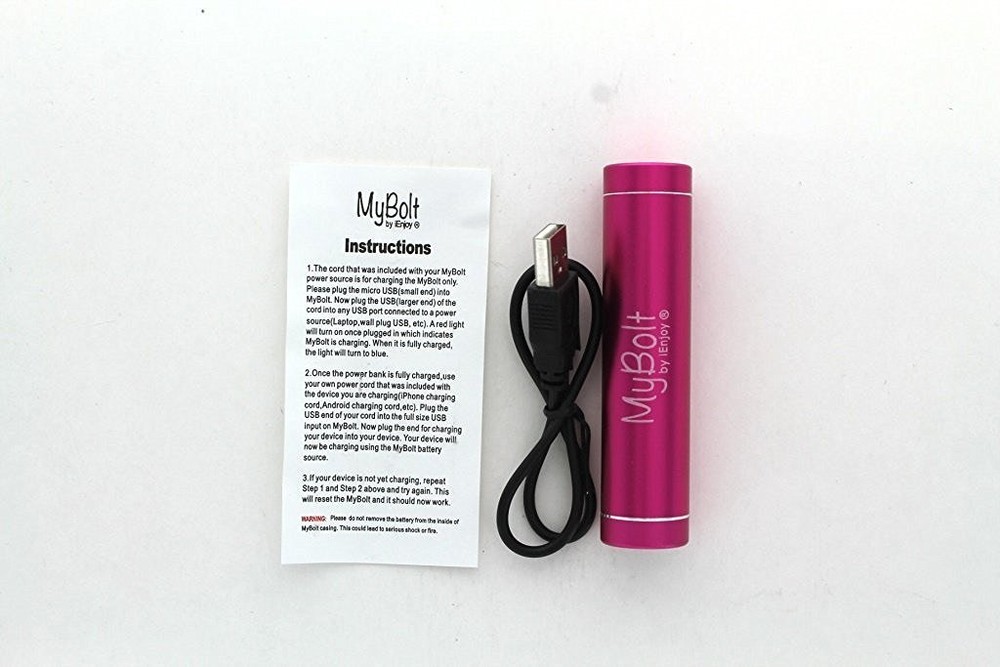 iEnjoy MyBolt Portable USB Flash Charger, Pink LIKE NEW, IN ORIGINAL BOX. Perfect for iPhone, iPad, iPod, BlackBerry, Samsung Galaxy, HTC, e-readers, digital cameras, and other devices USB output and Micro-USB input High capacity: 2600mAh each Adds up to 40 hours of talk time for each charge Includes USB-to-Micro-USB cable for connecting and charging the power banks Product Description Never Run Out of Battery Again! With MyBolt by iEnjoy - Experience a Lightning Bolt of Power for your Smartphone, Tablet, or other Portable Device Anywhere - Anytime! MyBolt Power Bank Flash Chargers sports 2600mAh of power for direct transfer to your USB or Micro-USB rechargeable devices with up to 40 hours of added talk time for your smartphone, plus a lightweight and compact tube design that makes it easy to keep it in your pocket or purse when you stray from home base. Enjoy a bolt of backup power ready for your handheld devices anytime and anywhere with a MyBolt USB external battery. STS4,B17,366878831 z4 LN
