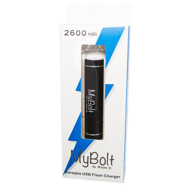 iEnjoy MyBolt Portable USB Flash Charger for iPhone, iPad, iPod & more, Black PRODUCT DETAILS Never Run Out of Battery Again! With MyBolt by iEnjoy - Experience a Lightning Bolt of Power for your Smartphone, Tablet, or other Portable Device Anywhere - Anytime! MyBolt Power Bank Flash Chargers sports 2600mAh of power for direct transfer to your USB or Micro-USB rechargeable devices with up to 40 hours of added talk time for your smartphone, plus a lightweight and compact tube design that makes it easy to keep it in your pocket or purse when you stray from home base. Enjoy a bolt of backup power ready for your handheld devices anytime and anywhere with a MyBolt USB external battery. Perfect for iPhone, iPad, iPod, BlackBerry, Samsung Galaxy, HTC, e-readers, digital cameras, and other devices USB output and Micro-USB input High capacity: 2600mAh each Adds up to 40 hours of talk time for each charge Rechargeable, attractive, and lightweight Great for commuting and traveling Includes USB-to-Micro-USB cable for connecting and charging the power banks Available in your choice of Black, Pink, or Silver One Year Limited Warranty Cable for connecting charger to your smartphone or tablet not included FREE SHIPPING IN THE USA