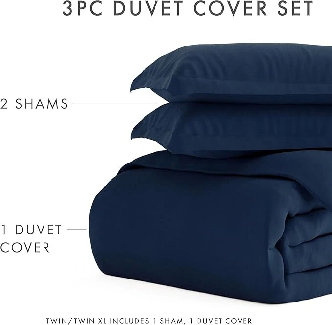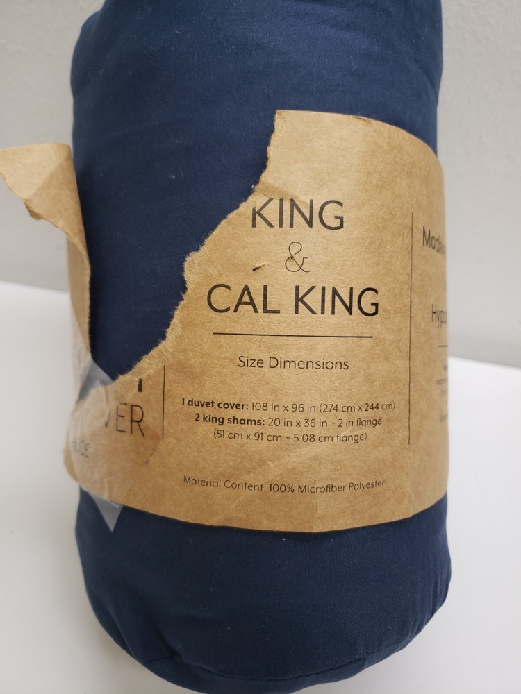IENJOY HOME Elegant Designs Premium Duvet Cover Set King/Cal King Navy 1 Duvet cover: 108’’W x 96’’L 2 Pillow Shams: 20” x 40” (2 " flange) Fade Resistant, Wrinkle Free, No Ironing Necessary Hypoallergenic and Antimicrobial for allergy sufferers and sensitive skin Wicking properties keep you relaxed and dry Superior weave for durability and a buttery-soft touch Zippered Closure Microfiber Machine wash cold, tumble dry low Imported