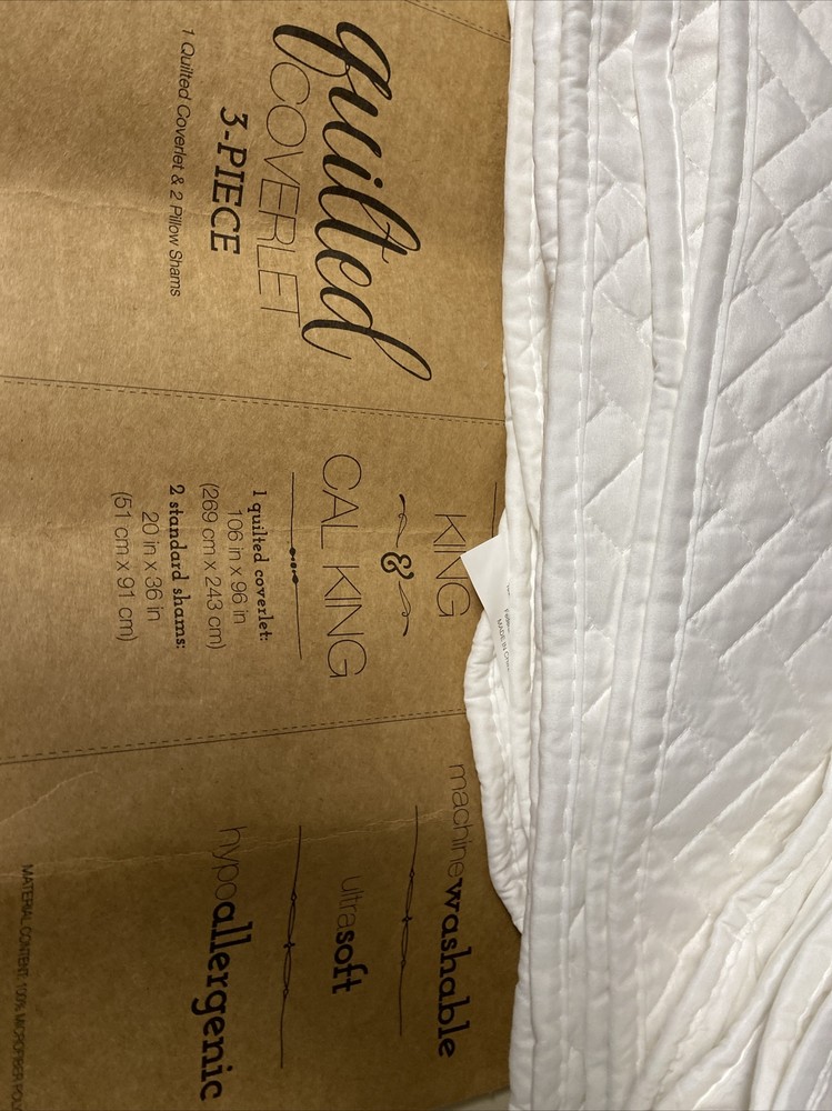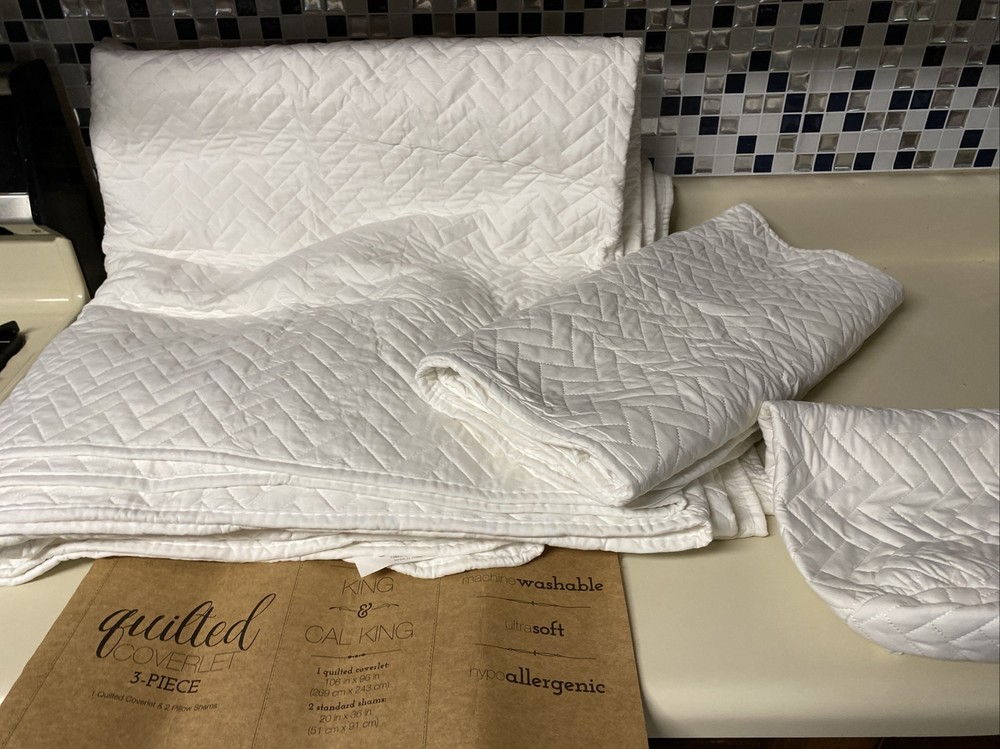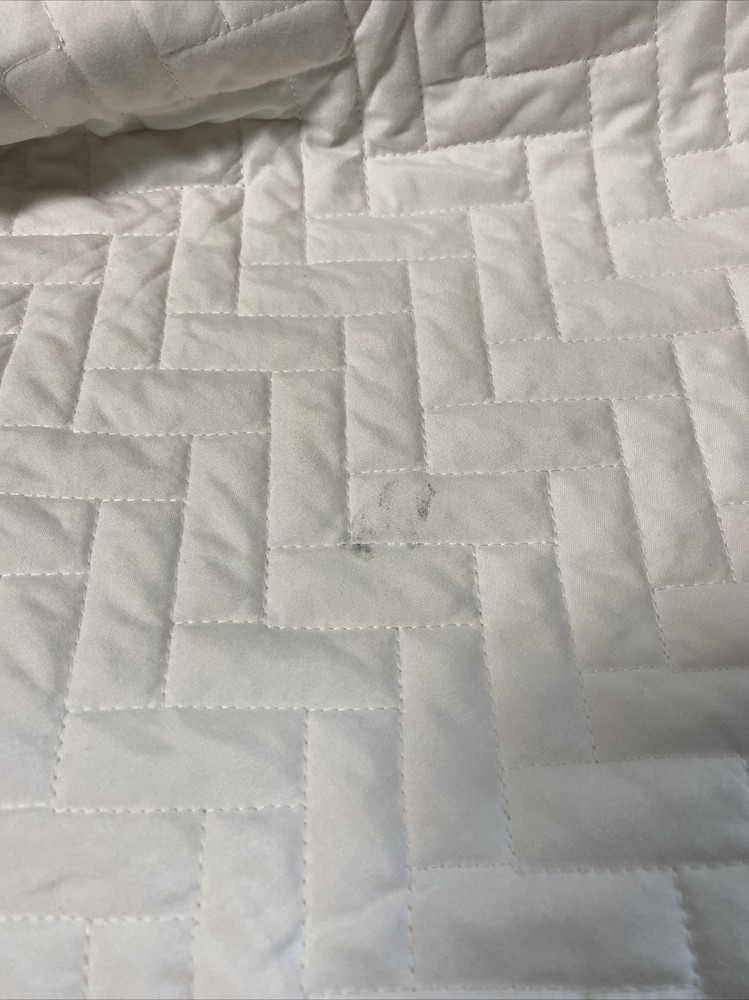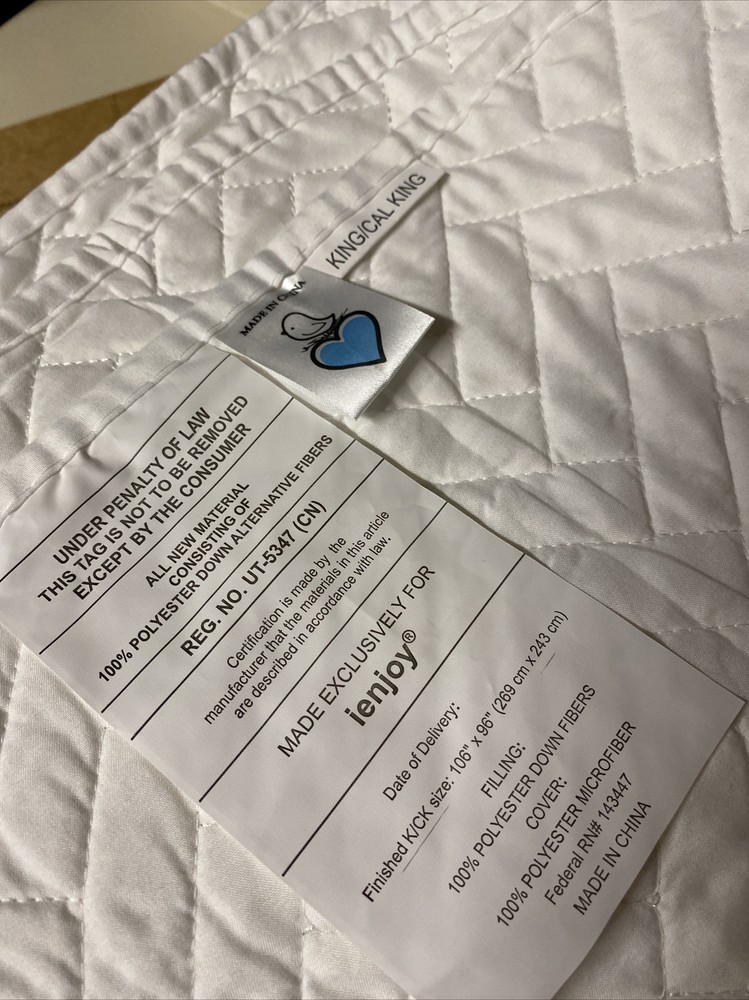 ienjoy Home Quilt w/ Matching Shams Microfiber NWOT. New never used But does hve a few dark spots. Almost looks like dark fabric underneath. Hard to tell Has a few marks from when it came open in pallet shown in pics. Hopefully will wash out Selling as is Comes with two pillow shams Comes with a storage bag