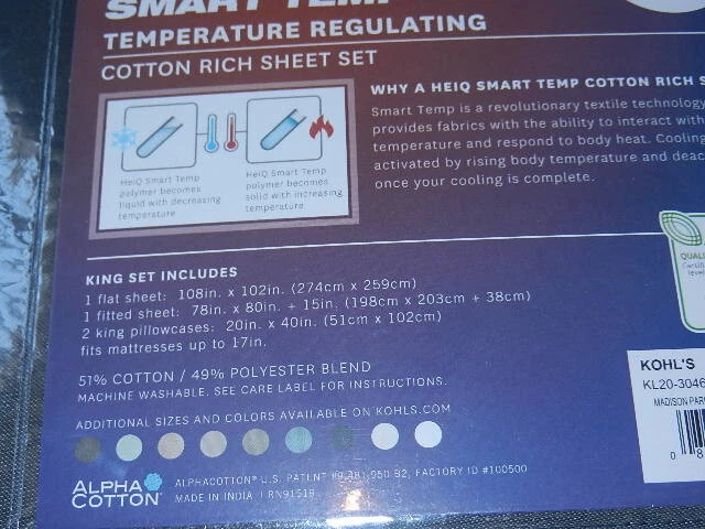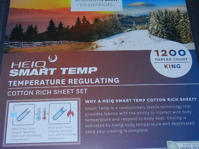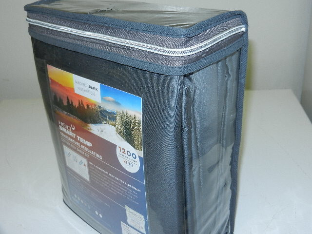 Up for sale is a new Madison Park HeiQ Smart Temp Temperature Regulating King Sheet Set ( color charcoal ). It has never been opened. This set includes: one King flat sheet ( 108" x 102" ) two King pillowcases ( 20" x 40" ) one fitted sheet ( 78" x 80" ) + 15" Please make sure you are looking for King size sheet set, not 'California King' Size before buying. Returns accepts within 30 days only if it is unopened, and except cosmetic damage due to buyer mishandling. Buyer responsible for return shipping. Buyer pays sales tax. 20% restocking fee apply for returns.