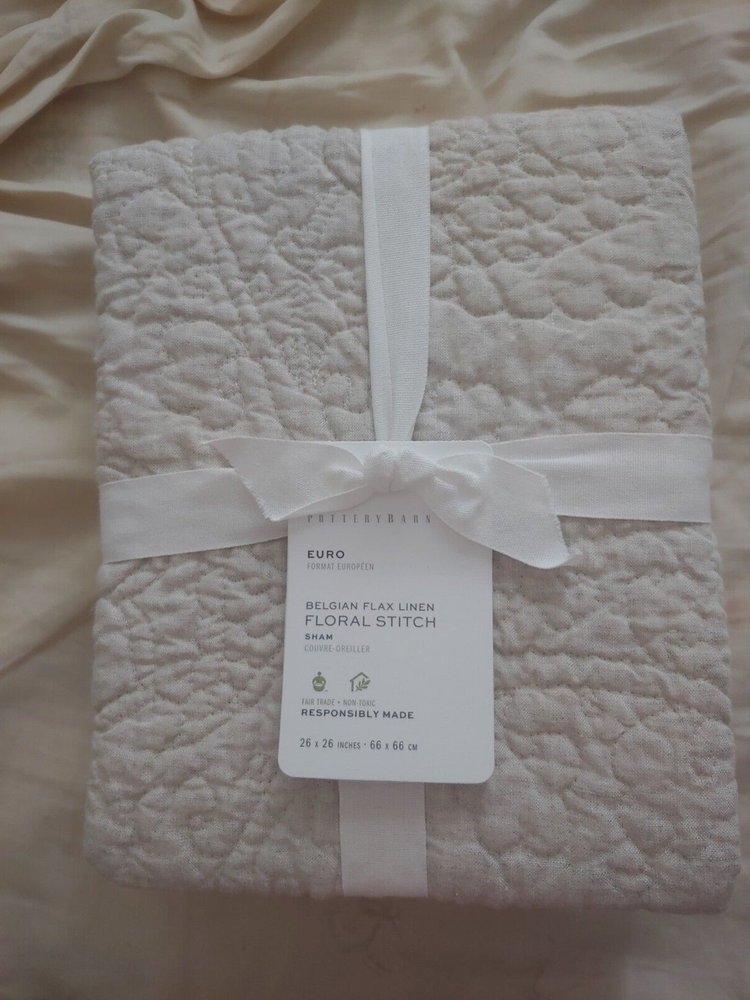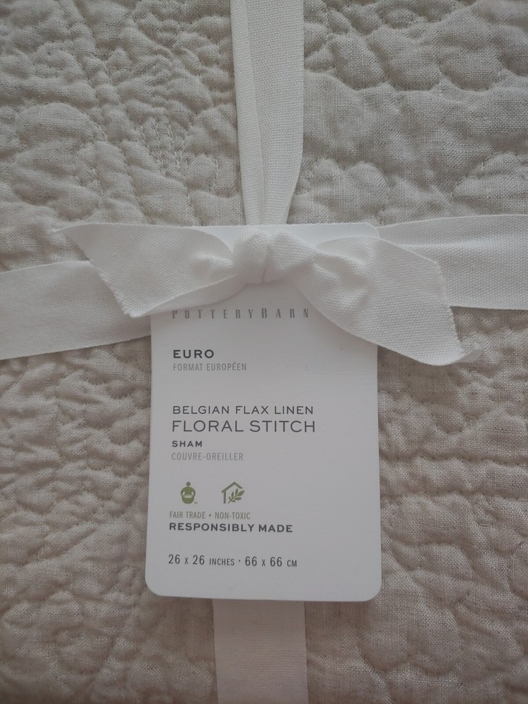 new never used/tested. pottery barn exclusive. Belgian Flax Linen Floral Stitch Quilted sham 1 euro sham only shipping fee: 1pc= 6.99, each additional pc= $3.00 fixed price. serious bidder only please buyer must pay. color: flax (natural) 1 euro shams : original $79.50 Euro Sham: 26" sq DETAILS YOU'LL APPRECIATE Linen woven from 100% Belgian flax; reverse is 65% linen and 35% cotton blend