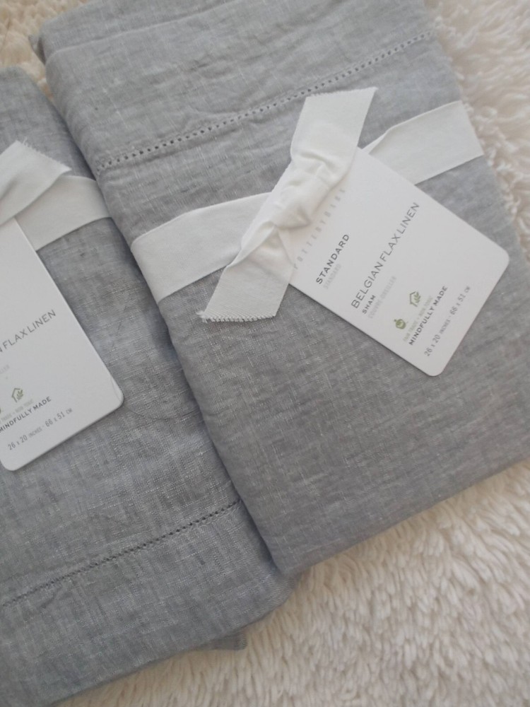 new never used or tested. pottery barn exclusive. 2 standard sham only fixed price. serious bidder only please buyer must pay. color: flagstone 2 standard shams : original $129 Standard: 20" high x 26" wide Flange: 2" wide DETAILS YOU'LL APPRECIATE Made of 100% Belgian flax. Microscopic breaks in the fabric provide a light massaging affect, and high absorbency meaning they'll always feel fresh and cool.