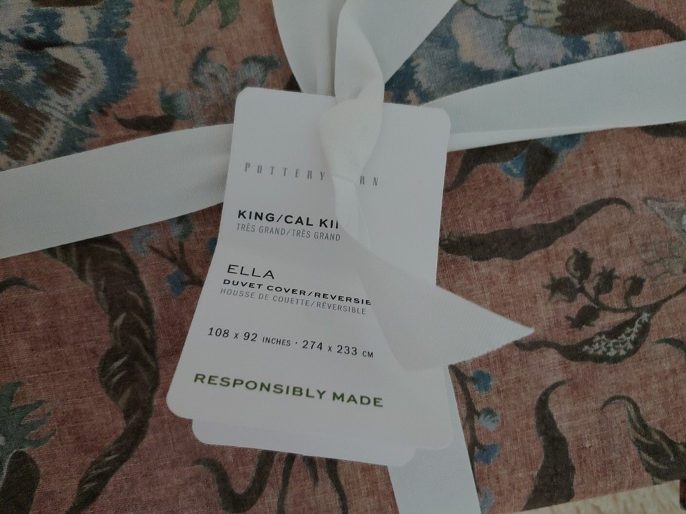 new never used pottery barn exclusive original price $189 at pottery barn store now fixed price. i don't accept any offer. DIMENSIONS Duvet King/Cal. King: 92" l x 108" w one KING/CAL. KING size duvet only Drawing inspiration from vintage kalamkari, the art of Indian block printing, we've reimagined tradition in a fresh, modern way. Our design features calming hues of blush and blue to soften your space. A repeating floral pattern on the back gives this bedding two-in-one versatility. Construction Made from 65% cotton and 35% linen. Reverses to same. Duvet features a zipper closure with inner ties that keep insert in place OEKO-TEX® STANDARD 100: tested for 1000+ harmful substances. 14.HUS.42449 HOHENSTEIN HTTI. Imported. Care Machine wash in cold water separately on gentle cycle. Use only non-chlorine bleach, if needed. Tumble dry on a low; remove promptly. Warm iron as needed. Dimensions King/Cal. King Duvet: 92" h x 108" w serious bidder only please.