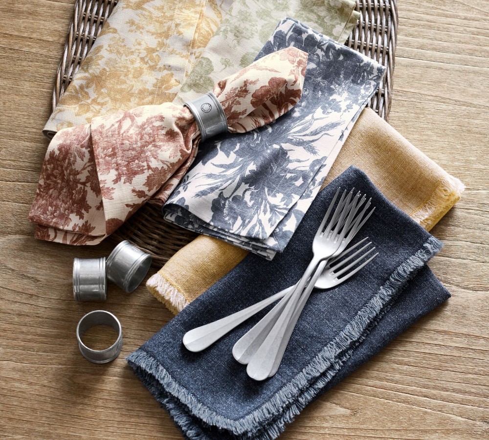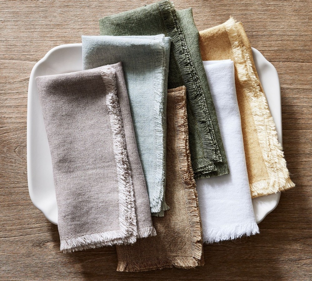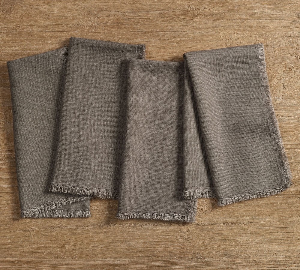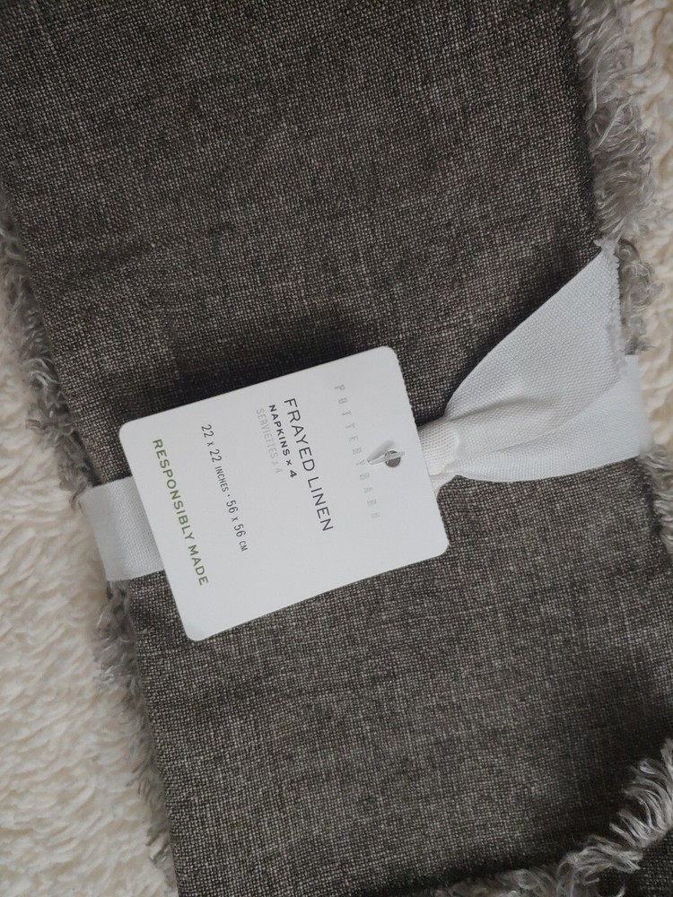 pottery barn exclusive brand new set of 4 original $56 color: mocha DIMENSIONS Overall (4): 22" sq Fringe: 0.5" CARE AND MAINTENANCE Machine wash warm water, gentle cycle. Use only non-chlorine bleach, if needed. Tumble dry on low heat; remove promptly. Warm iron, as needed. The relaxed, cozy look of linen makes any spread feel like a home-cooked meal (even if it’s not). We designed our napkins for just that then added a frayed detail as the finishing textural touch. In a range of cool neutrals, they match just about any dinnerware. The best part? They will continue to get softer and more lived-in with every wash. Woven of 100% linen. Yarn-dyed fiber has incredibly rich color that holds its vibrancy over time. STANDARD 100 by OEKO-TEX® Certified: tested for 350+ harmful substances to keep you and your family safe from chemicals common to textile manufacturing. Set of 4. Imported.