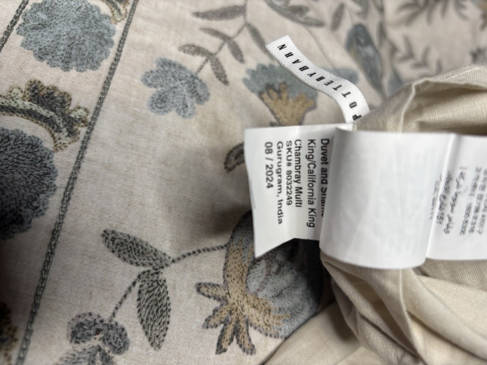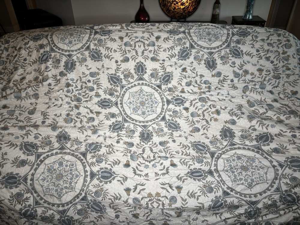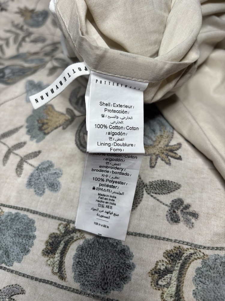 pottery barn Lilah Duvet cover King /Cal King Defect is: In 2 different spots there is discolorations on the duvet that appear is from the manufacturer. See photos. It’s hard to see without zooming in. Attempted to spot clean but unable to remove so that’s why I believe it’s a manufacturing flaw/defect. But in otherwise perfect condition! Smoke & pet free
