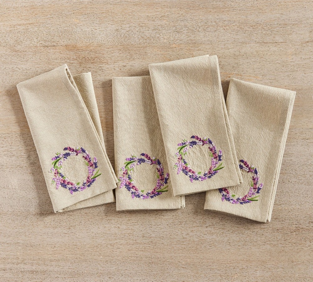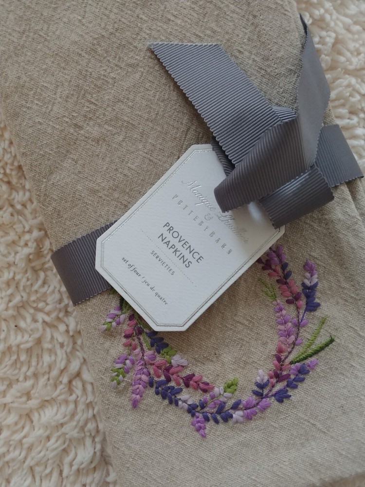 pottery barn exclusive brand new original $56 shipping fee : 1set= 4pc= $5.99,each additional set $3.00 i don't accept return/ offer. Adorned in lavender, these napkins are reminiscent of the relaxed elegance of outdoor dining in Provence. Fresh shades of purple and green bring a touch of nature to the table. Designed in collaboration with fashion designer Monique Lhuillier. PRODUCT DETAIL CONSTRUCTION Made of 100% cotton. Set of 4. By choosing our cotton products, you’re supporting our investment in Better Cotton’s mission. This product is sourced via mass balance and therefore may not contain Better Cotton. Overall: 20" sq Hem: 1" CARE Machine wash in warm water; gentle cycle. Use only non-chlorine bleach, if needed. Tumble dry on low heat. Warm iron as needed.