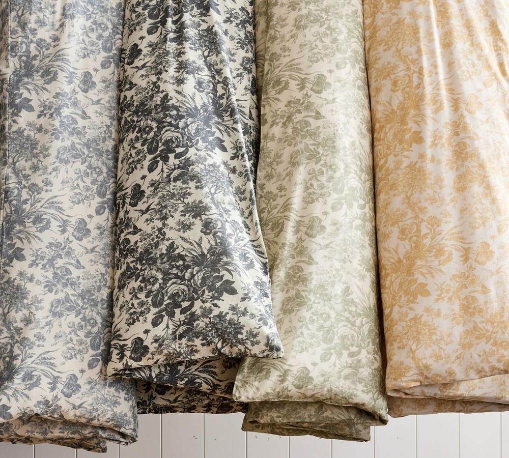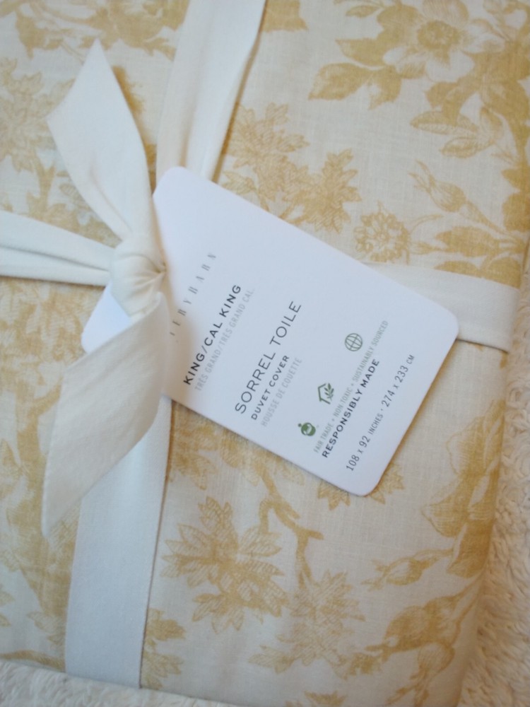 new never used pottery barn exclusive original price $189 at pottery barn store now fixed price. i don't accept any offer. one King/Cal King duvet only color: HARVEST GOLD Duvet King/Cal King: 92" l x 108" w Sorrel is a classically beautiful choice for the bed. In traditional toile style, the pattern features a mix of flora and fauna that layers effortlessly. Crafted from slubbed cotton with subtle texture, it comes in a range of beautiful colors, too. Made of 100% cotton. Reverses to same. Duvet features a hidden button closure with inner ties to keep insert in place. Machine wash. Imported.