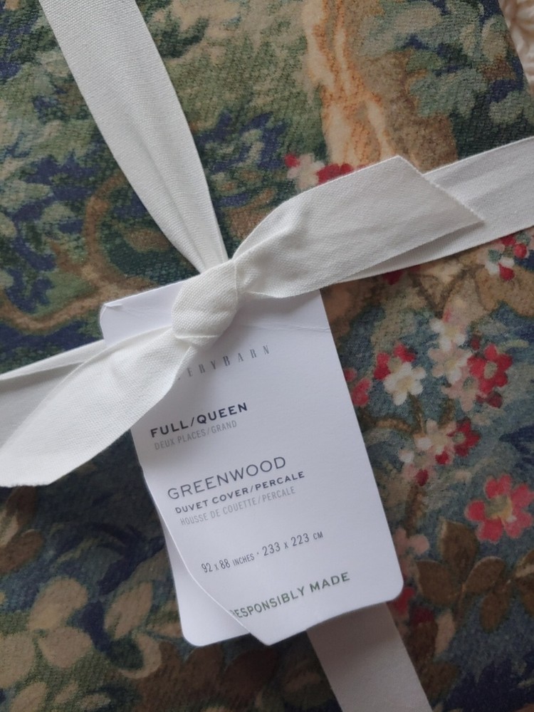 new never used pottery barn exclusive original price $159 at pottery barn store now fixed price. i don't accept any offer. DIMENSIONS Full/Queen Duvet: 88" l x 92" w one Full/Queen size duvet only Details 75% organic cotton and 25% cotton.