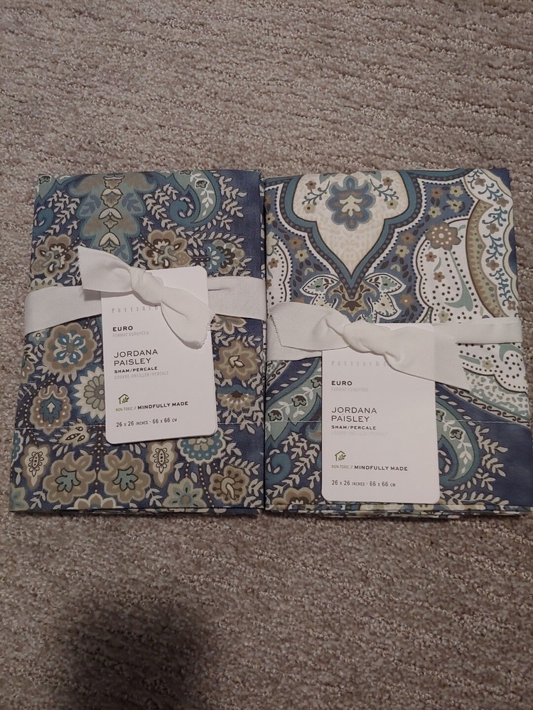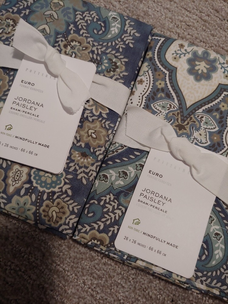 pottery barn exclusive brand new in tag original $90 2 euro sham only color: blue serious bidder only please buyer must pay. i don't accept any offer. Euro: 26" sq Flange: 2" The lush allover pattern on our Jordana Sham adds an elegant layer to the bed. Woven of soft cotton, it’s smooth and firm, and also cool to the touch, making it an ideal layer on warmer nights. Made of 100% cotton percale.