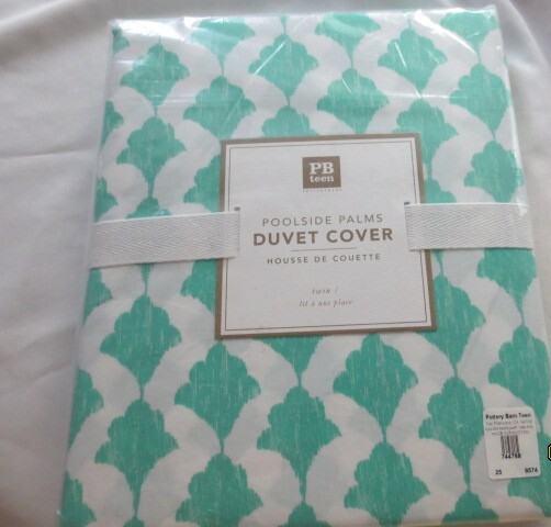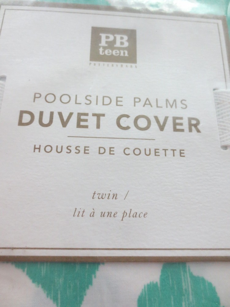all new with tags ready for a summer refresh poolside palms twin duvet cover in aqua and white plain white puffy coccoon standard pillow sham white with aqua trim EURO pillow sham dorm or beach house ready from smoke and pet-free home