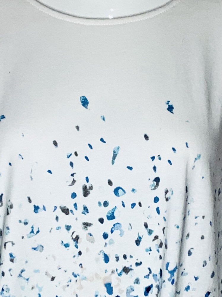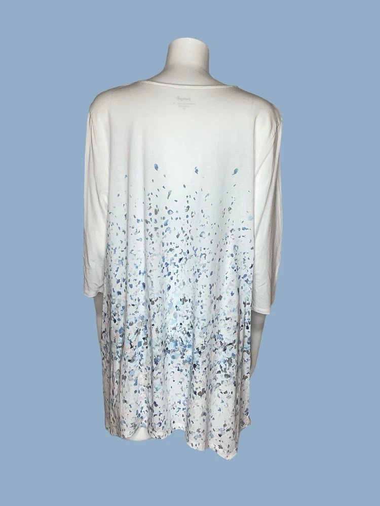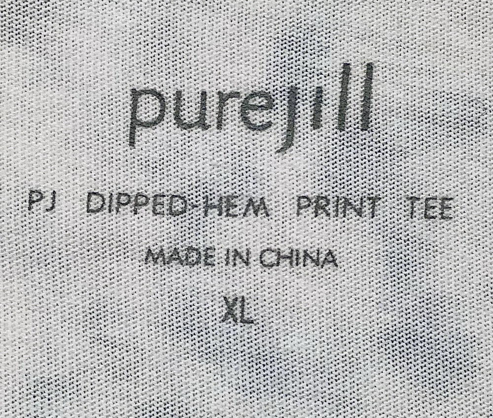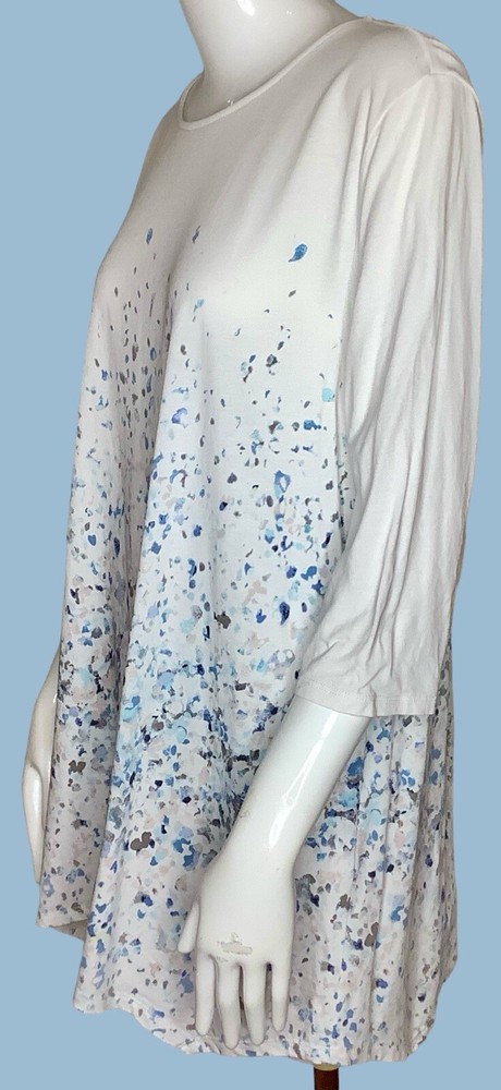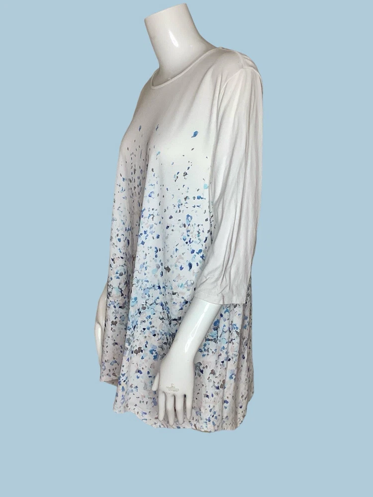 This purejill women's t-shirt features an abstract dipped-hem print in white, blue, and gray. The 3/4 sleeve tunic has a round neckline and pullover closure, making it perfect for travel and casual occasions. The lightweight and breathable material is a blend of 60% cotton and 40% modal rayon, making it easy to care for and packable for all seasons. The t-shirt is a size XL and has a regular fit. It is collarless and unlined, with no vintage elements. The garment care is machine washable, and it is suitable for both winter and summer seasons. Made in China, this t-shirt is a great addition to any wardrobe. Excellent Condition No Defects or Flaws Freshly Laundered and Sanitized SMOKE FREE ENVIRONMENT Measures 22” From Armpit to Armpit Measures 31” From Shoulder to Longest Point on Hem ***MEASUREMENTS ARE APPROXIMATIONS*** MANUFACTURES SIZES VARY. BUYER IS RESPONSIBLE FOR CORRECT FIT ***The color can vary slightly from the picture*** PLEASE view all pictures, check all measurements and take time to read and understand the entire listing before buying I welcome questions and I am happy to provide additional information and photos for clarification. I do not accept returns for remorse or change of mind returns. If you are happy with your item, please leave feedback for me and I will do the same for you. EVERY GARMENT THAT I SELL HAS BEEN WASHED AND SANITIZED. THANK YOU!! #60904